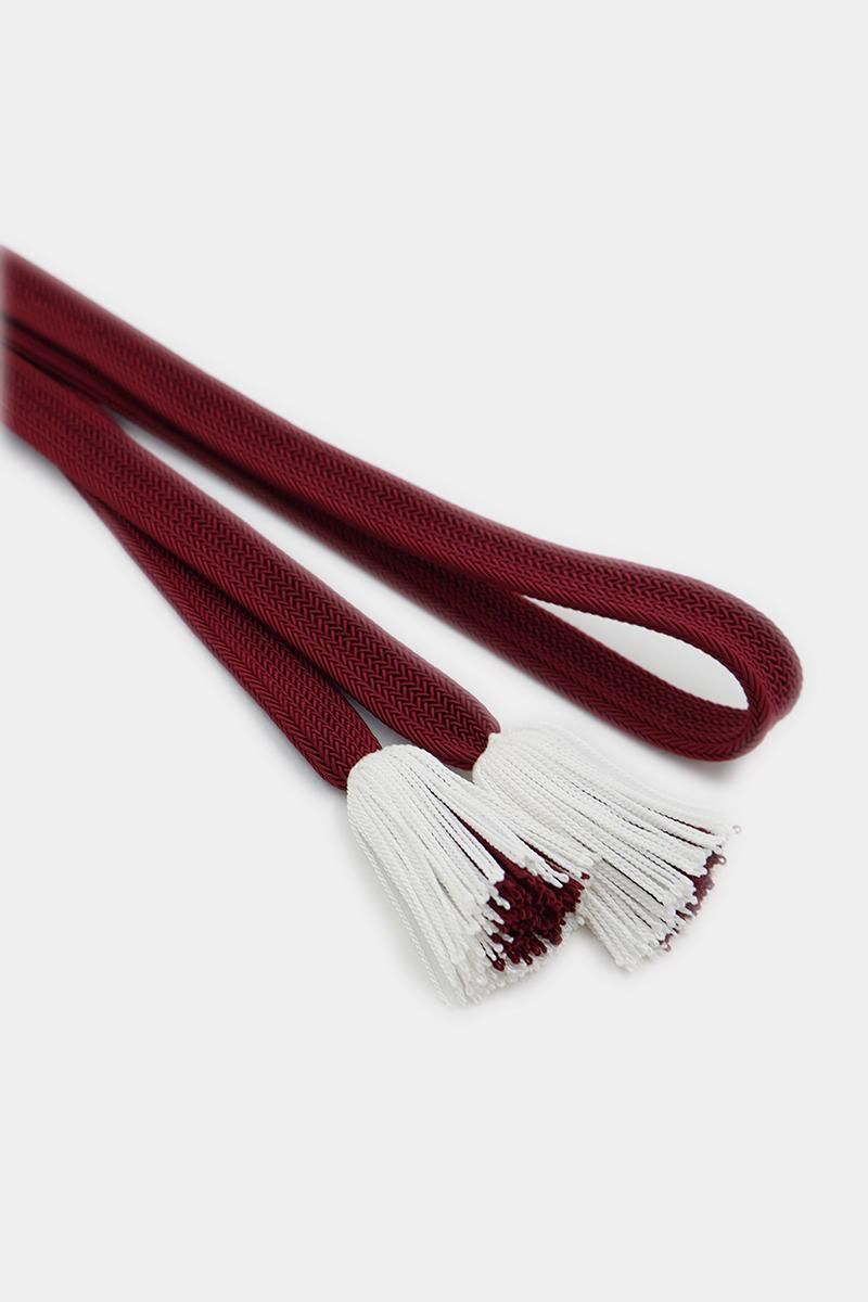 繊細なレースに組み上げた角朝組、中心部分と外側の色が異なる菊の花のような撚房の帯締めです。こちらは深い紅色に、房の外側にオフホワイトの糸を使ったお品、程良いしっかりとした組みでレースのような透かしが涼やかな印象を備えていますね。透け感は控えめですので、単衣の時期から盛夏まで重宝にお使いいただけます。角朝組ならではのキュッとした締め心地をお楽しみくださいませ。