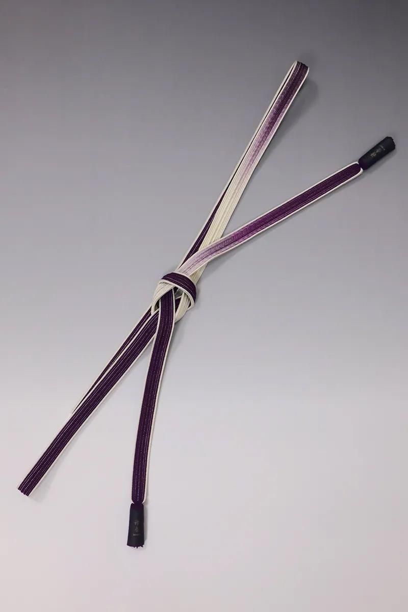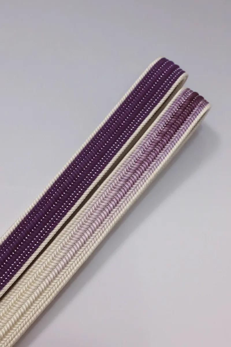 半衿や帯締めなど、きものまわりの小物の老舗として定評ある京都・衿秀製の帯締めです。こちらは深い紫色と深いアイボリーのグラデーションをアイボリーの糸で縁取った綾竹組のお品、お色目を抑え落ち着いた印象のこちら、装いに凛とした上品さをプラスしてくれそうですね。金糸等は入っておりませんが程良いボリュームがありますので、袋帯に合わせて頂いても美しく映えることと思います。しなやかで安定感のある締め心地の良さに加え、衿秀さんの房はからまったり縮れてしまったりの心配のない撚り房ですので、保管の際も安心ですね。この機会にぜひ、お手元にてご覧下さいませ。