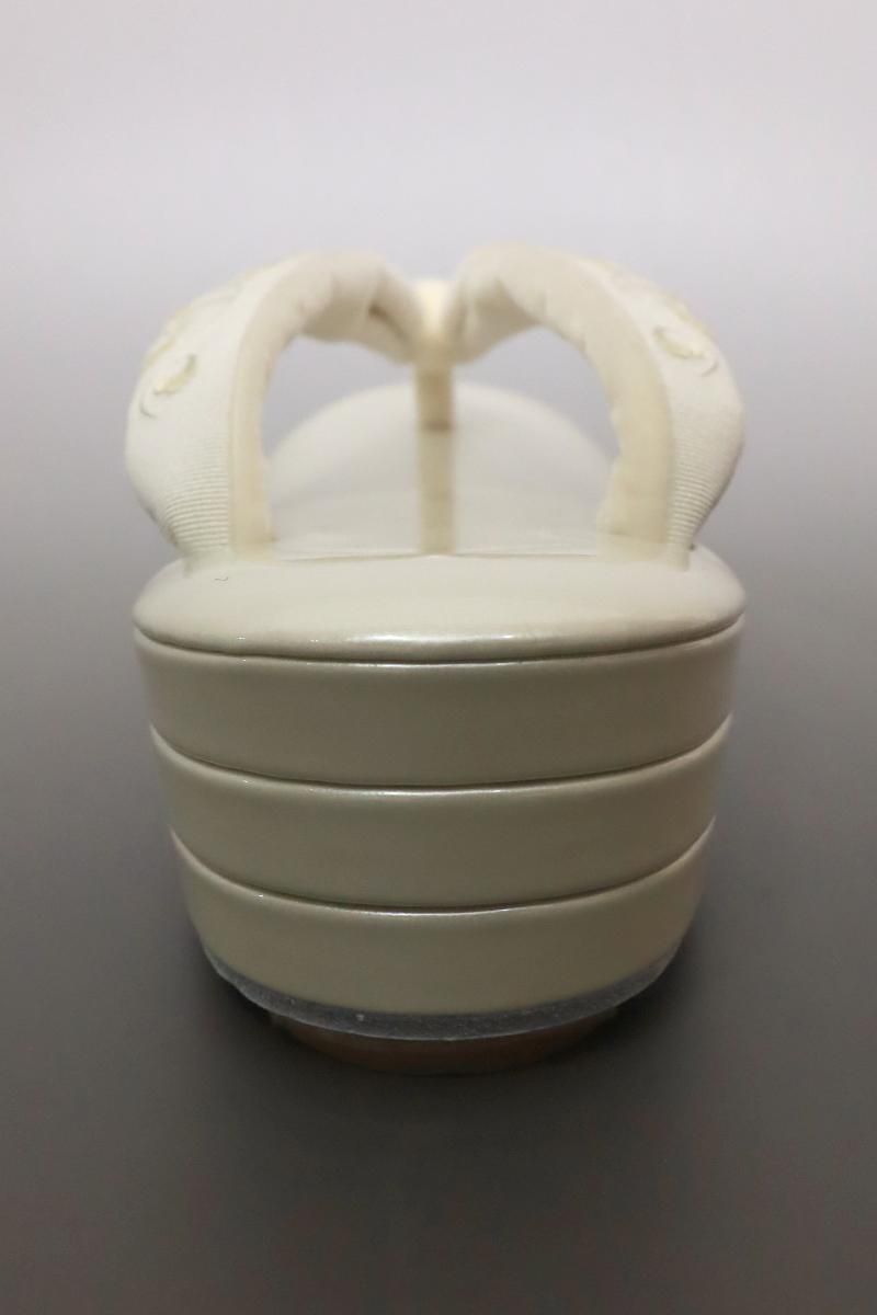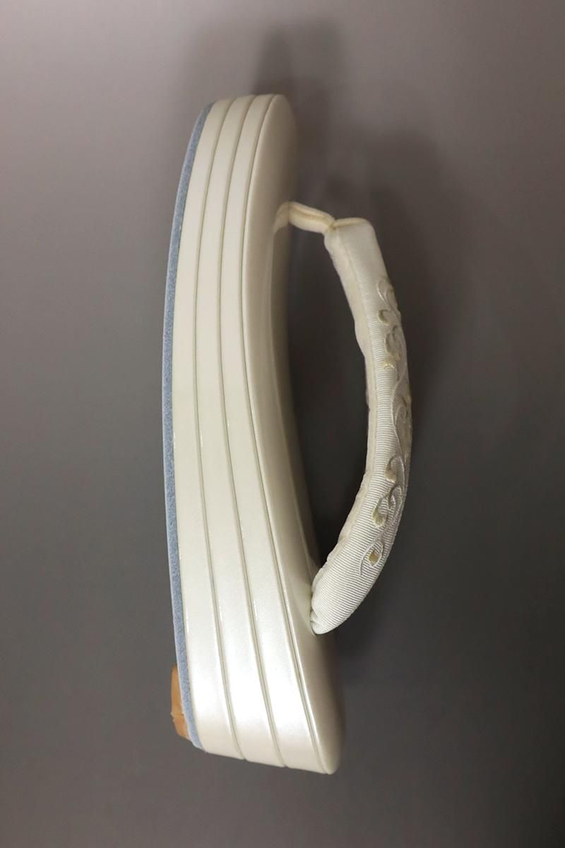 こちらは淡いシャンパンゴールドのエナメル台と、オフホワイト地に唐草文の刺繍が入った鼻緒でお色味を抑えた一品、着物や帯を引き立てながら、コーディネートに華やかさと上品さを添えてくれることと思います。柔らかな足あたりの巾広の鼻緒と、ふっくらと綿を詰めた台は足に馴染みやすく、疲れにくくなっています。訪問着などの改まった装いに重宝しそうですね。この機会にぜひお手にとってご覧下さいませ。