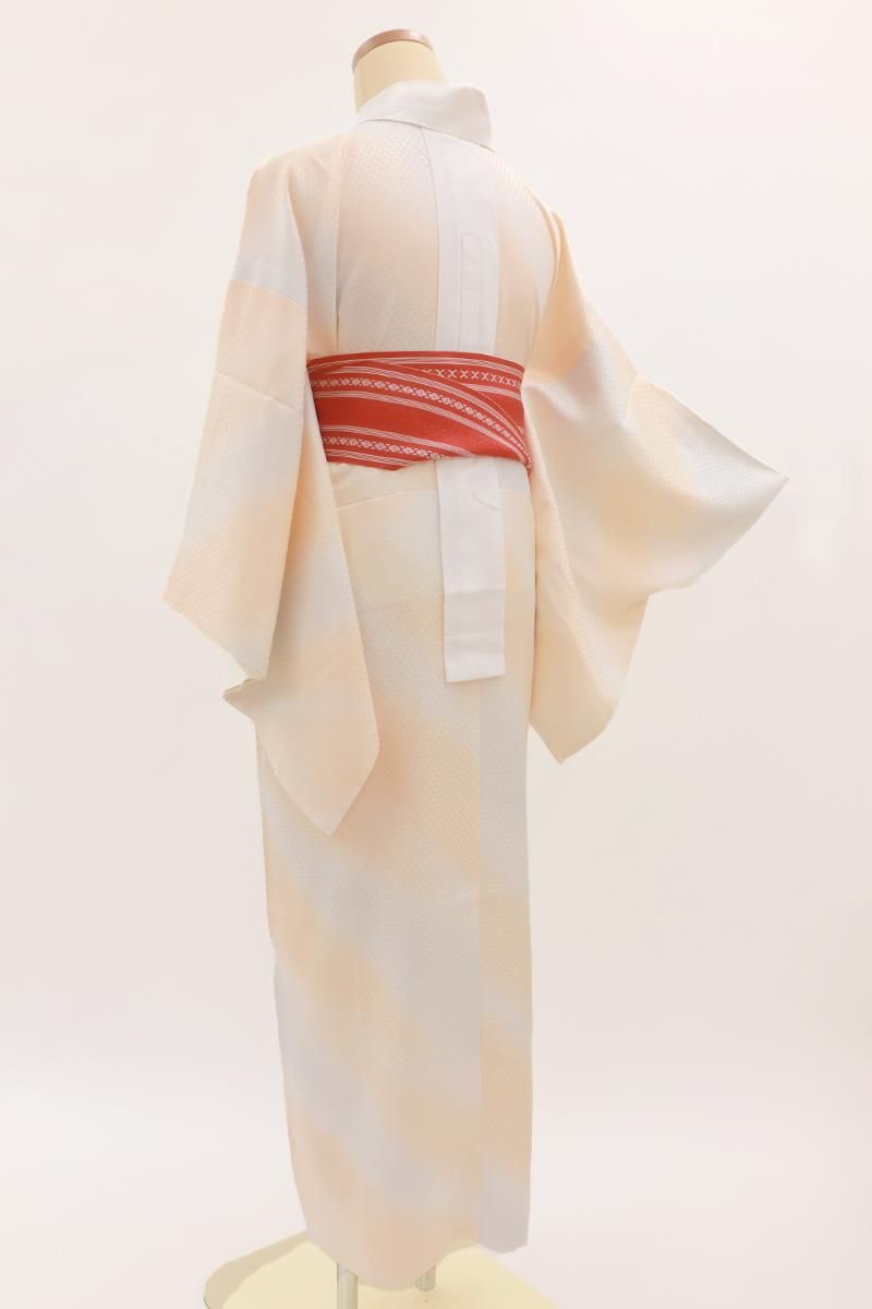 淡いオレンジ色の地に、斜めに白の暈かしがふんわりと配された袖無双の長襦袢です。