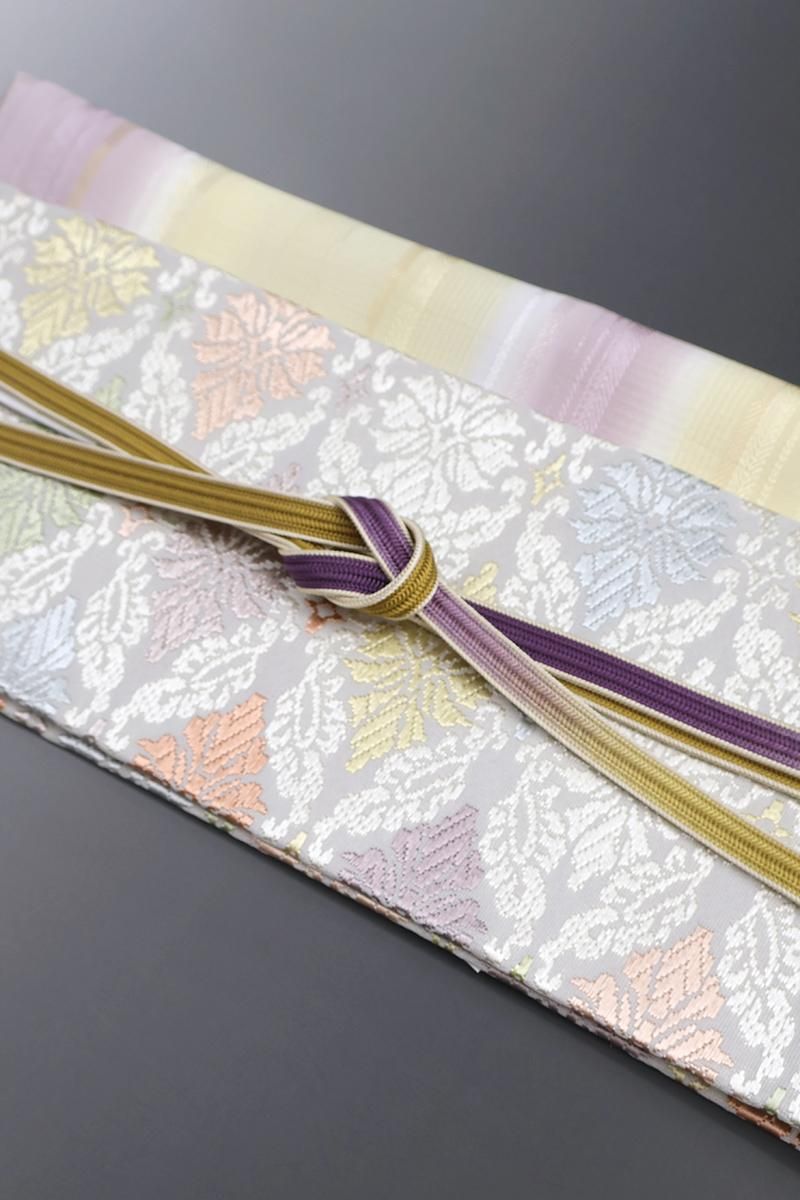 こちらは金糸・銀糸を用いた繊細な織りで幾何文に段暈かしを配したお品。胸元からちらりと覗く煌めきが、装いに一層の格調を添えてくれますね。落ち着いたブルーグレーをベースに、灰みのピンクと柔らかな黄色がアクセントとなる一枚。どなたにも好感度の高い洗練された彩りが、装いを上品にまとめてくれることと思います。お出かけや改まったお席の装いにいかがでしょうか。
