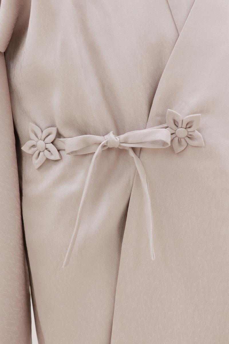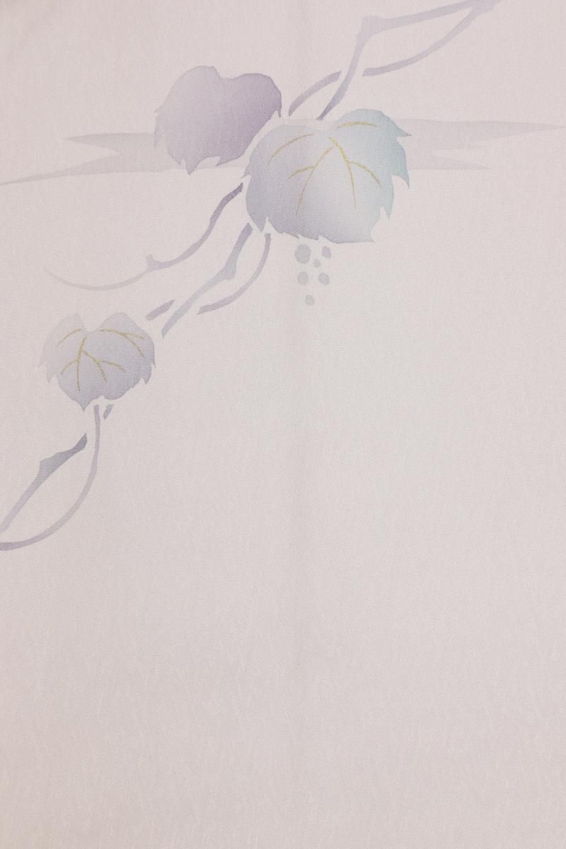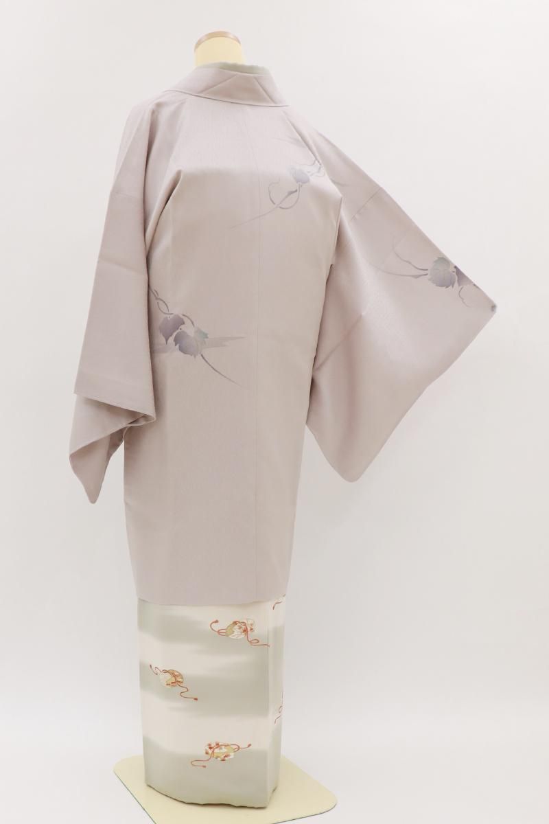 少し明度を上げた桜鼠色が近いでしょうか、ピンクみを含んだグレーベージュの地に右肩から左後ろ身頃にかけて蔦の図をさらりと染めた道中着です。
