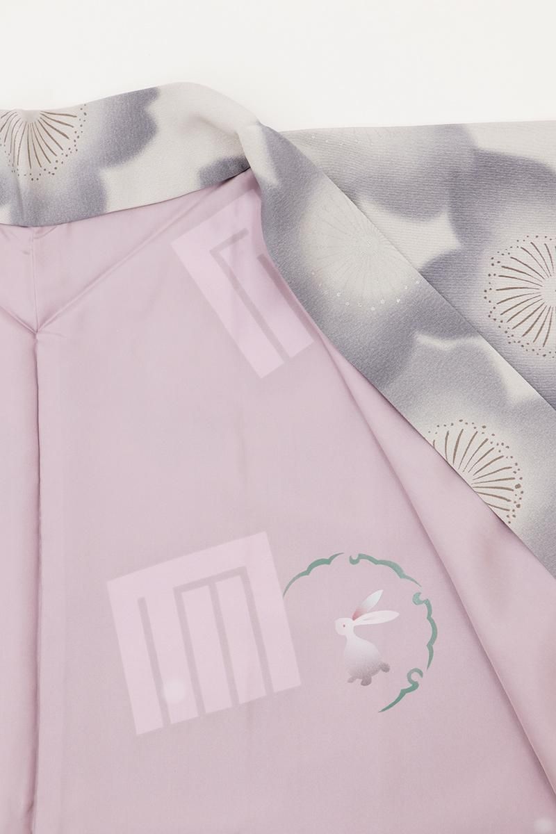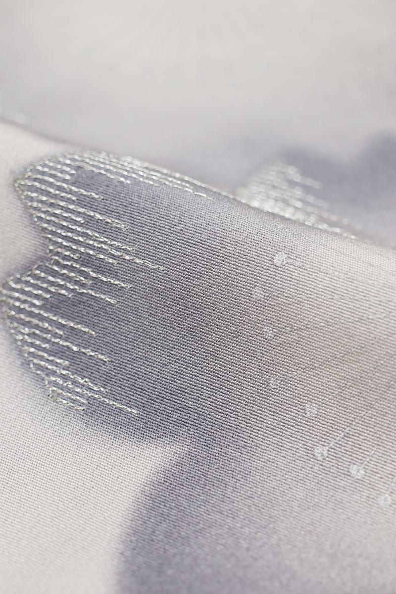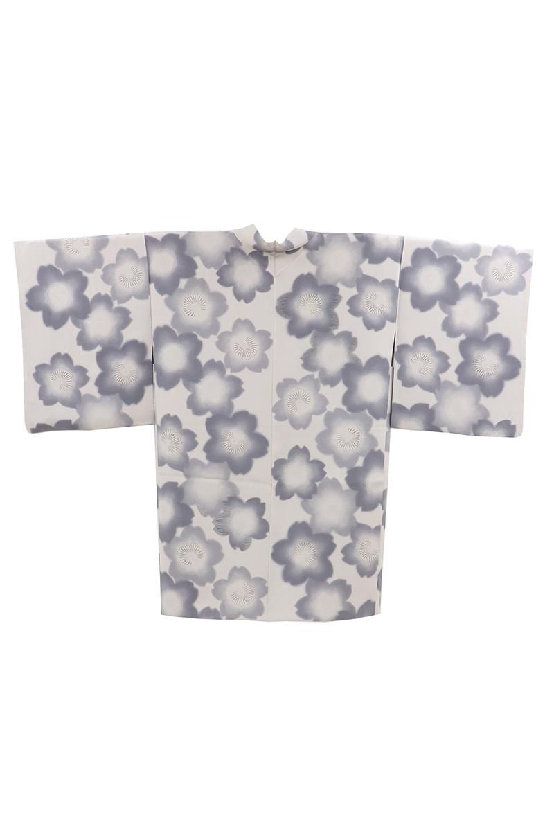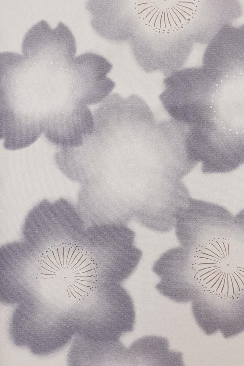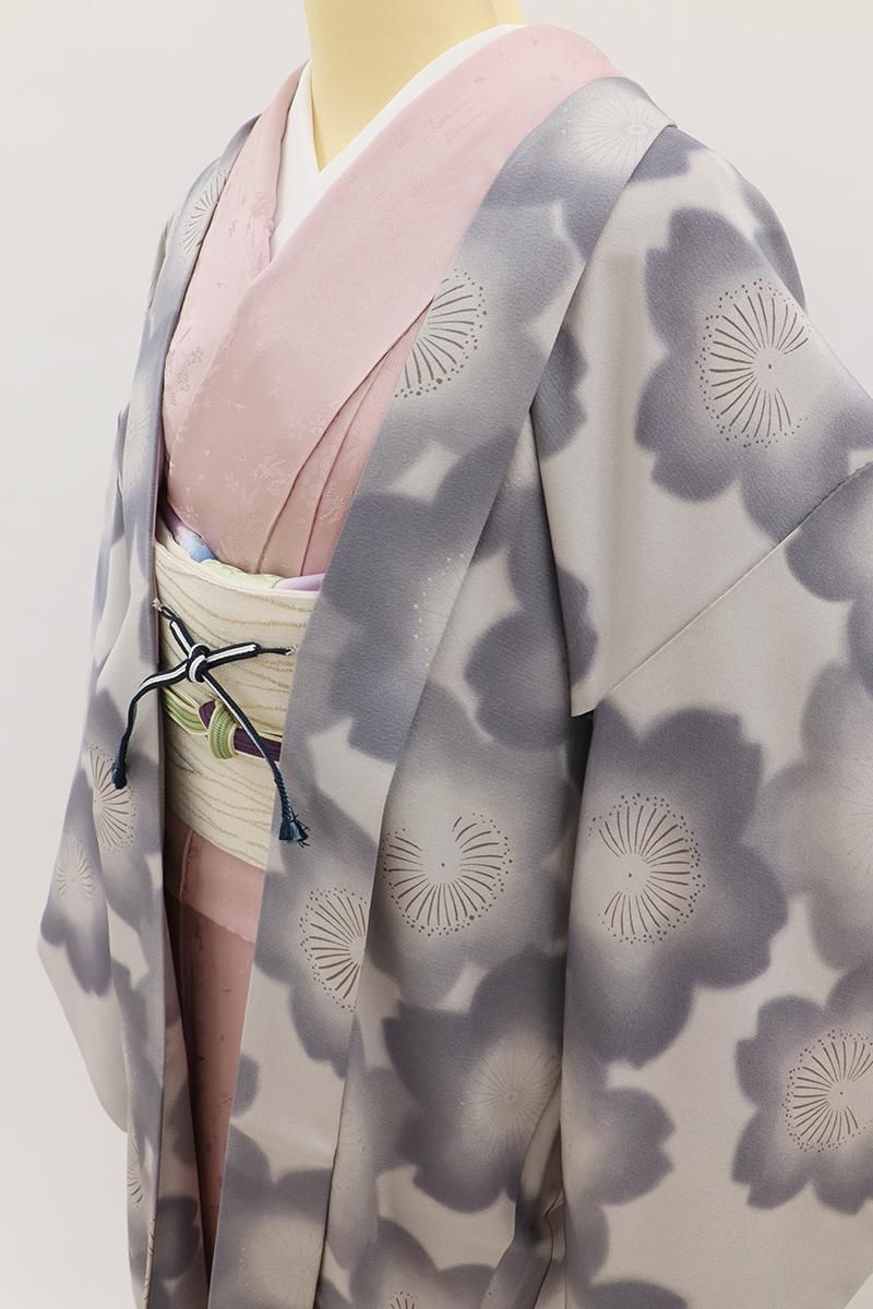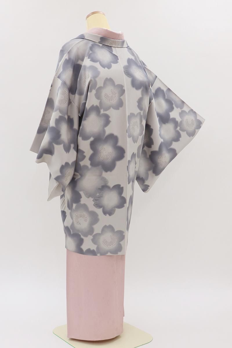 鳩羽鼠色をごく淡くしたお色が近いでしょうか、紫を感じる淡いグレーのしなやかな地に、おおらかな桜を描いた羽織です。やわらかな輪郭で表現されたモチーフが優しげな雰囲気のお品、女性らしい着姿を演出してくれそうですね。銀彩で描かれたおしべとめしべは光の当たり方でちらちらと煌めき、繊細な華やかさを放っています。防寒対策や着物や帯を護るだけでなく、装いの印象を大きく変える和装コート、これからの季節の外出にいかがでしょうか。