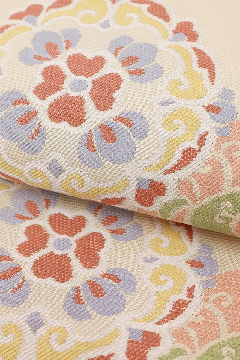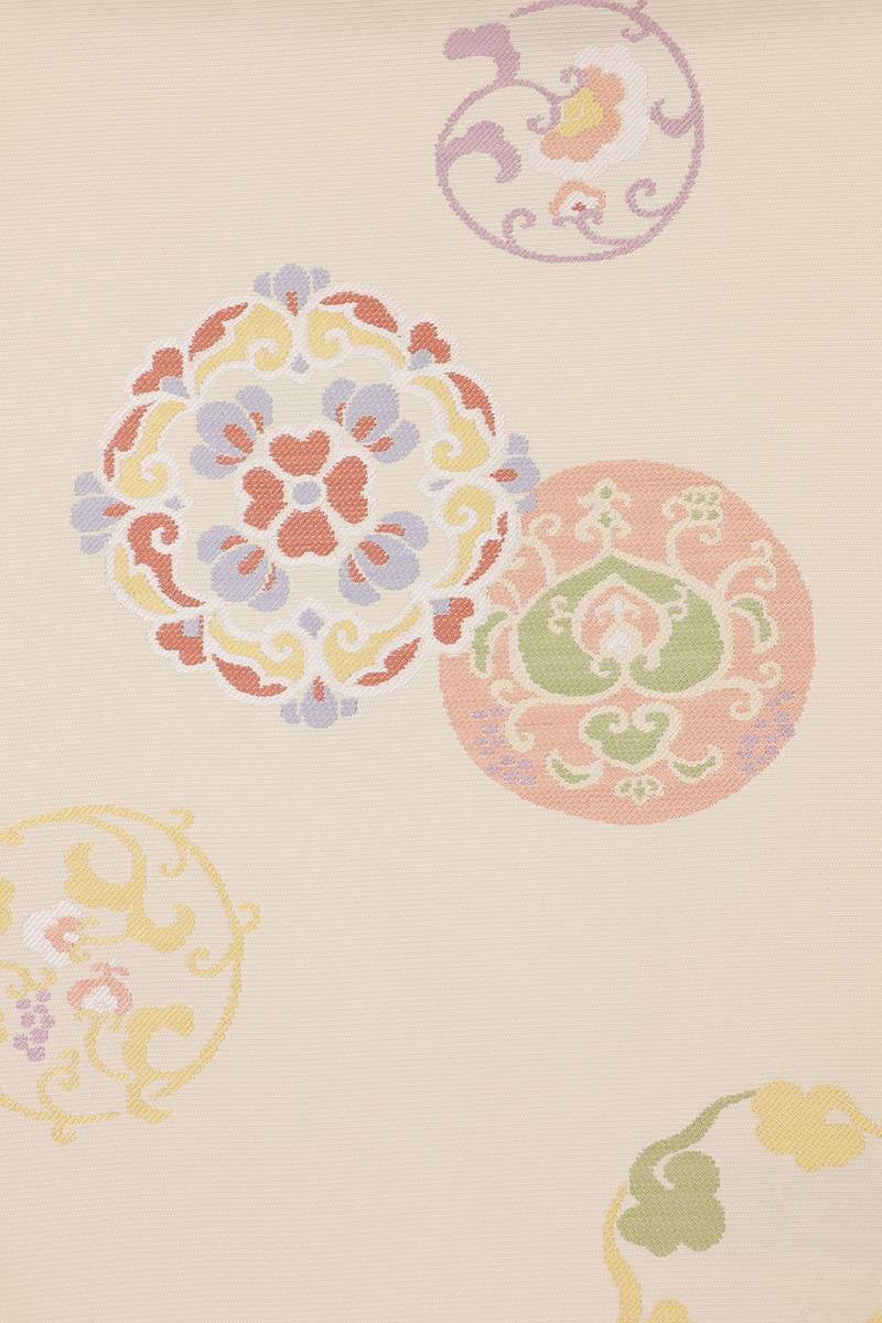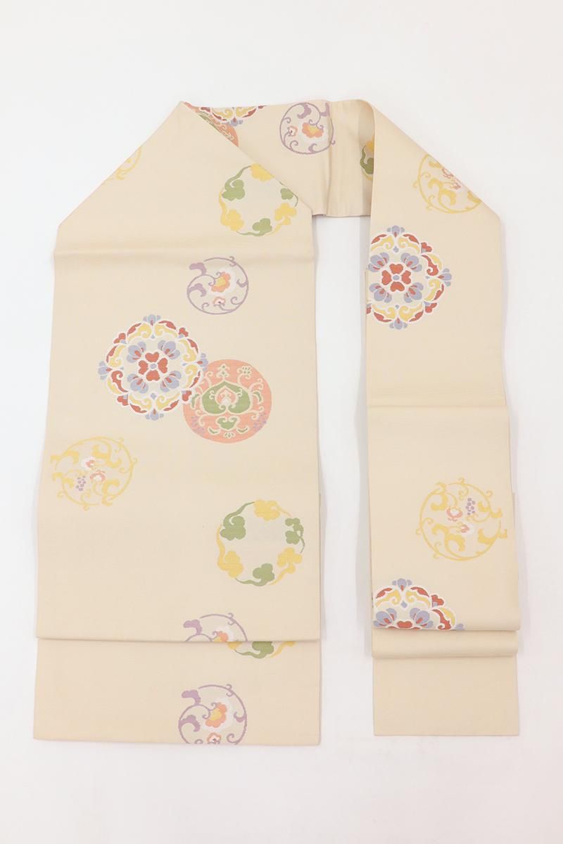 鳥の子色が近いでしょうか、灰みのベージュ系の地に、華文や丸文を織りだした名古屋帯です。