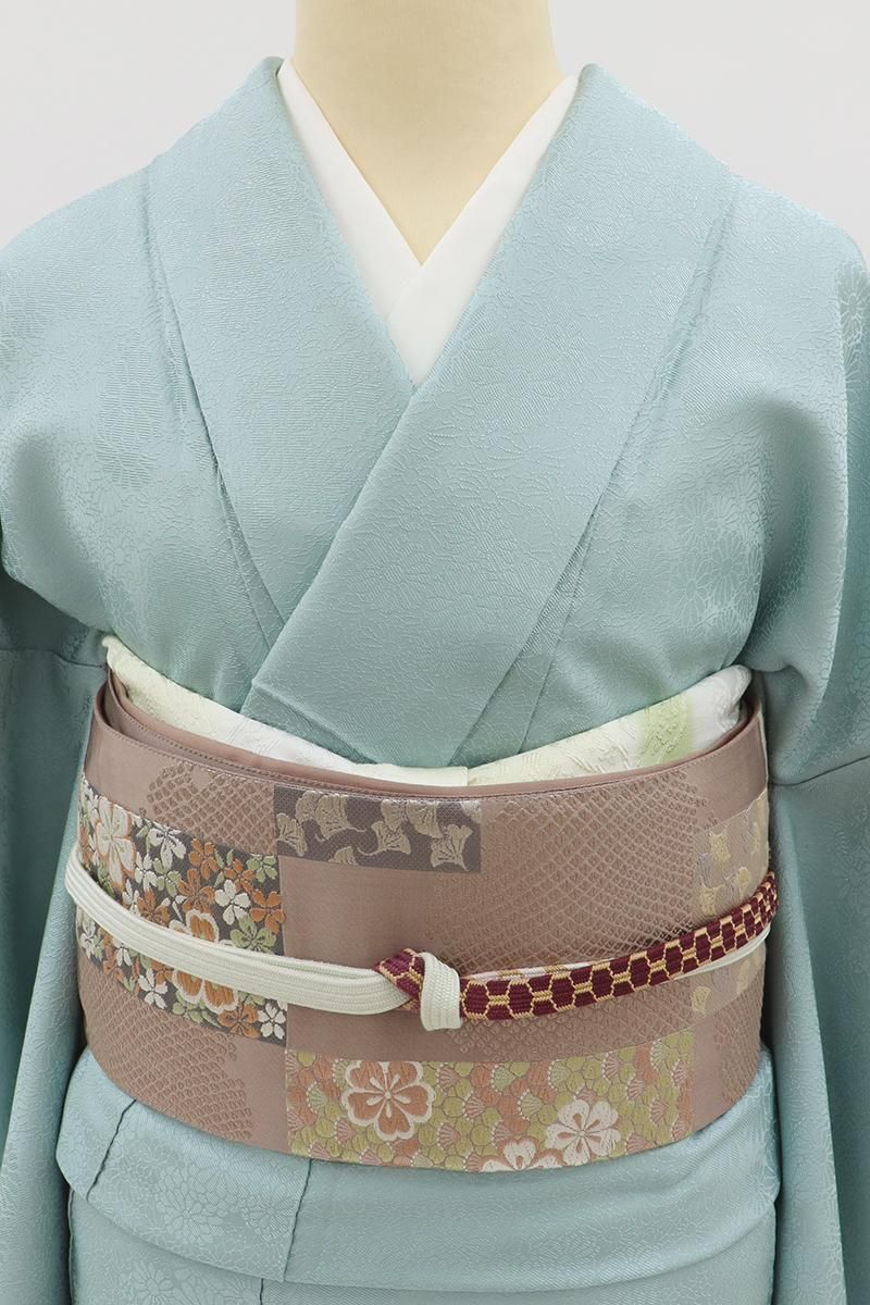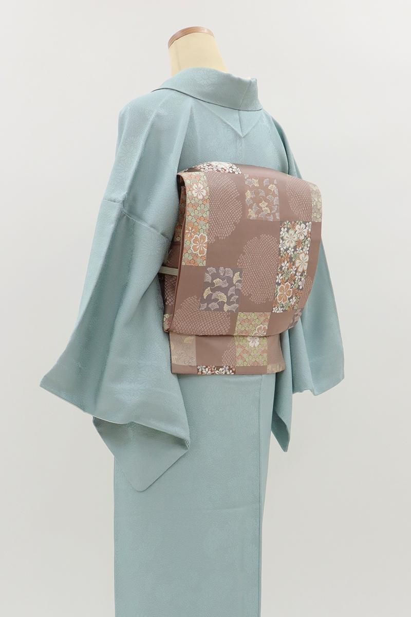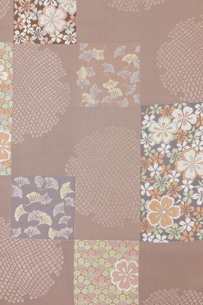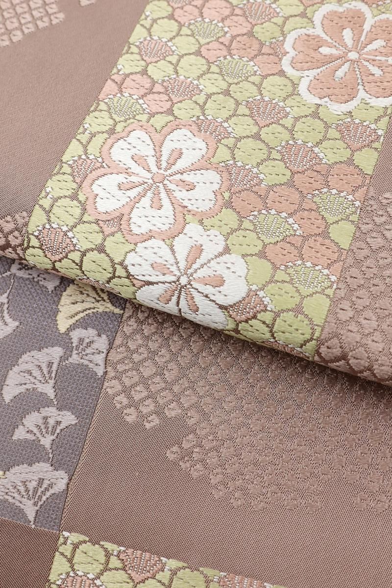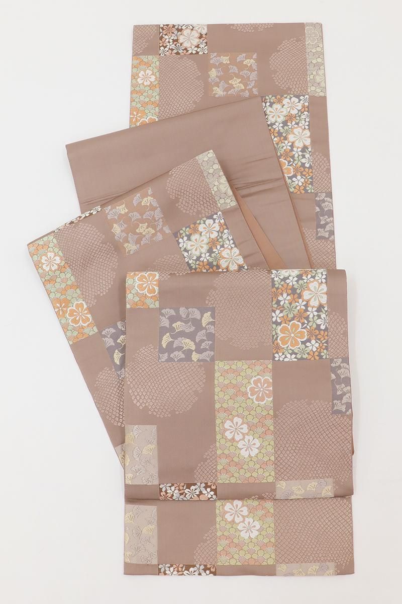 やや色を深めた桜鼠色が近いでしょうか、灰みのピンクベージュ系の地に、雪輪を背景に正方形や長方形のかたちに桜や銀杏の図を詰めた袋帯です。程よく落ち着いた色遣いの風雅な意匠が上品な印象のお品、モダンにも古典的にも合わせるお着物の雰囲気を問わずはんなりと引き立ててくれそうですね。金糸は用いておりませんので、上質感のある小紋から色無地、軽めの付下げまで様々なお着物に合わせてお楽しみ頂けることと思います。お食事会や観劇など、様々な場面にいかがでしょうか。