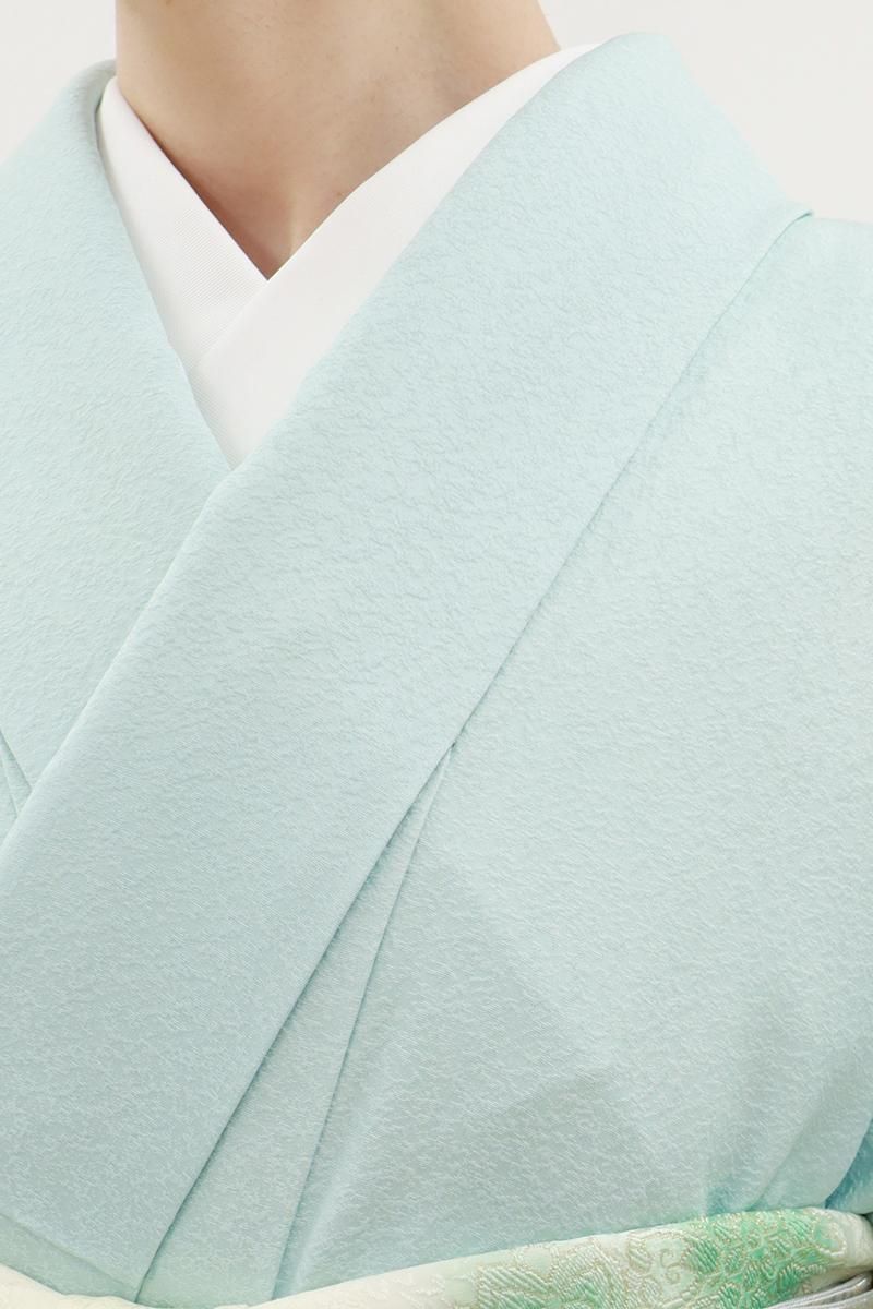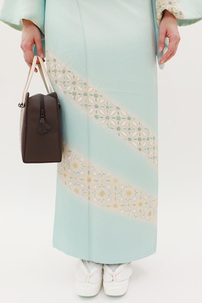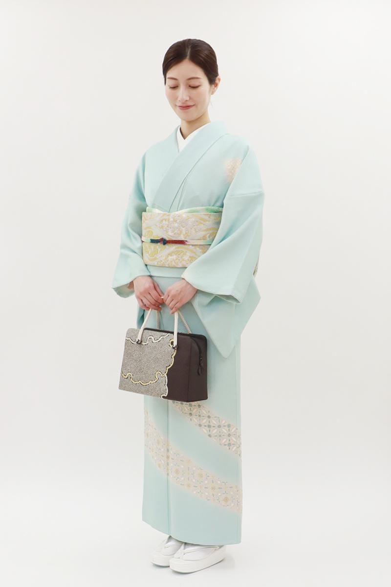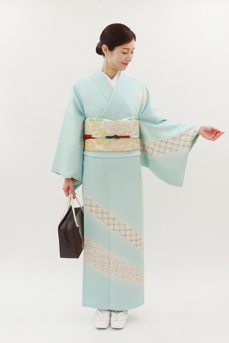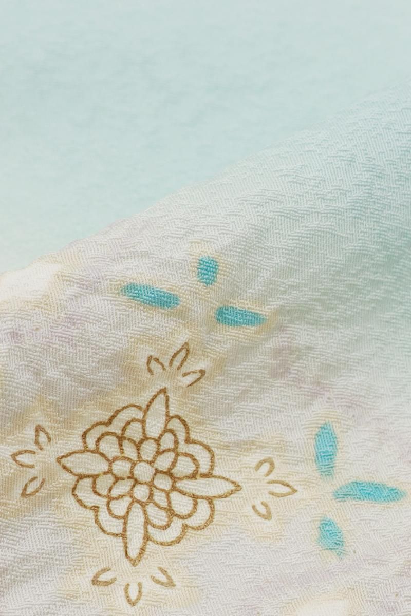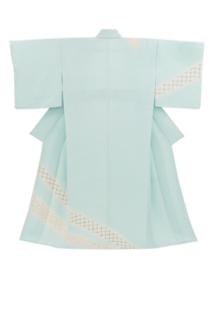 同系の爽やかな彩りで表された意匠に品良い華が香る一枚、すっと斜めに走る絞り染めのふんわりと優しい描線を、金彩がすっきりと引き立てていますね。シンプルな柄置きですので合わせる帯次第で幅広い場面で重宝にお使いいただけることと思います。お茶席などの改まったお席や、式典、観劇などにいかがでしょうか。