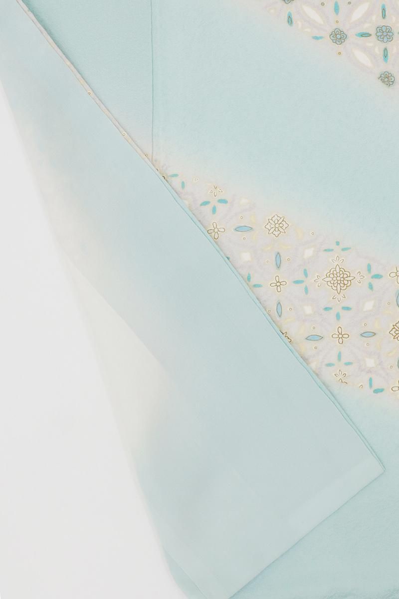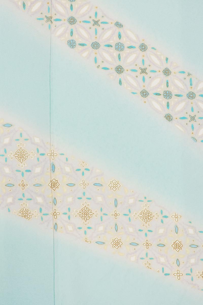 藍白色が近いでしょうか、陰影豊かなニュアンスのある地紋の浮かぶ柔らかな水色の地に、七宝文や華文を絞り染めを用いて染めた付下げです。