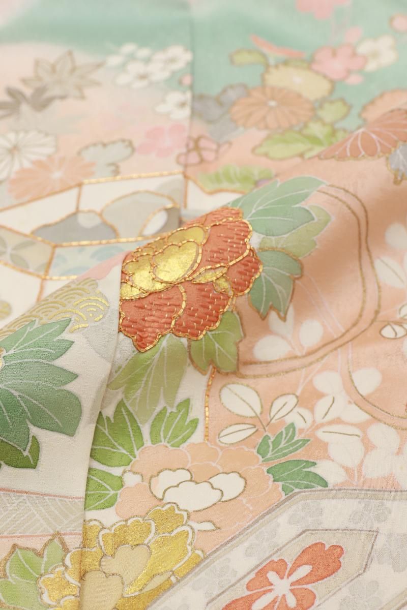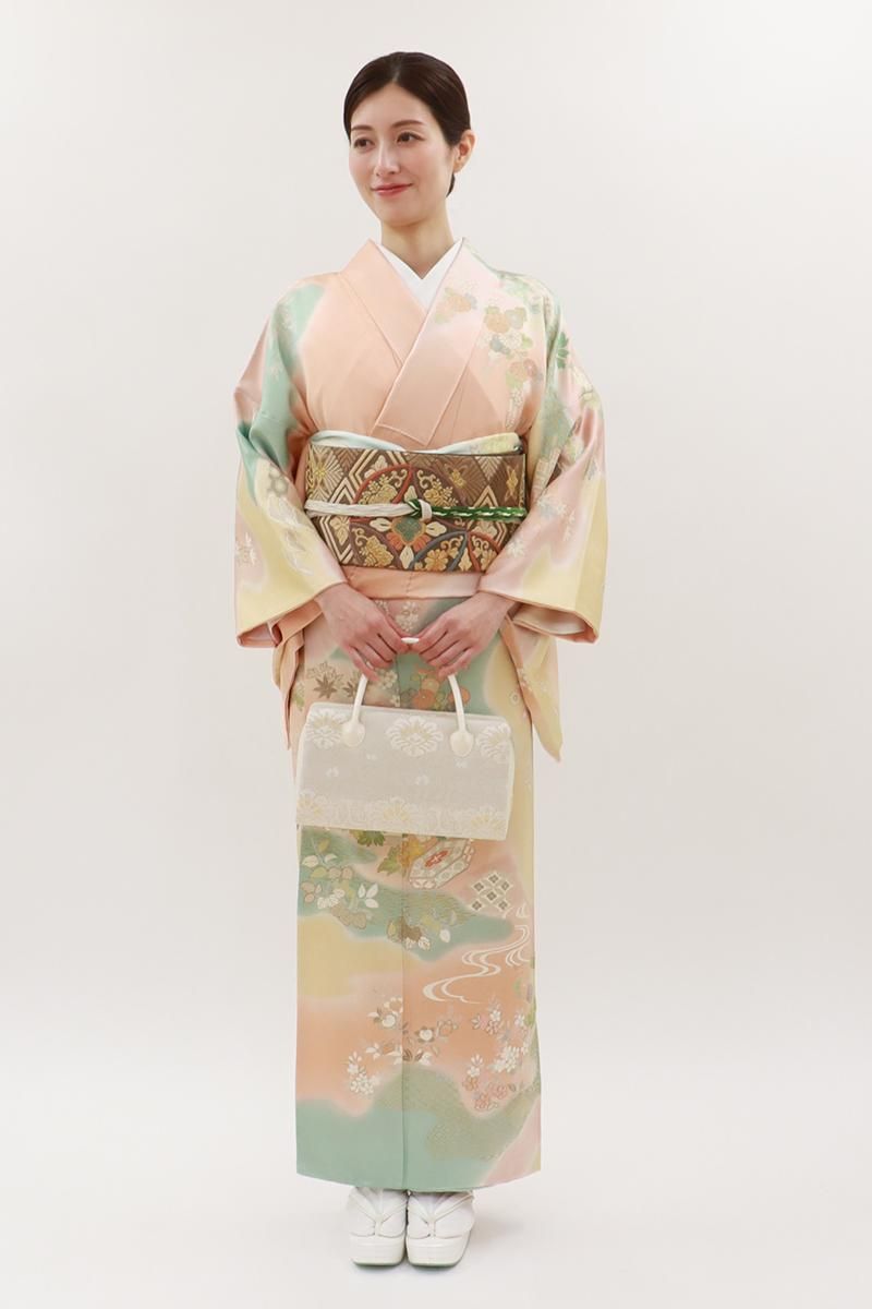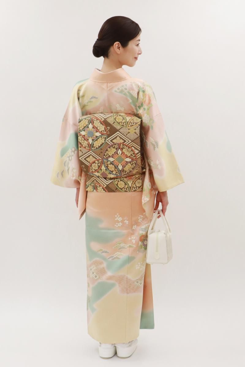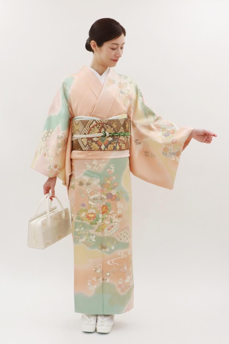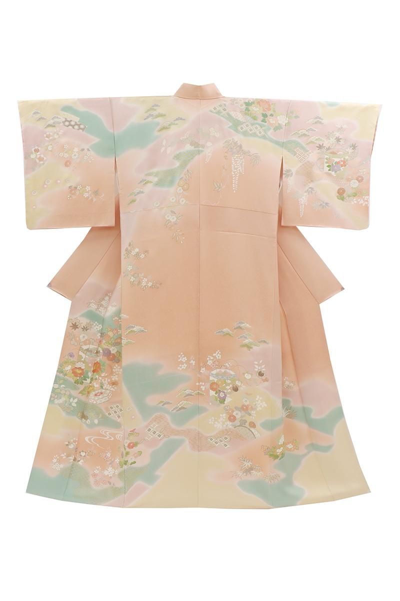全体の印象としてはやや色を深めたシェルピンク色が近いでしょうか、オレンジみを含んだピンク色系の地に、クリーム色や水縹色などで多彩な暈かしを配し、四季折々の花や貝桶文を描いた訪問着です。細やかな唐草の地紋が浮かぶ穏やかな光沢を帯びた地に、はんなりと表現された古典意匠が楚々とした雰囲気のお品、どなたにも好感度の高い上品な趣で着る方を引き立ててくれることと思います。晴れやかなお祝いのお席や式典などにいかがでしょうか。