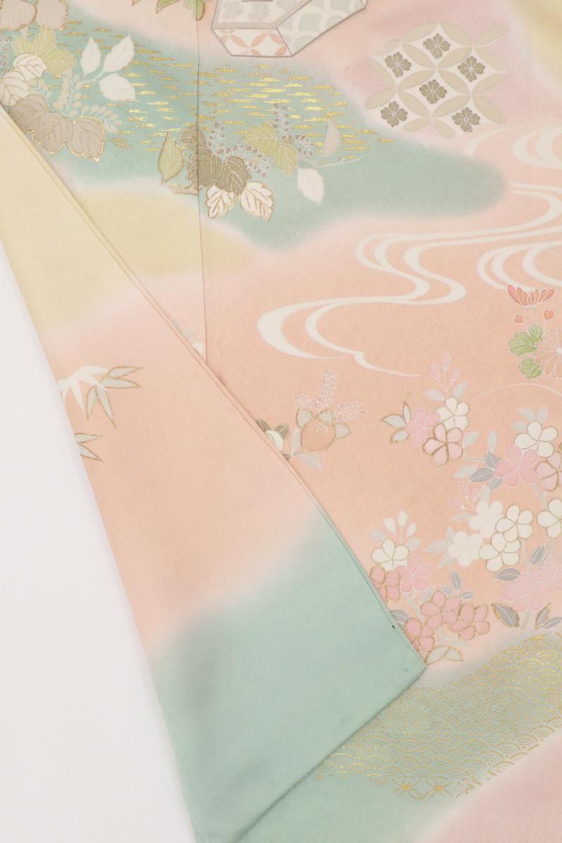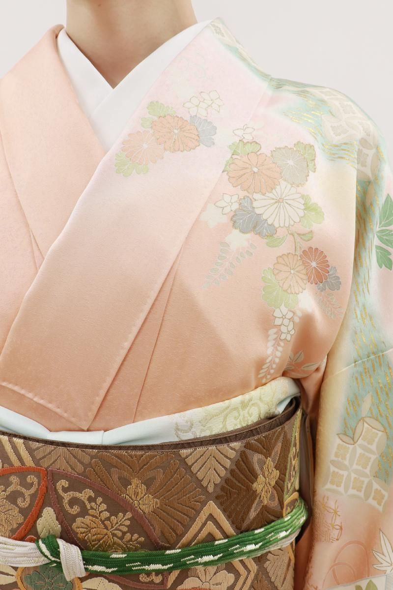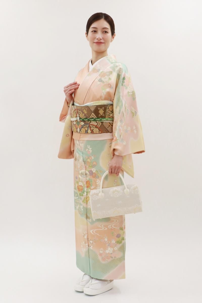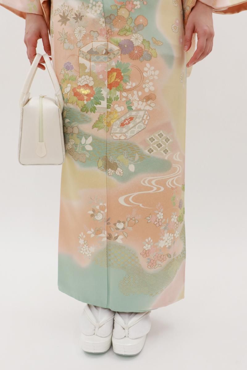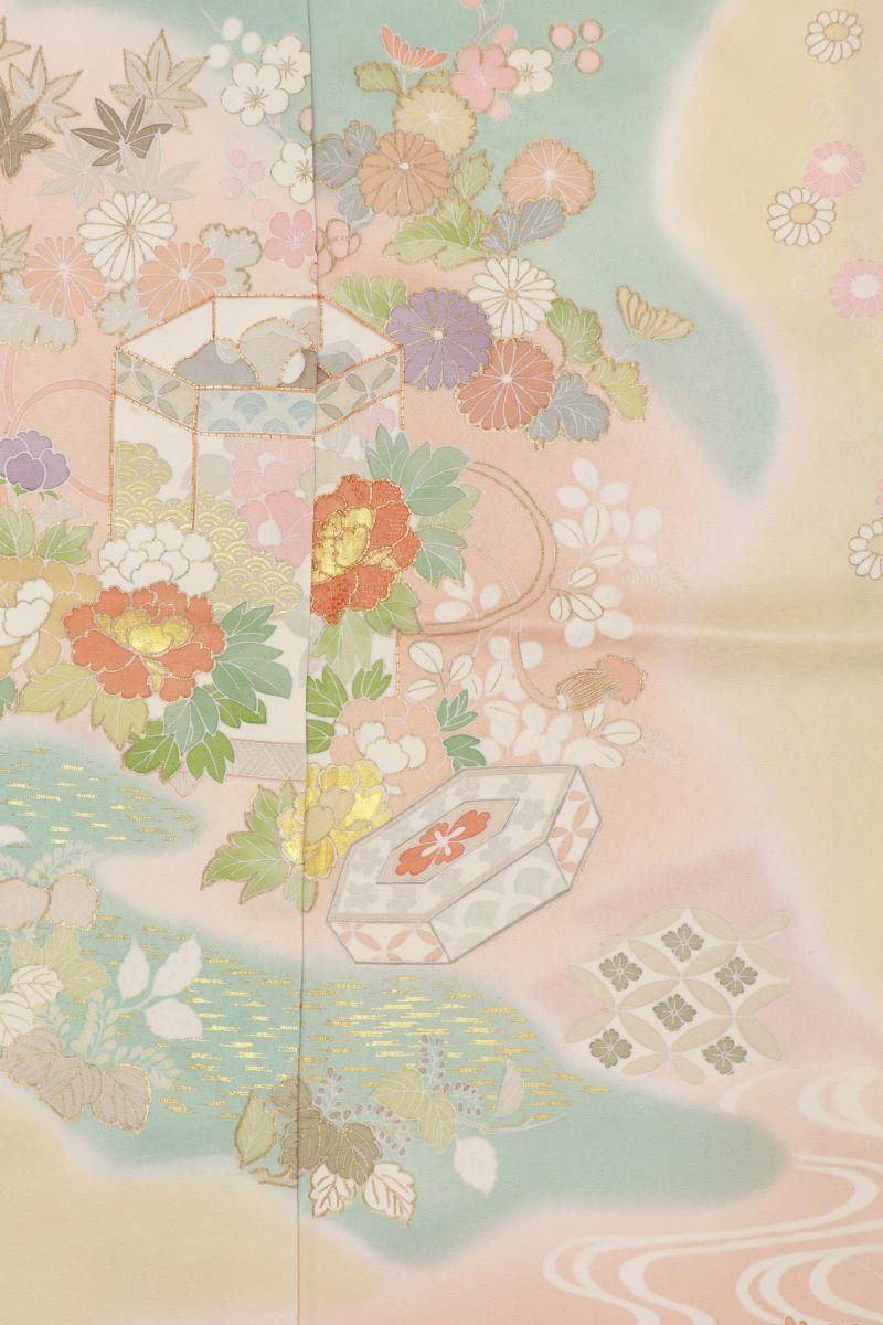 全体の印象としてはやや色を深めたシェルピンク色が近いでしょうか、オレンジみを含んだピンク色系の地に、クリーム色や水縹色などで多彩な暈かしを配し、四季折々の花や貝桶文を描いた訪問着です。細やかな唐草の地紋が浮かぶ穏やかな光沢を帯びた地に、はんなりと表現された古典意匠が楚々とした雰囲気のお品、どなたにも好感度の高い上品な趣で着る方を引き立ててくれることと思います。晴れやかなお祝いのお席や式典などにいかがでしょうか。