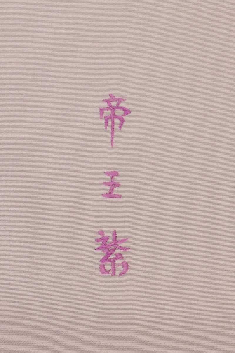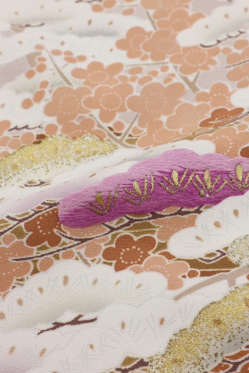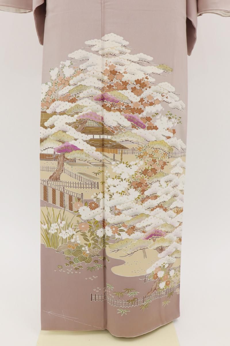 抑えた彩りで描かれた格調高い景色に、凛と浮かび上がるふっくらとした刺繍には帝王紫(貝紫)が用いられており、独特の気品あふれる紫の色目がぱっと目を引きますね。大人の女性らしい風格と存在感で晴れやかなお席を美しく盛り立ててくれることと思います。お祝いのお席や式典などにいかがでしょうか。