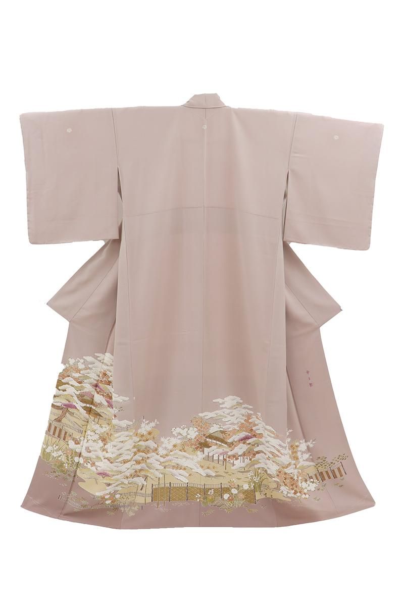 灰桜色が近いでしょうか、灰みの強いピンク系の地に、御所解文様を配した染三ッ紋の色留袖です。