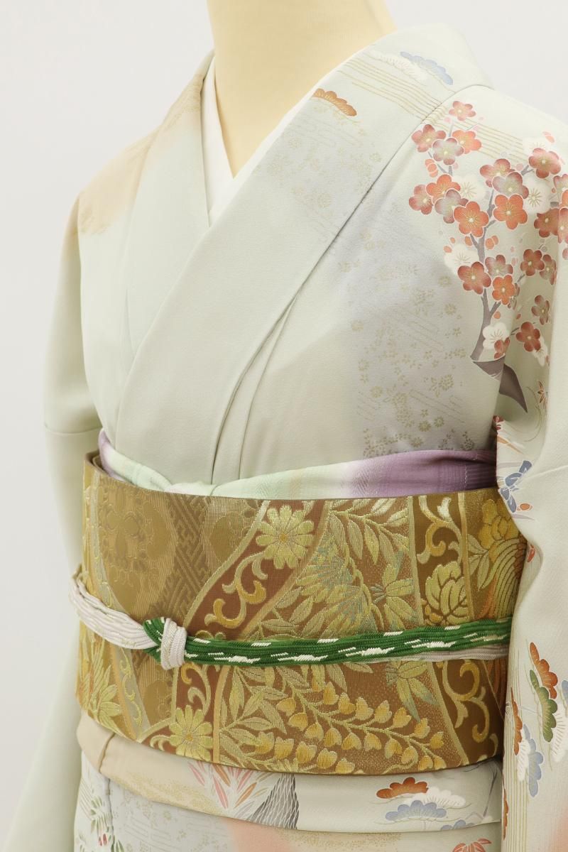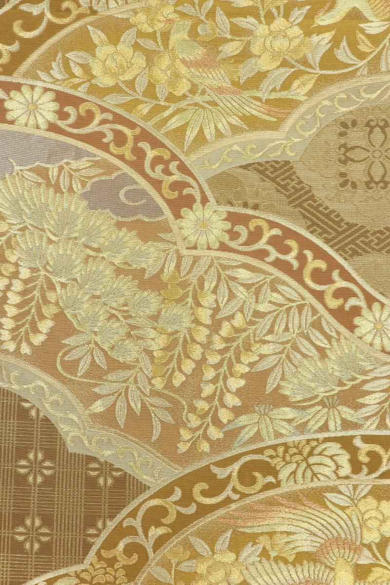 全体の印象としては胡桃色が近いでしょうか、まろやかな灰みの薄茶系の地に、鳳凰や松、牡丹唐草などが織り出された本袋帯です。