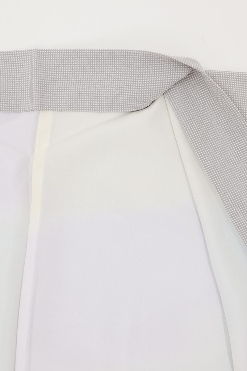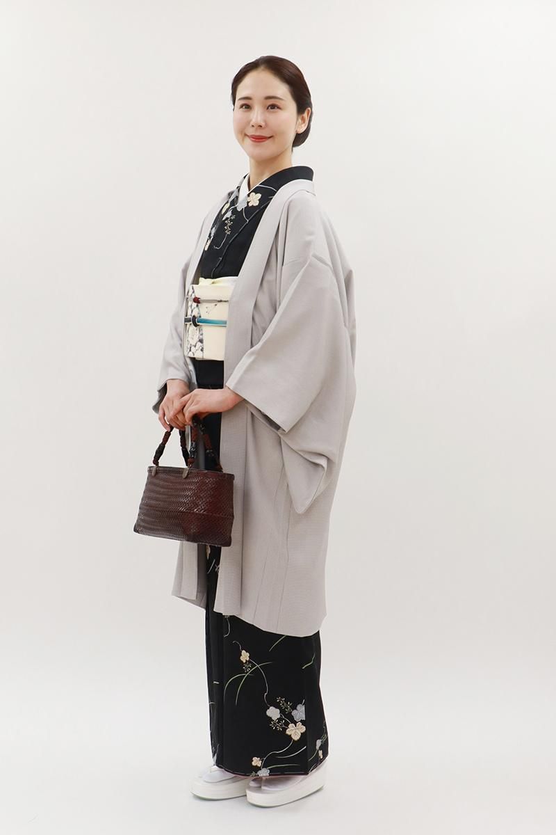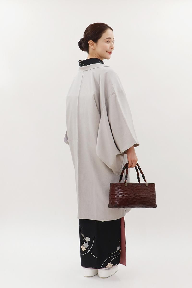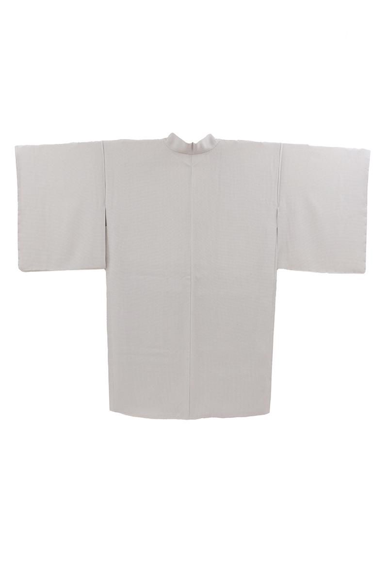 銀鼠色が近いでしょうか、細かなシボを帯びたさらりとした地に明るいグレーで角通しを染めた羽織です。