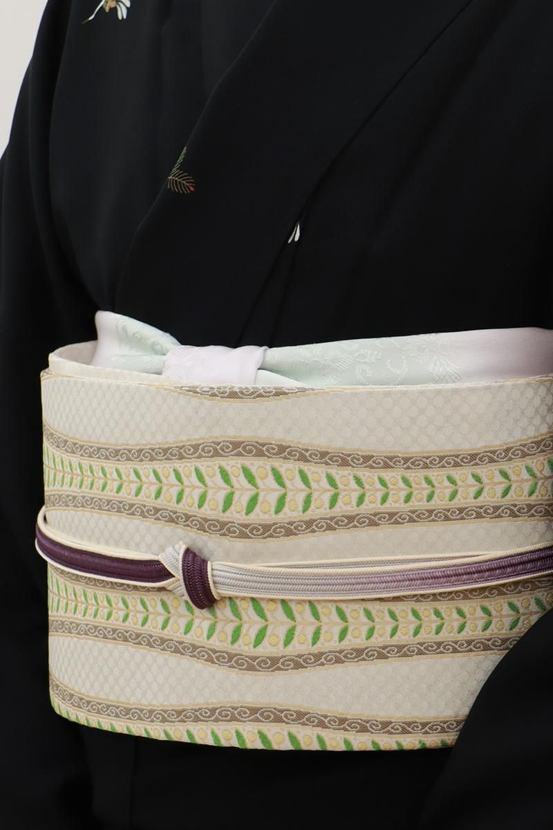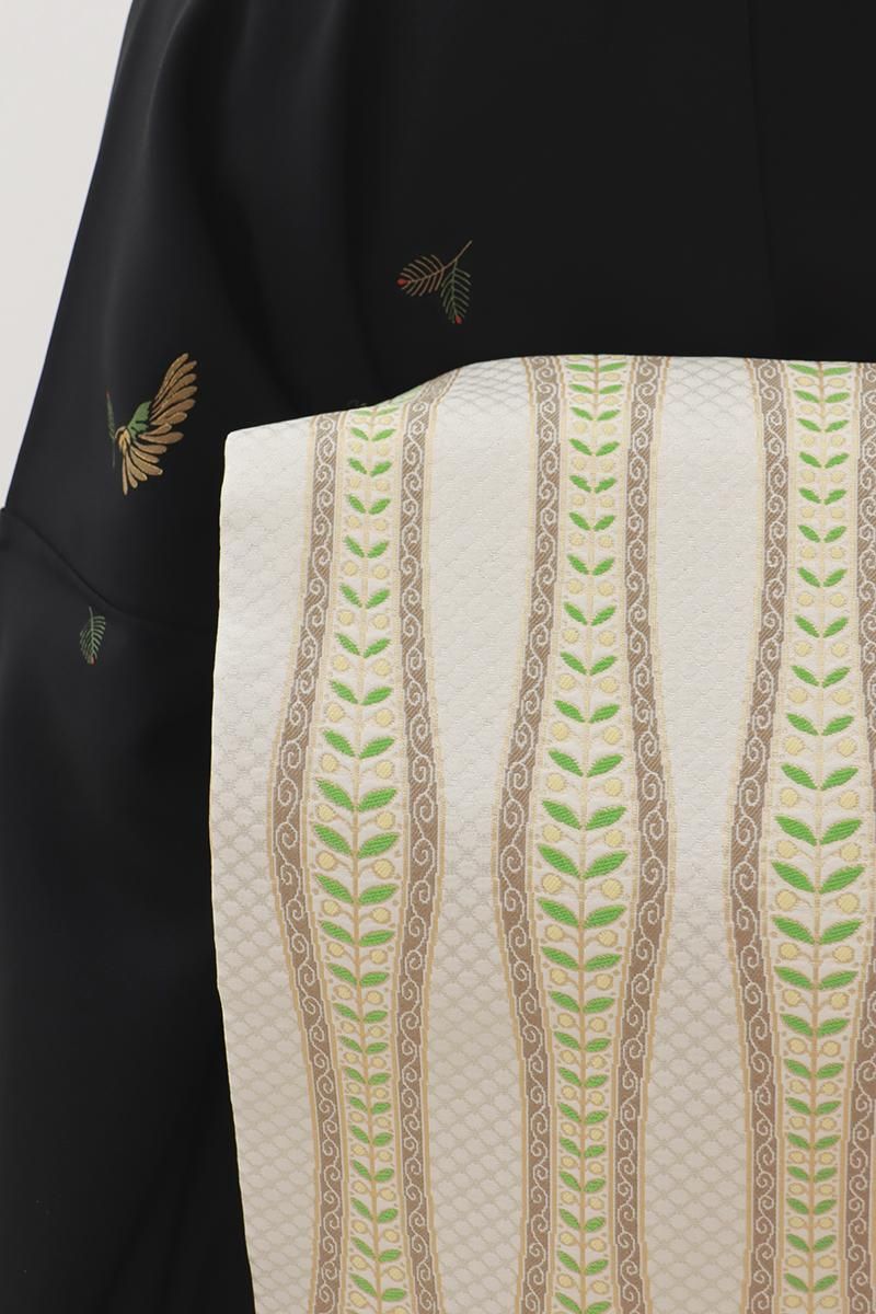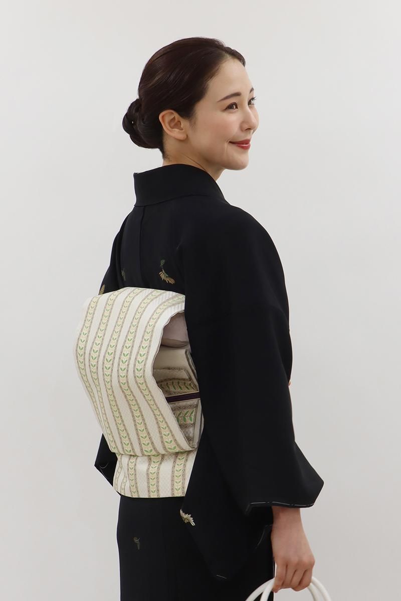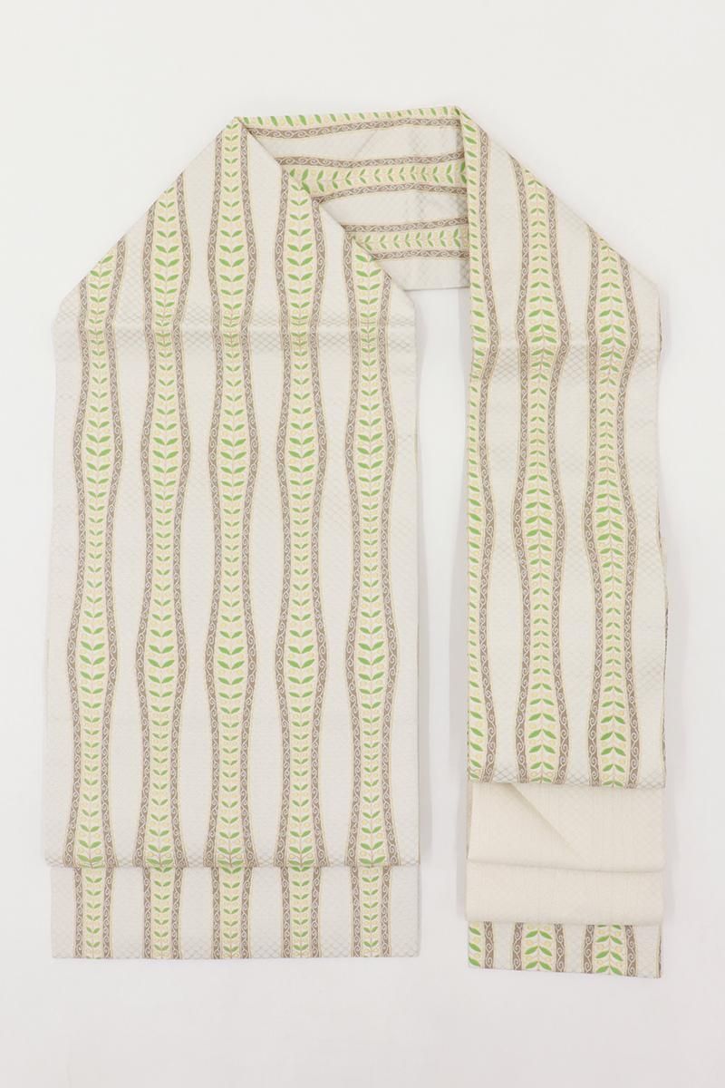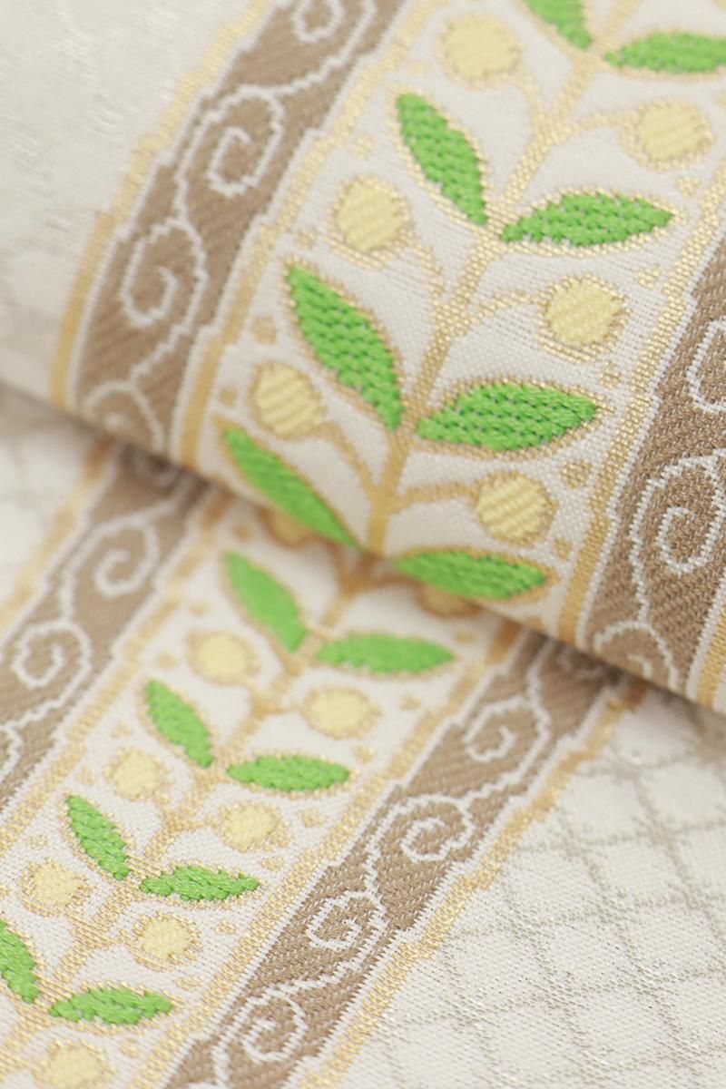 西陣証紙No.2257 古典を基調としながらも現代の空間にすっきりと映えるモダンな帯づくりで知られる織楽浅野さんの名古屋帯です。こちらは「印度花立涌」と銘されたお品、銀糸で細やかな斜め格子を配した白色の地に、小さな実と葉っぱを詰めたおおらかな立涌が装いに大人の愛らしさを添えて引き立ててくれそうですね。ドレッシーな紬から小紋、色無地など様々な着物に合わせて、観劇やお出かけなどにいかがでしょうか。