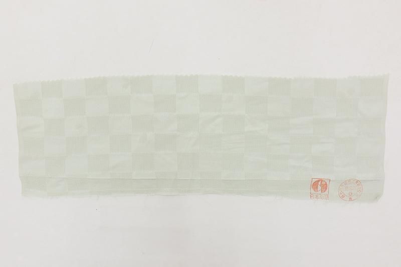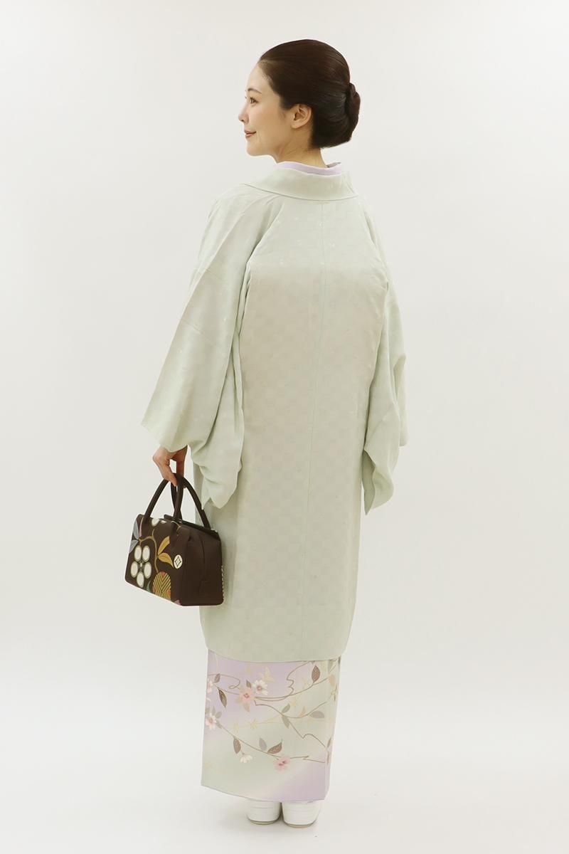 少し色を薄めた白緑色が近いでしょうか、淡い灰みの薄緑色の地に、市松に桜の地紋の浮かぶ道中着です。