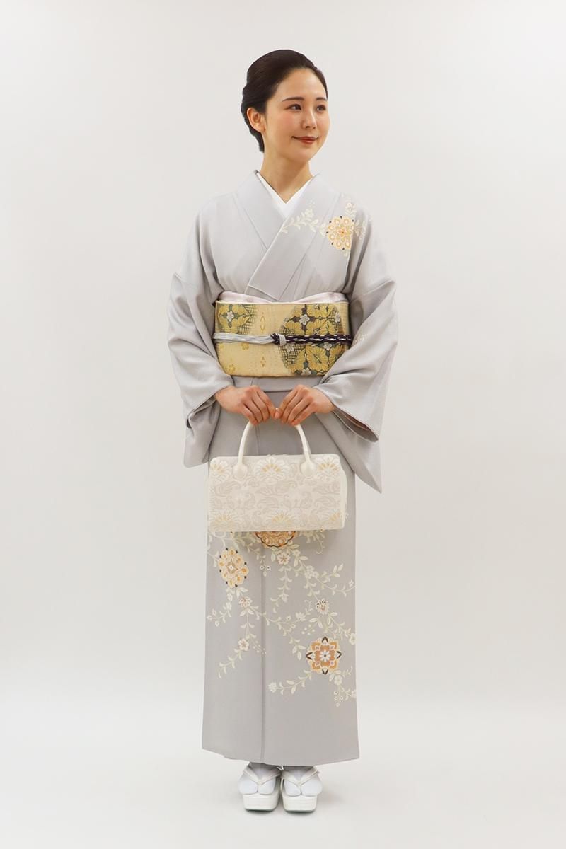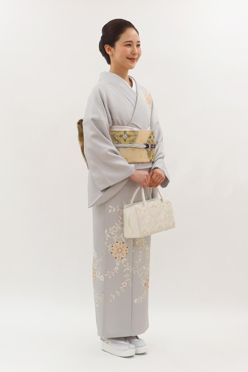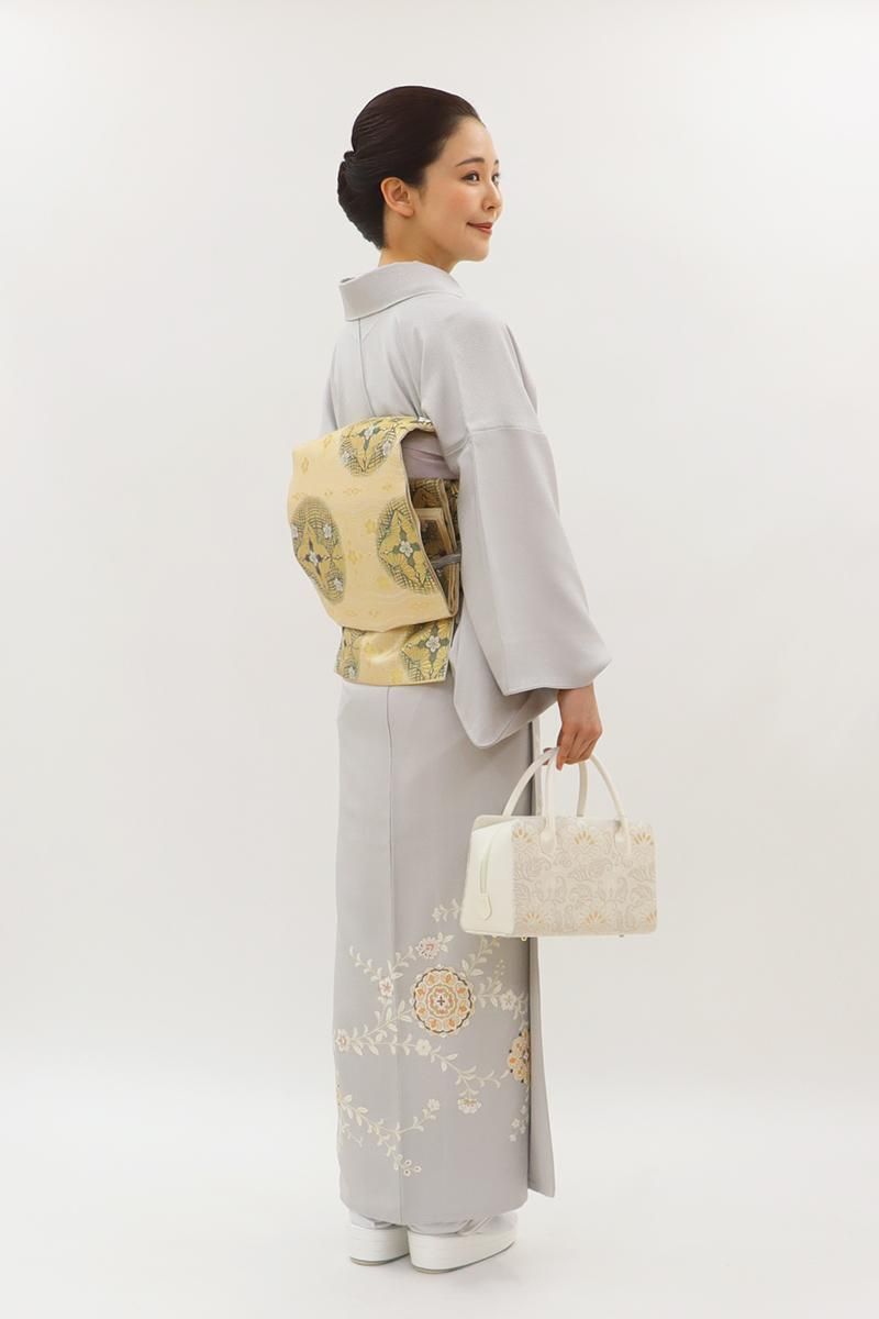伝統的な格調高い意匠を、落ち着いた色遣いで上品に表したお品、華やかになりすぎない柔和な印象の一枚は着用の機会も幅広いことと思います。お祝いのお席やパーティなどに大人の女性らしい風格ある装いをどうぞお楽しみくださいませ。