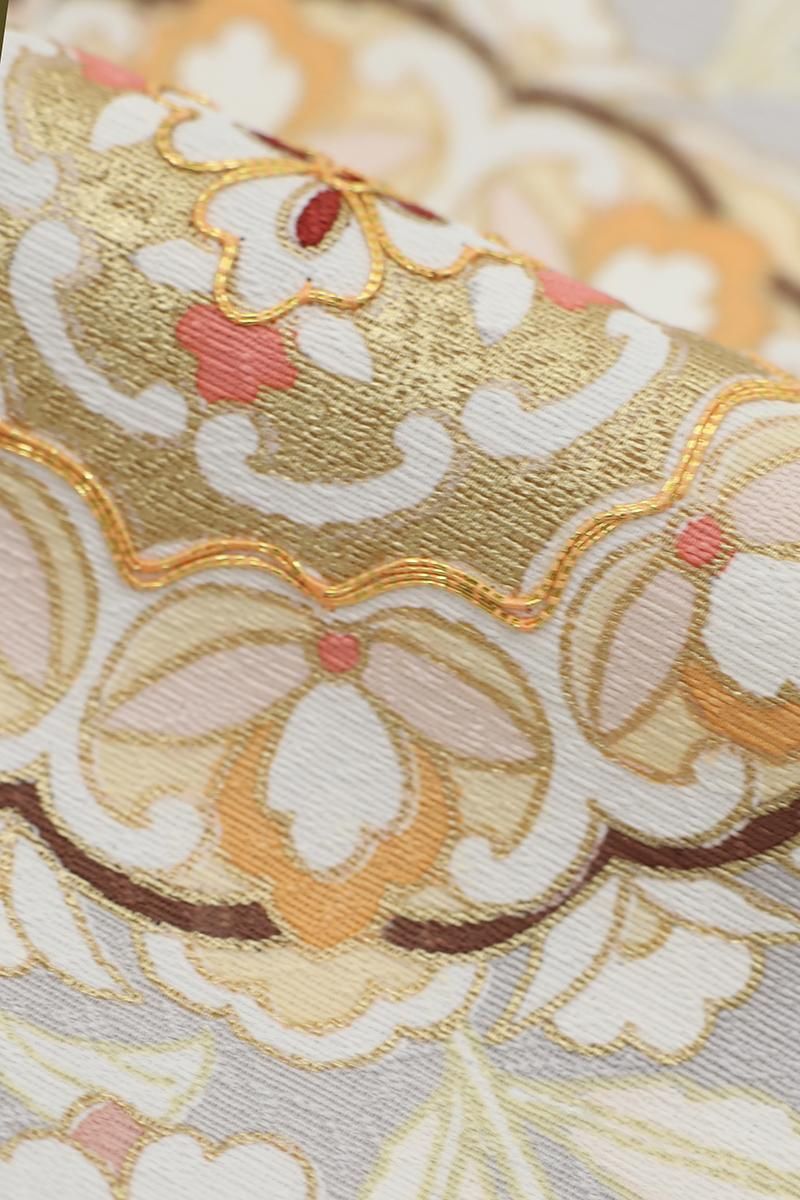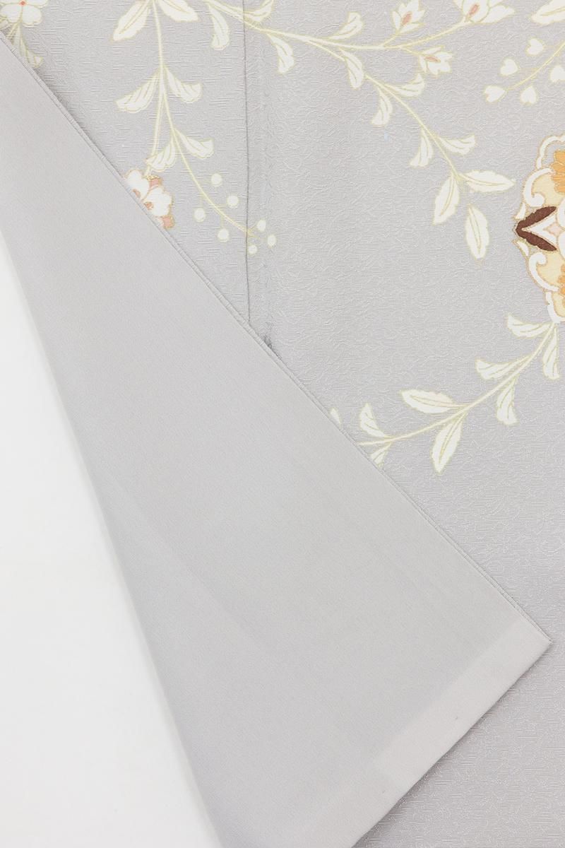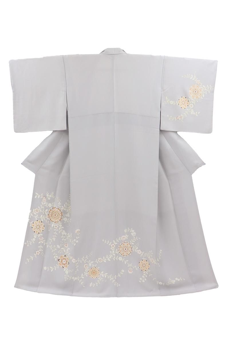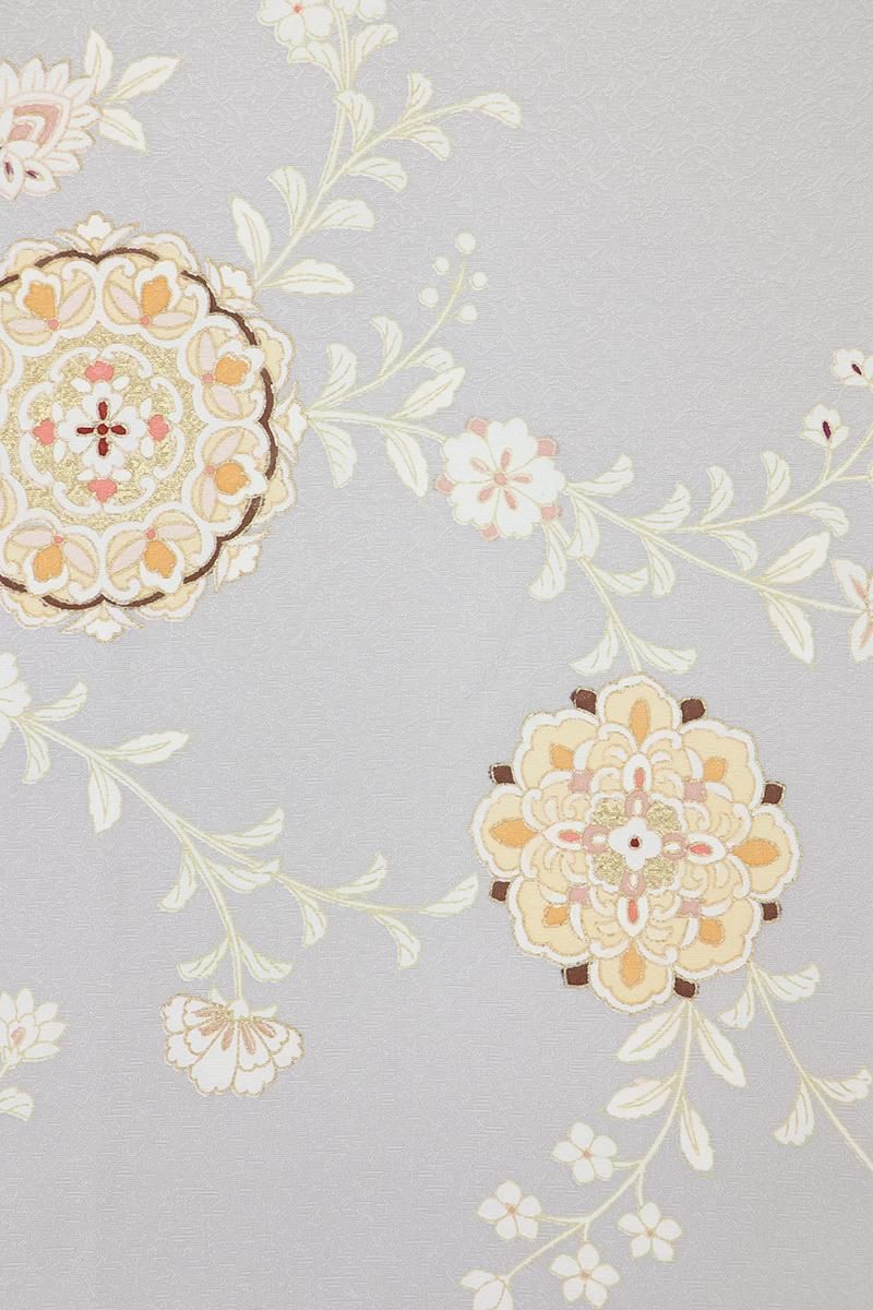 銀鼠色が近いでしょうか、花唐草の地紋の浮かぶ明るいグレーの地に、ベージュ系の彩りに金彩や金糸を添えて唐花や華文を配した訪問着です。