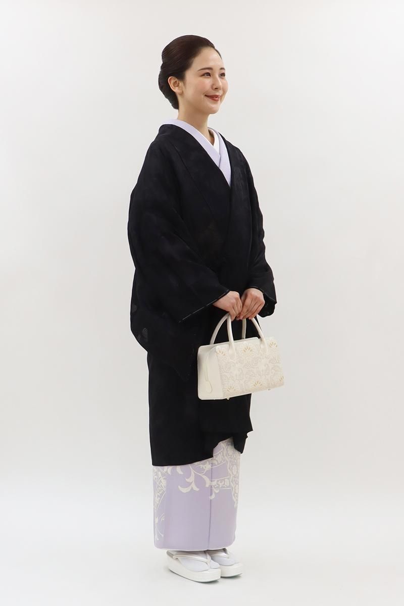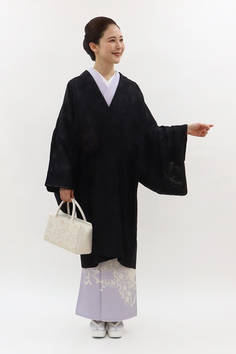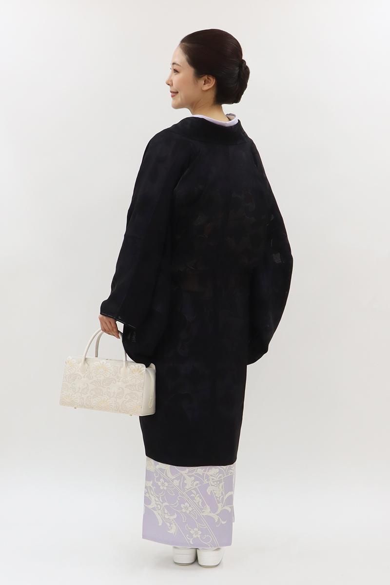明るいお色目の多くなるこれからの季節の装いをきりりと引き締めてくれそうな一枚、淡色の着物に重ねていただければ優美な地紋が一層引き立ちそうですね。様々なお着物に合わせやすい黒の羽織もの、涼やかな透け感とともにシックでエレガントな趣をお楽しみいただけることと思います。これからの季節のお出かけにいかがでしょうか。