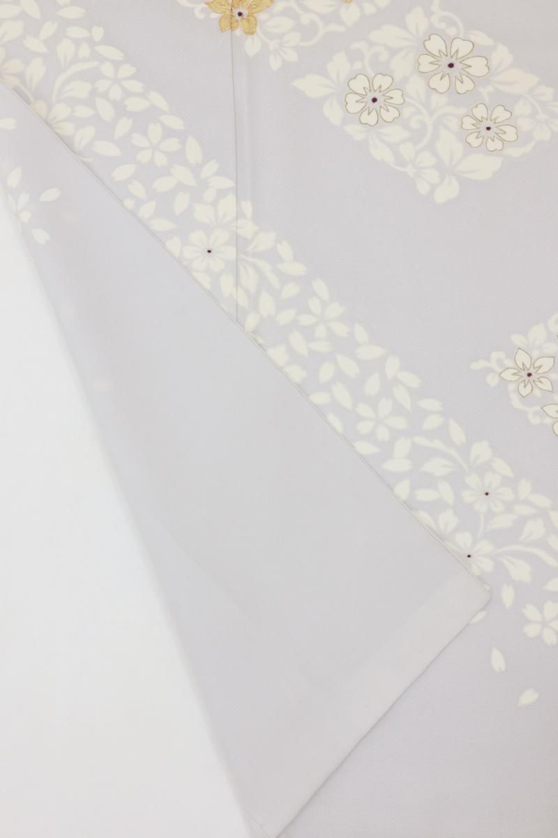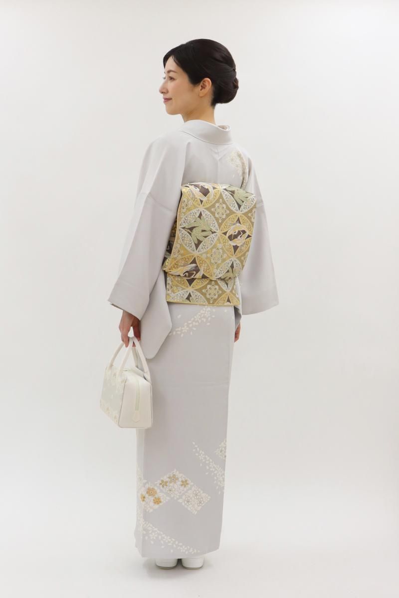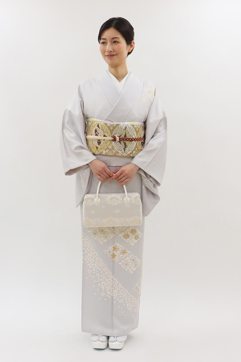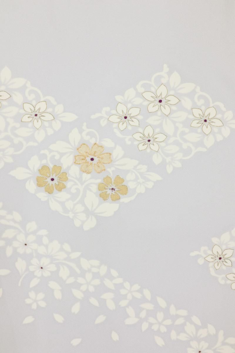 わずかに紫みを足した銀鼠色が近いでしょうか、ほんのり紫がかった淡いグレー系の地に、花唐草の菱に桜の花弁を散らした訪問着です。さらりとした地風に、品良く置かれたモチーフがしっとりと風雅なお品、金彩や金駒刺繍のきらめきがさりげない気品を添え、装いを女性らしく楚々とした雰囲気で引き立ててくれることと思います。様々な帯合わせで、改まったお席やお呼ばれなどの場面にいかがでしょうか。
