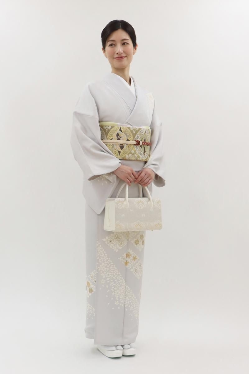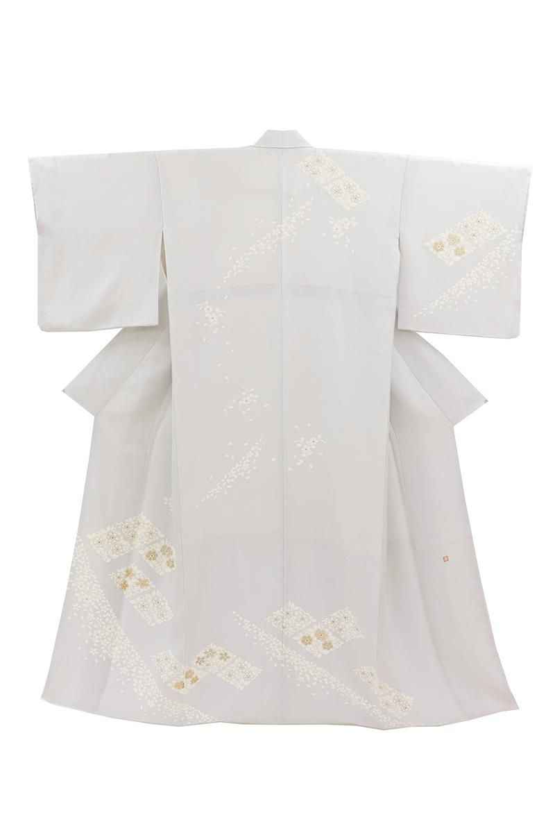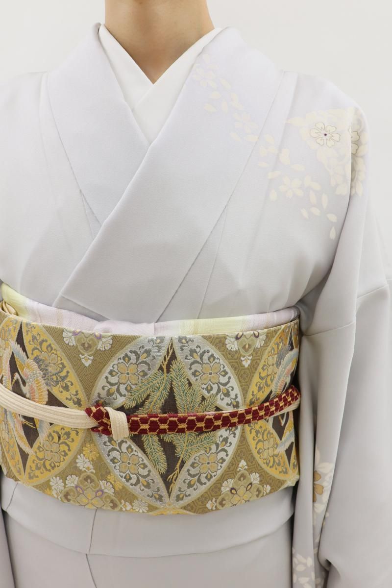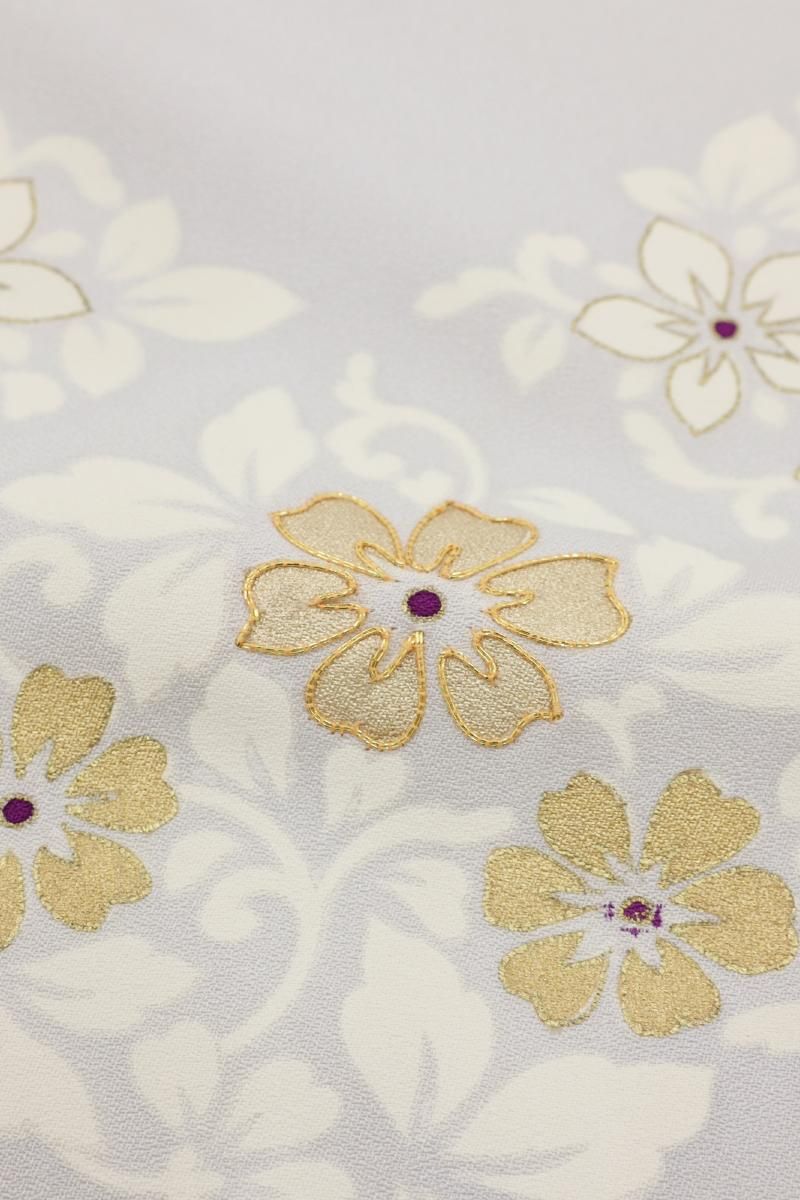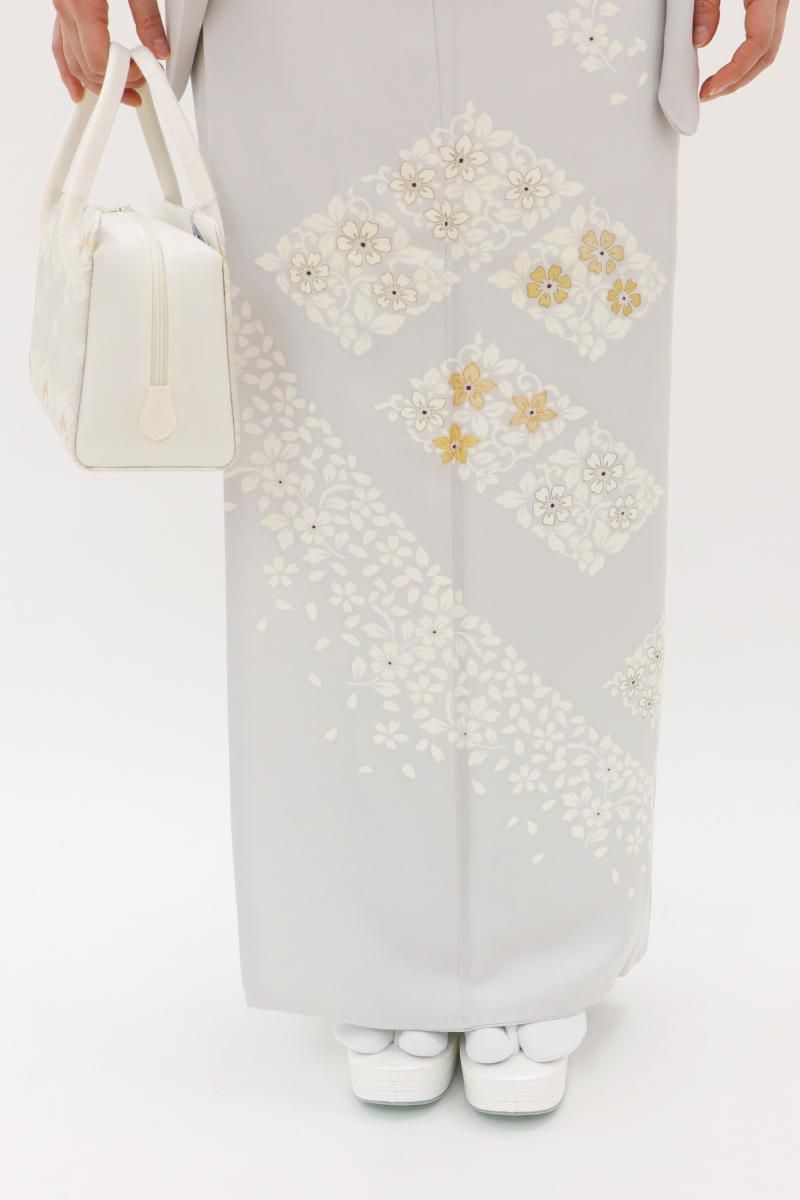 わずかに紫みを足した銀鼠色が近いでしょうか、ほんのり紫がかった淡いグレー系の地に、花唐草の菱に桜の花弁を散らした訪問着です。さらりとした地風に、品良く置かれたモチーフがしっとりと風雅なお品、金彩や金駒刺繍のきらめきがさりげない気品を添え、装いを女性らしく楚々とした雰囲気で引き立ててくれることと思います。様々な帯合わせで、改まったお席やお呼ばれなどの場面にいかがでしょうか。