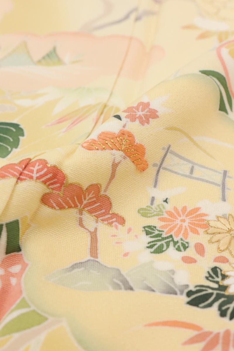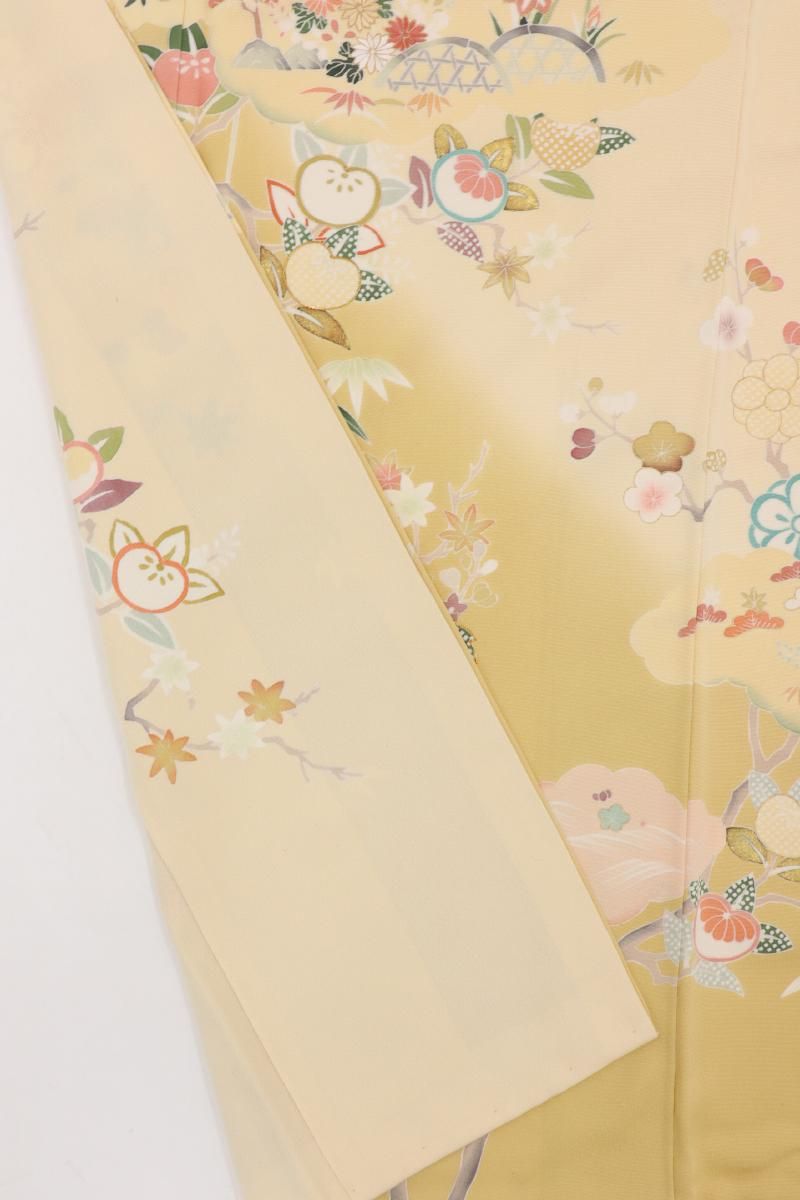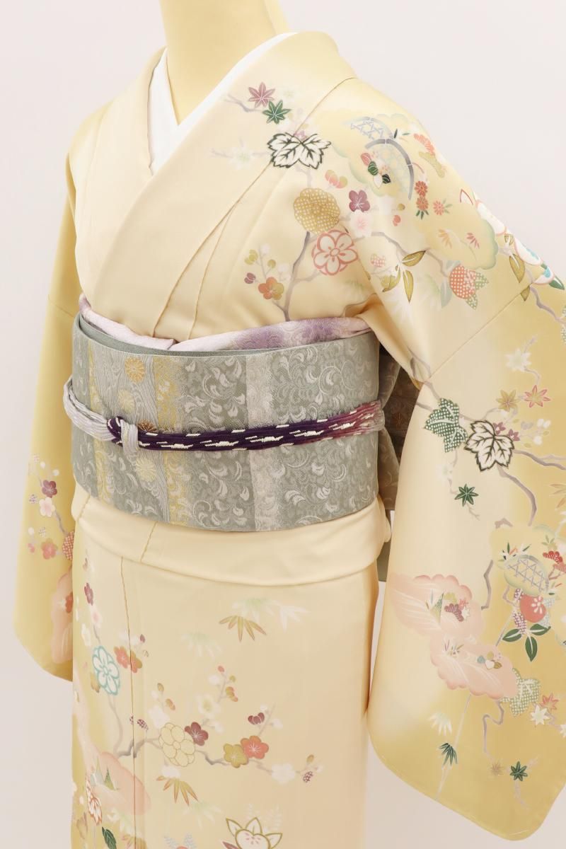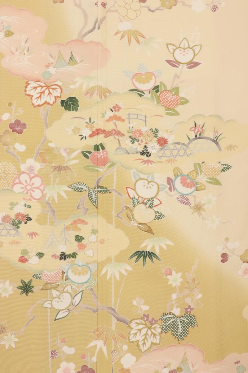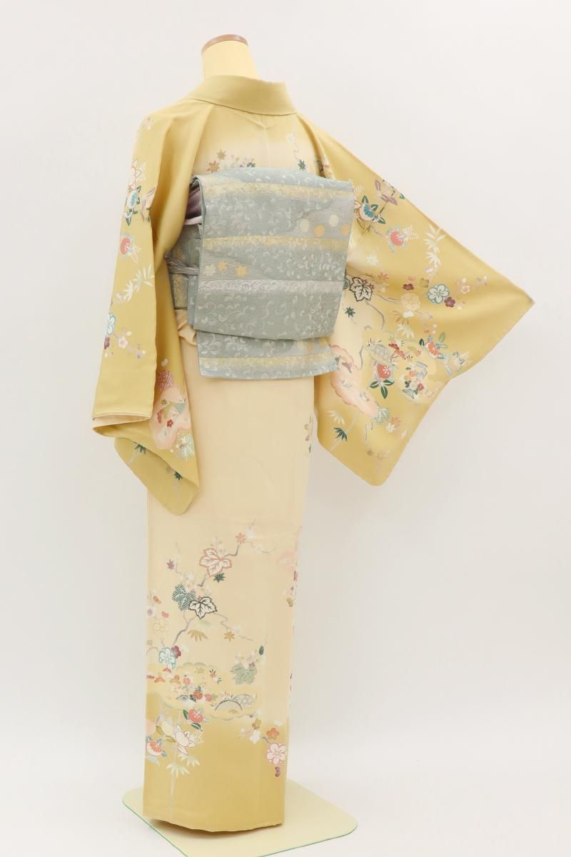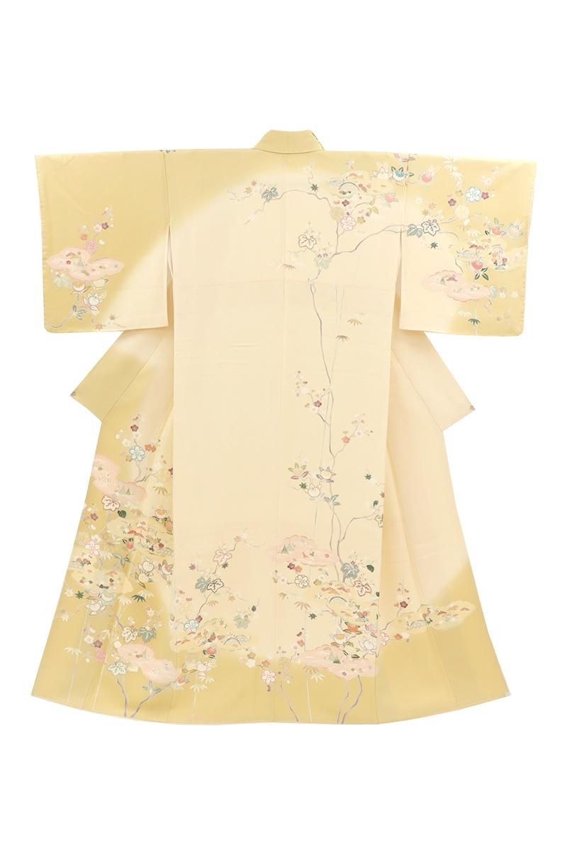 クリームイエローの地に、裾や肩に灰みの黄色で場を分け、するりと伸びる梅の木や橘、菊などの四季花に、網干や蛇籠などの水辺の風景をあしらった雲文や松竹梅の意匠を散らした訪問着です。