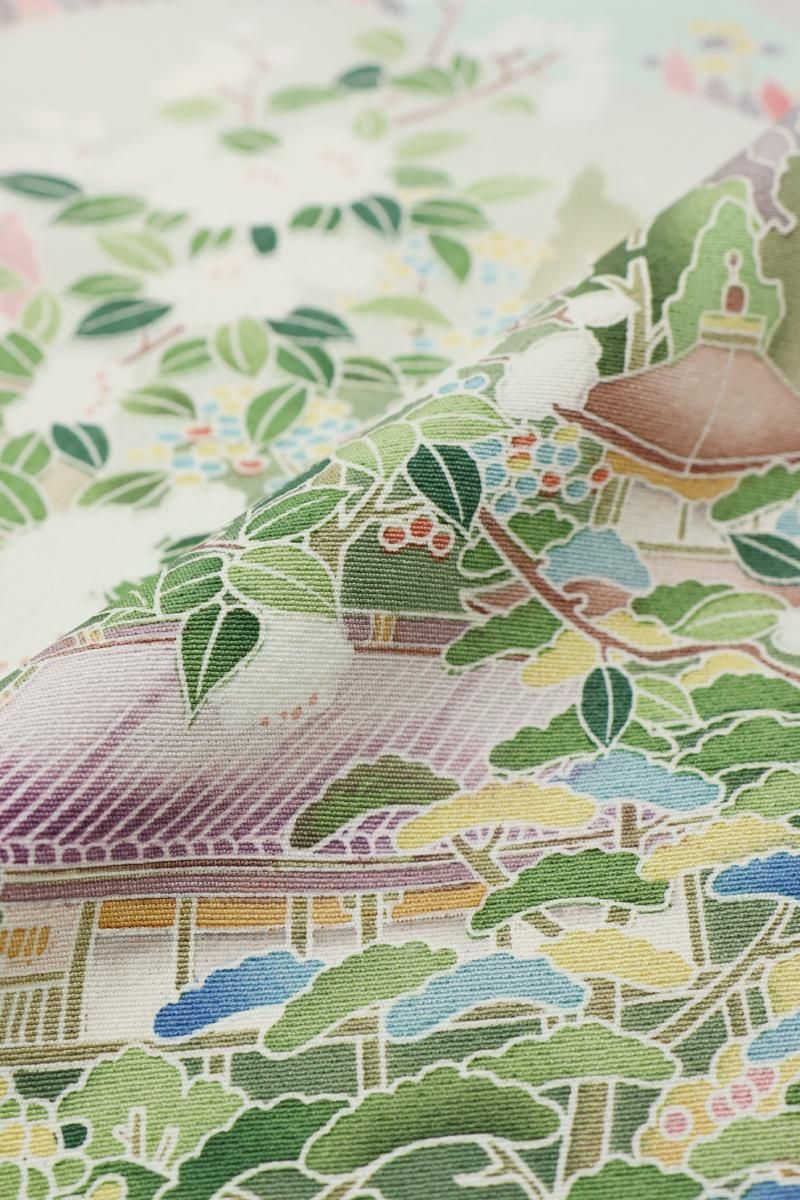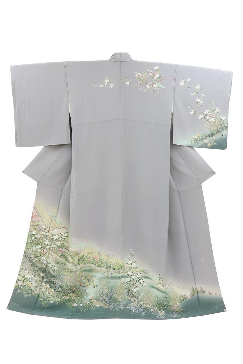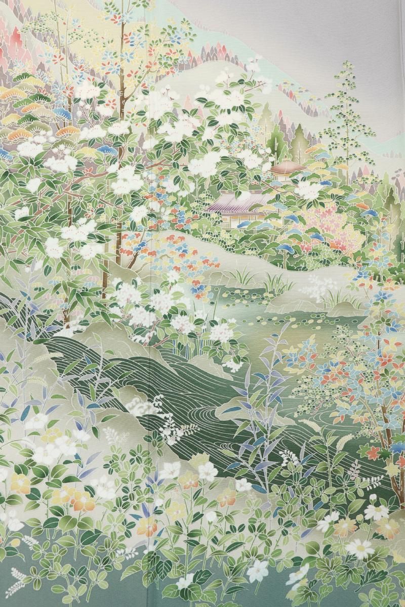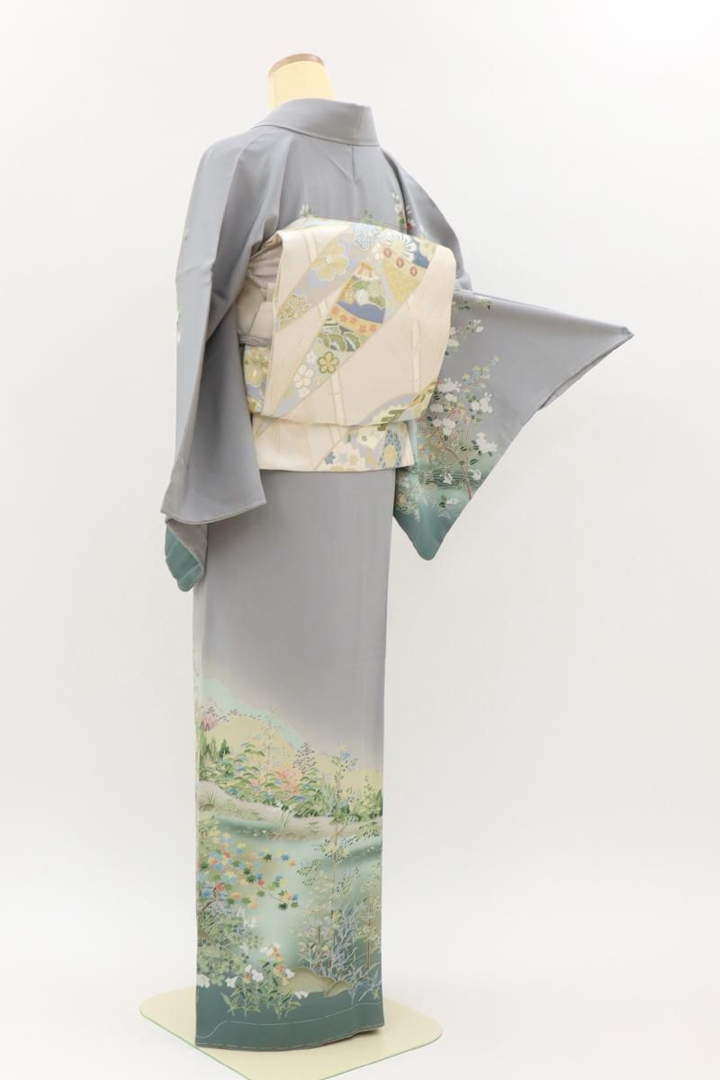 色を薄めた鳩羽鼠色が近いでしょうか、わずかに紫みを含んだグレー系の地に、四季折々の花木や波など水辺の風景文を描いた訪問着です。こちらは友禅作家・仲野雅峰さんの作、落ち着いたお色目を背景に、優美な色遣いで表現された上品な作風はどのような場面でも好感度が高く、安心してお召し頂けることと思います。様々な帯合わせで、パーティやお祝いのお席など晴れやかな場面の装いにいかがでしょうか。