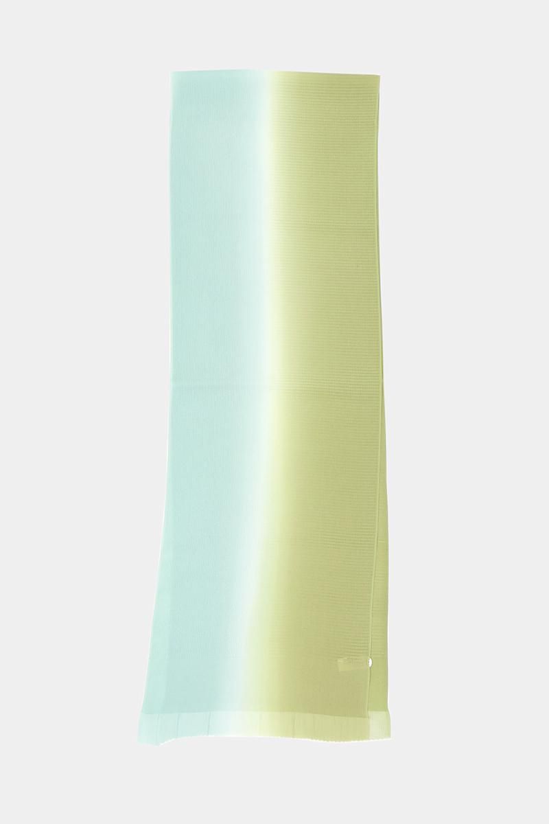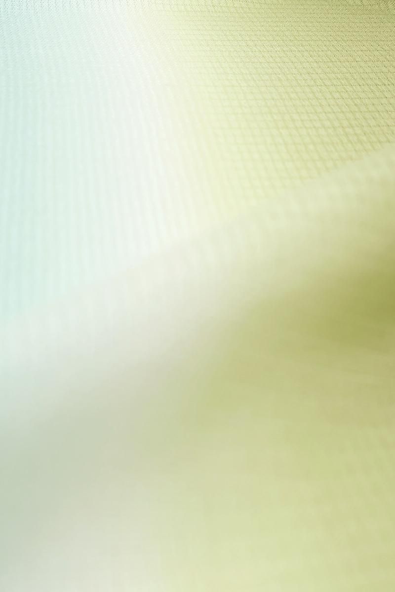 こちらは絽目の異なる地を、緑みの水色と灰みの薄緑色の二色で染め分けたお品、上品で落ち着いた彩りとしなやかな生地感は、夏の軽やかな装いを引き締めてすっきりとした印象を添えてくれることと思います。夏のお出かけに情緒あるはんなりとした一枚をいかがでしょうか。
