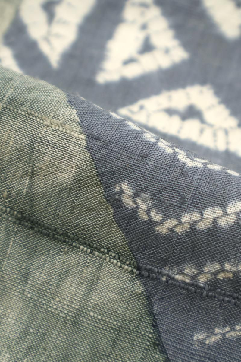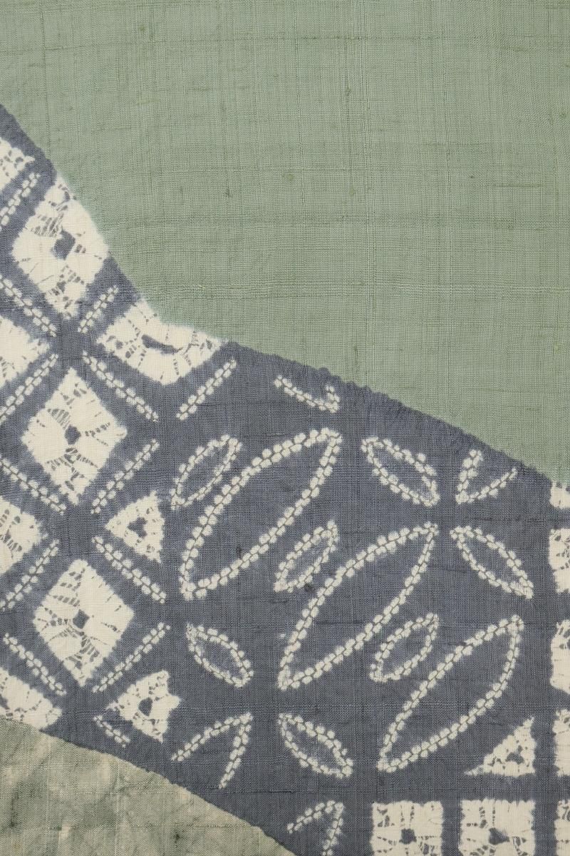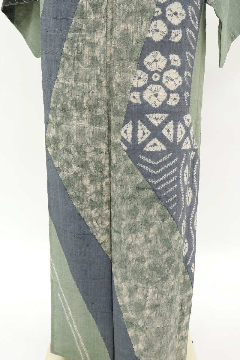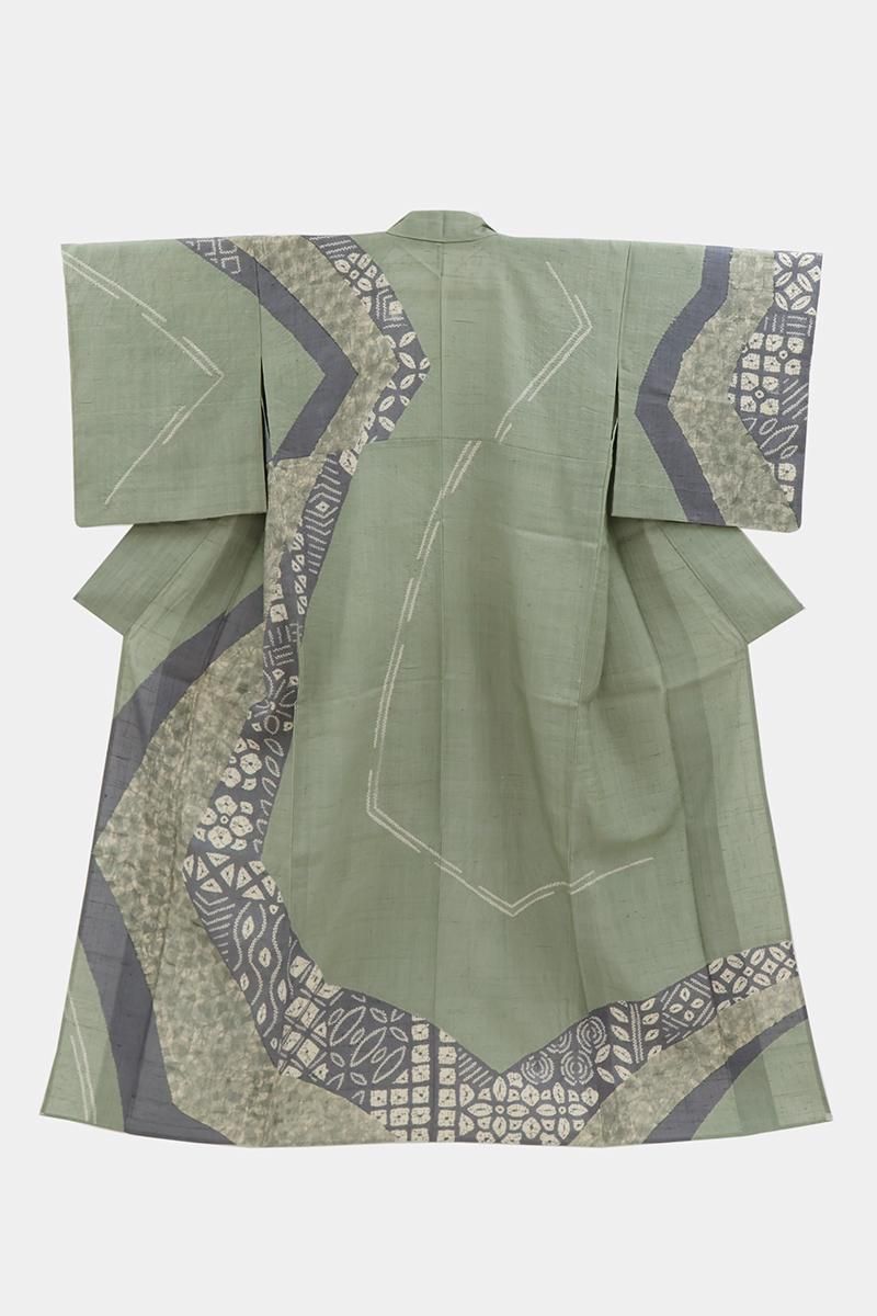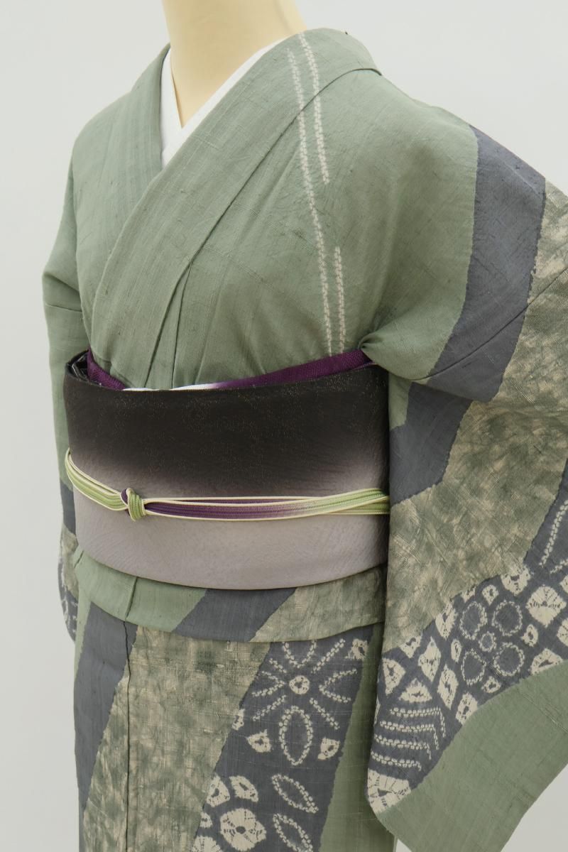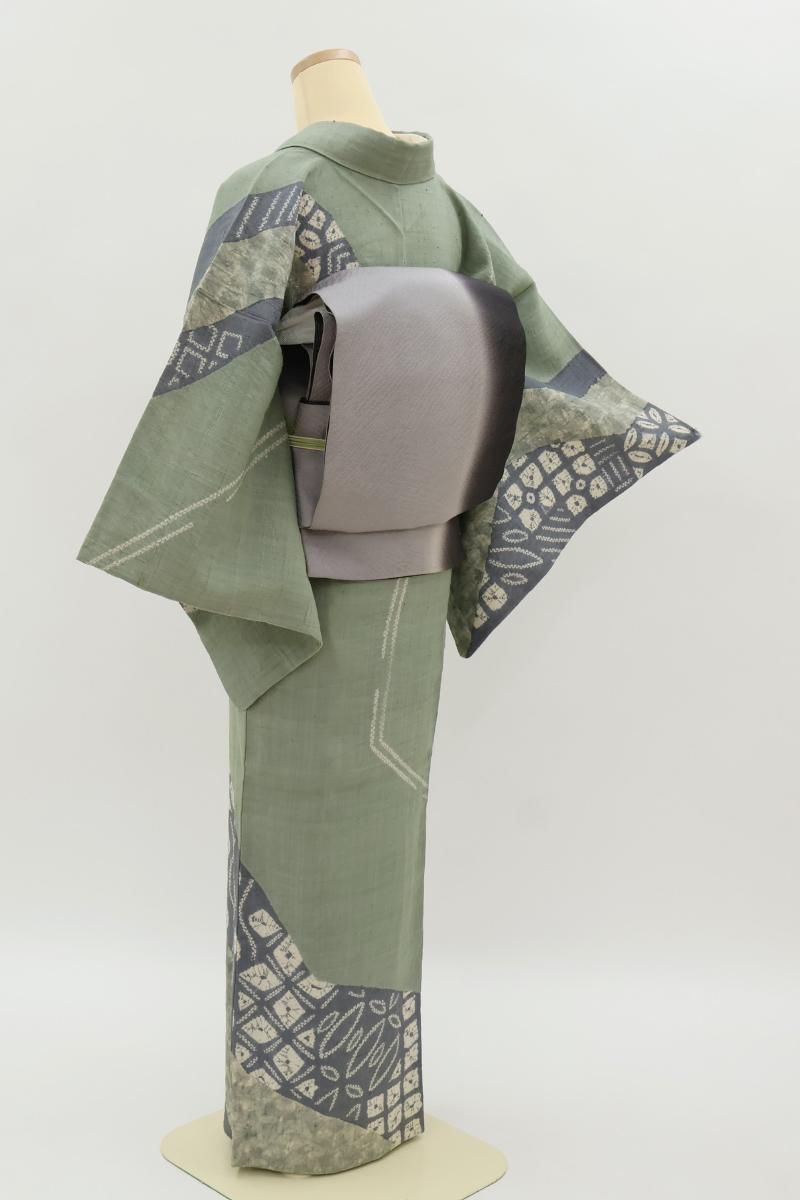 老竹色が近いでしょうか、灰みの強い薄緑色の紬地に、絞り染めで裂取りに花文などをあしらった単衣の訪問着です。節立った糸の浮かぶさっくりとした地風が渋さの中にも品の良い洒落味を備えたお品、落ち着いたお色目ですので趣味性ゆたかな大人の装いをお楽しみいただけることと思います。お出かけやお食事会、観劇など様々な場面の装いに気軽な社交着としていかがでしょうか。