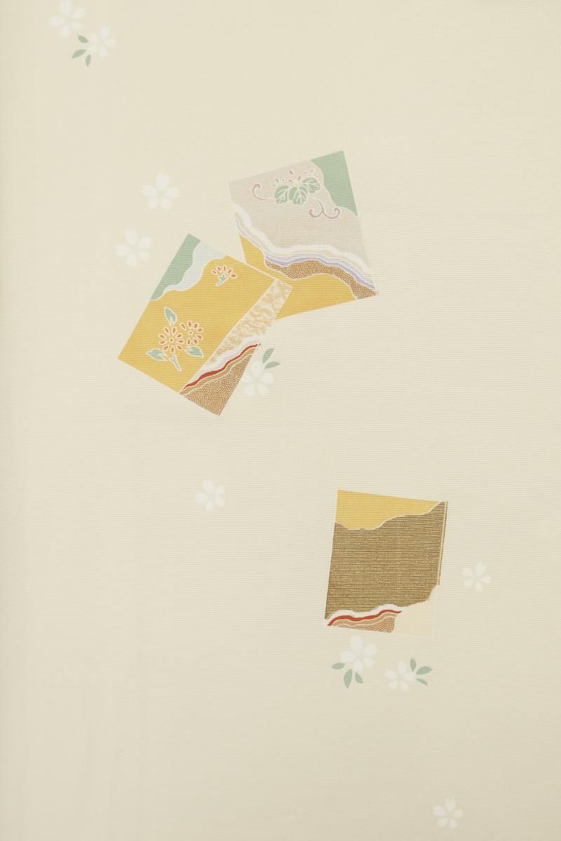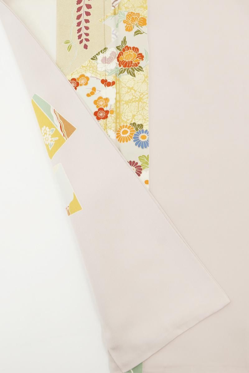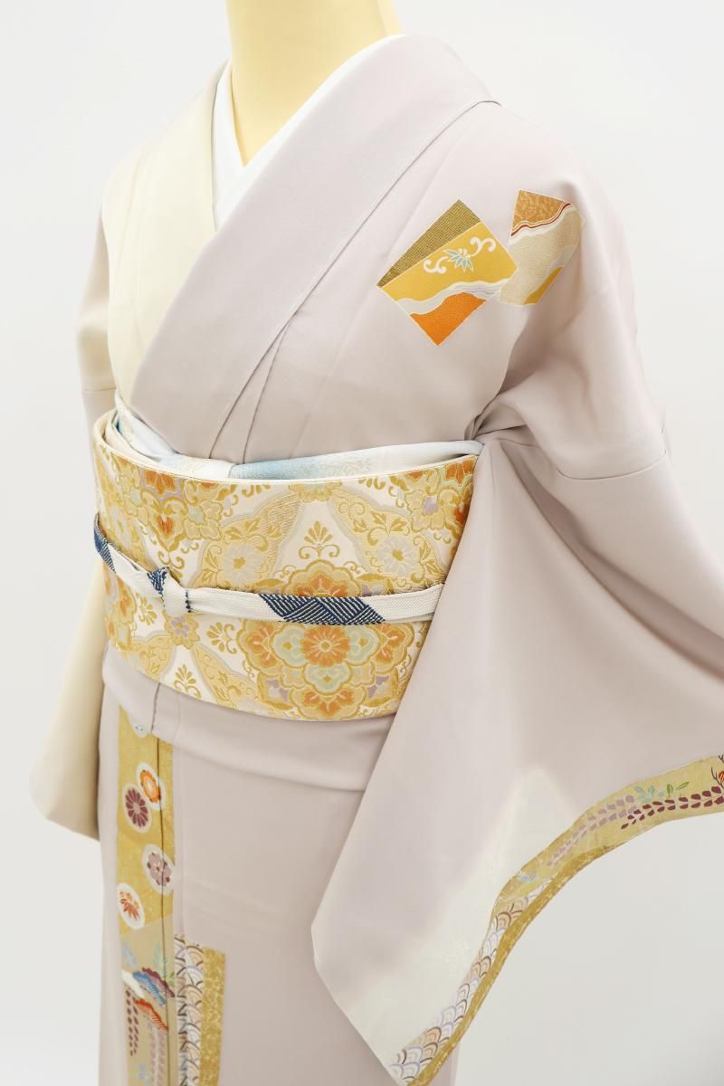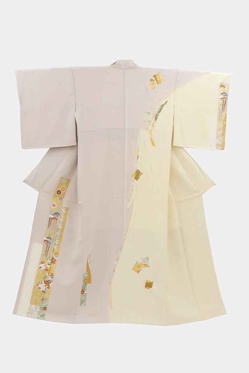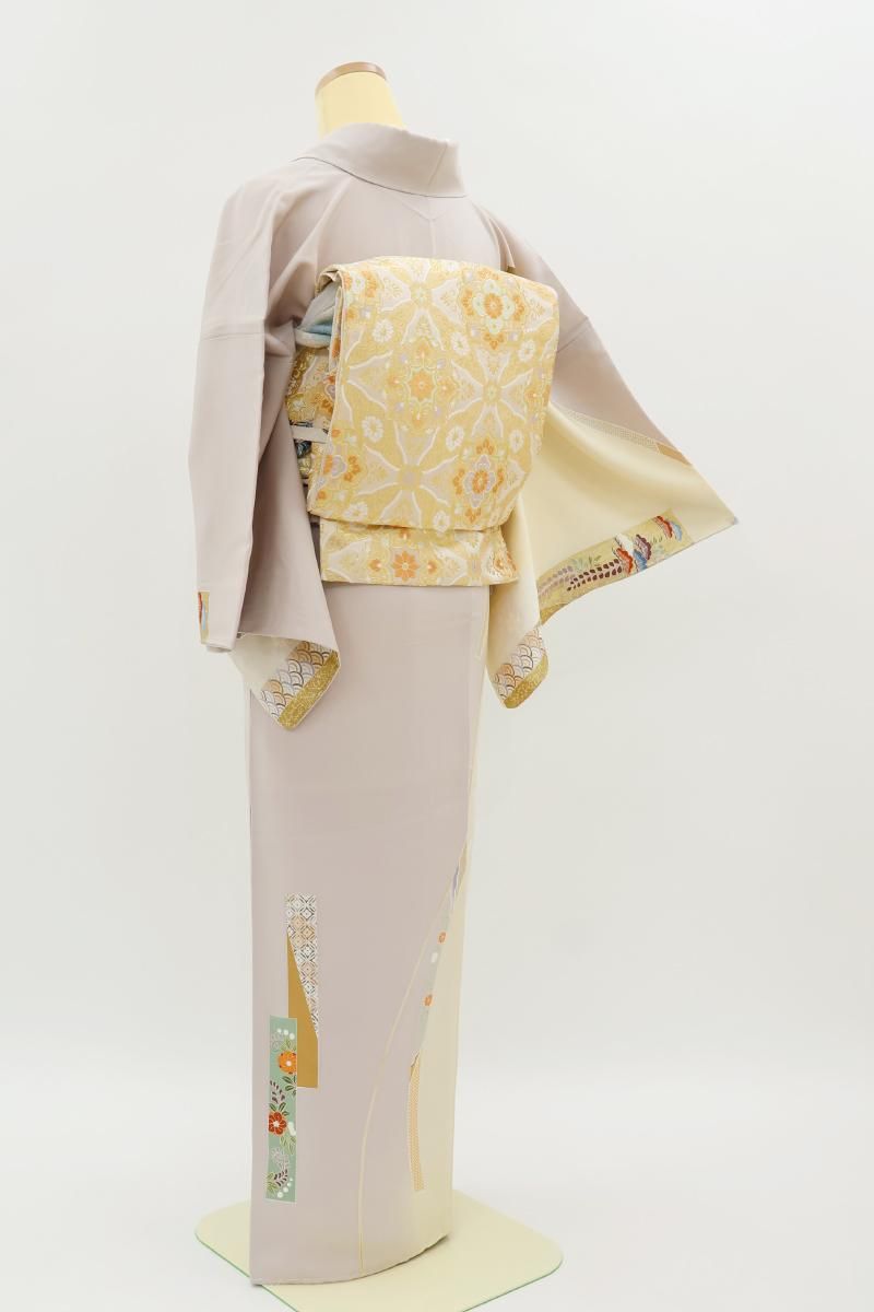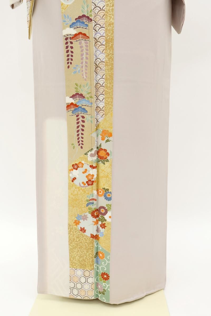 灰桜色と鳥の子色が近いでしょうか、灰みの強いスモーキーピンク系とクリーム色系で染め分けた地に、短冊に四季折々の花や割付文などを配した訪問着です。女性らしいお色目に優美な色遣いに金彩を添えて描かれた文様が着る方を晴れやかに引き立ててくれるお品、風雅な古典意匠はどなたにも好感度高く、気品豊かな装いをお楽しみ頂けることと思います。改まったお席や式典、お祝いやパーティなど様々な場面にいかがでしょうか。