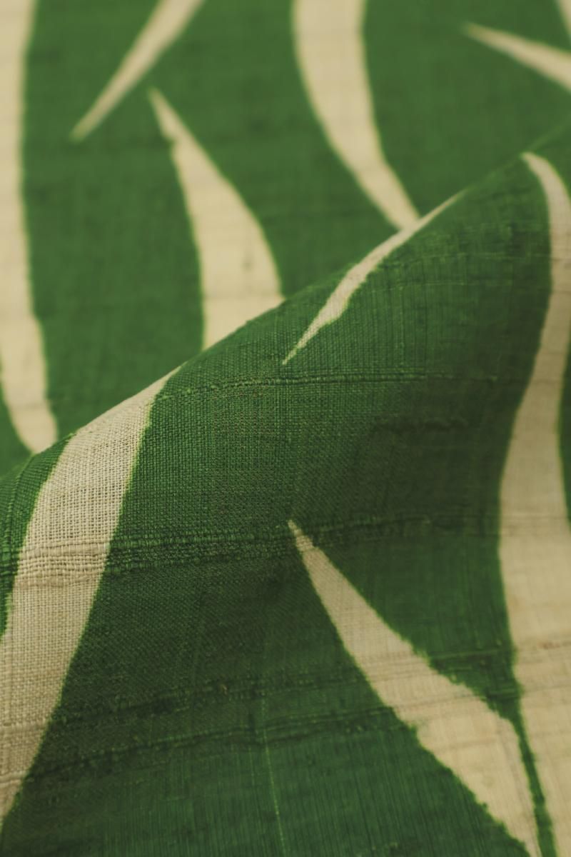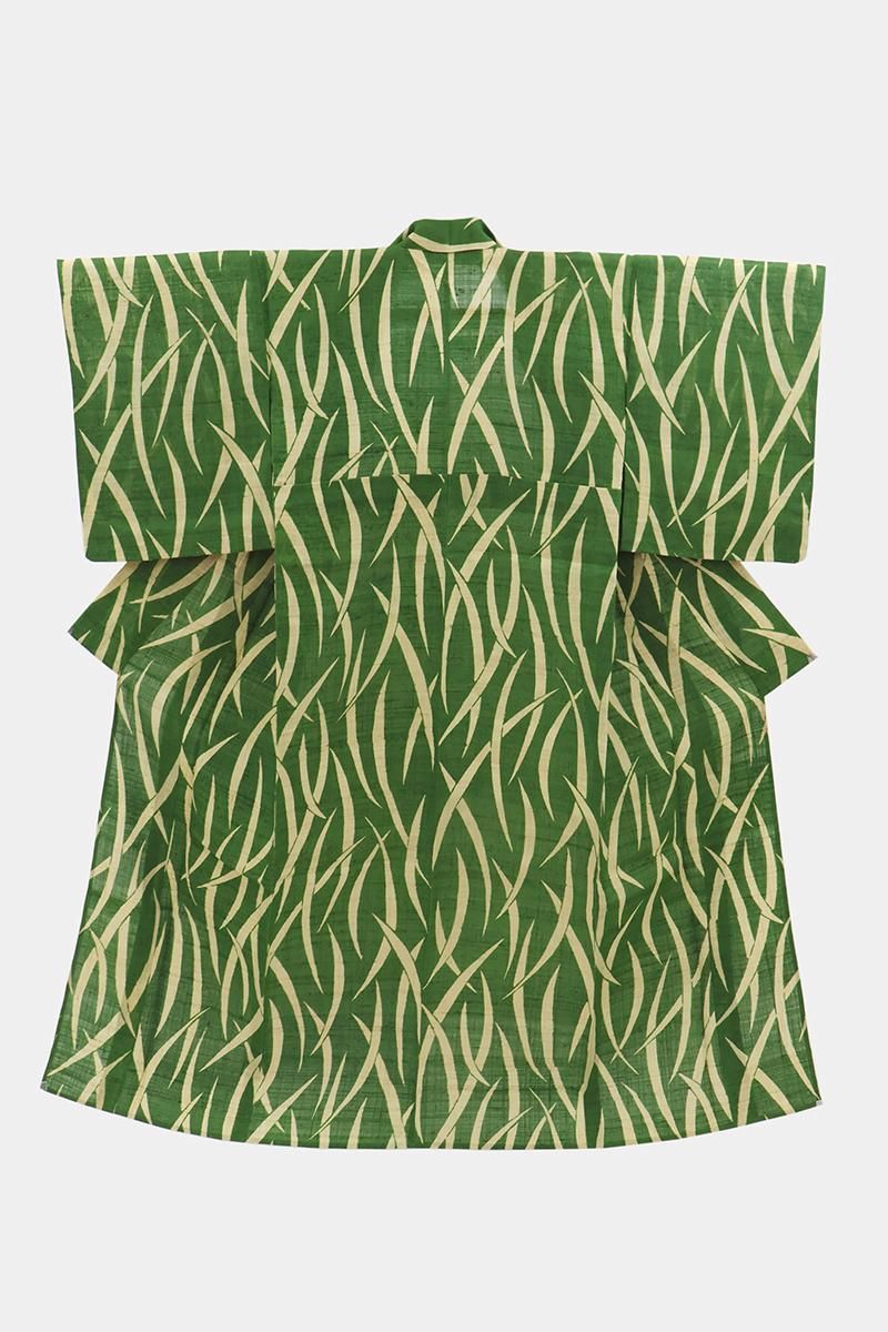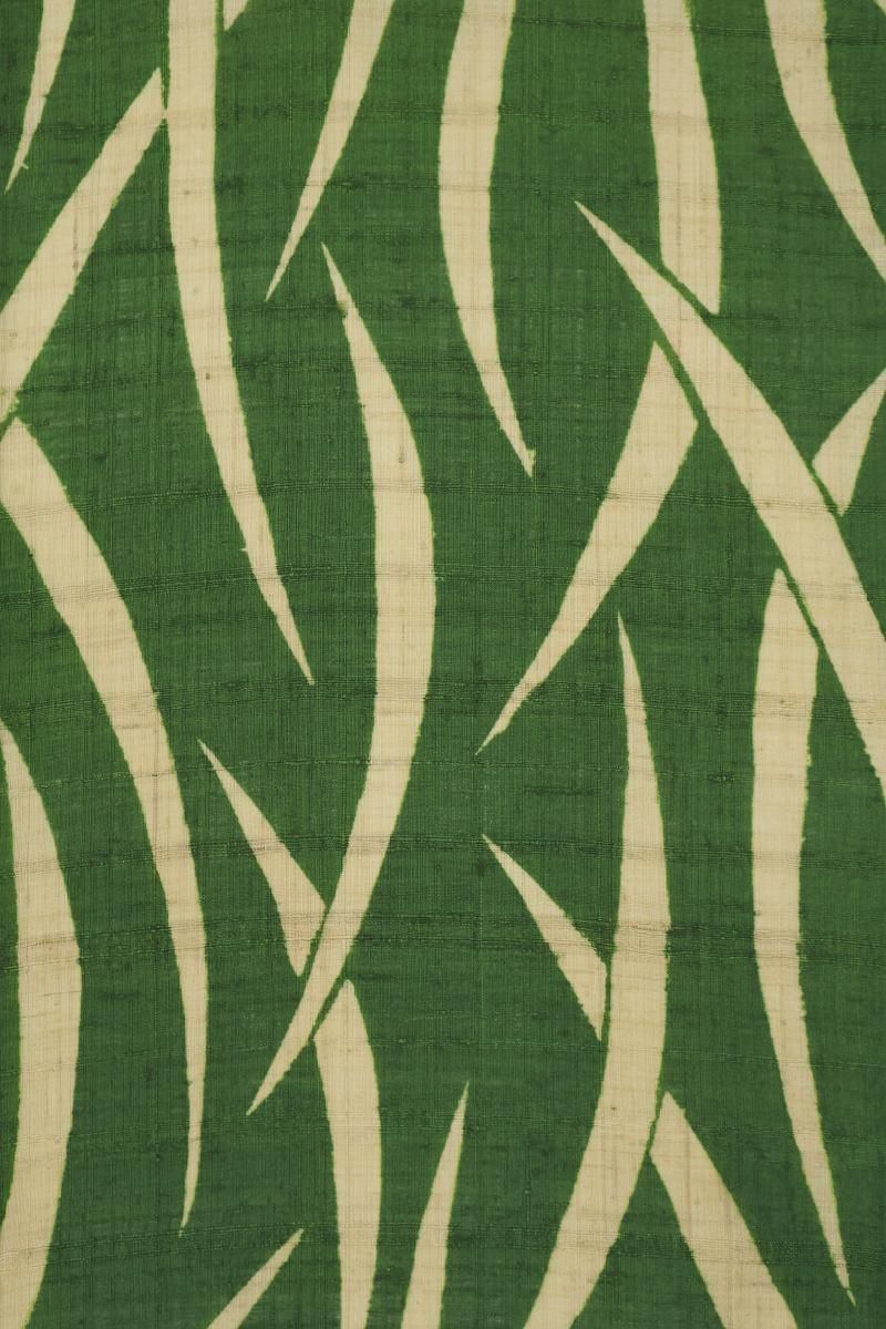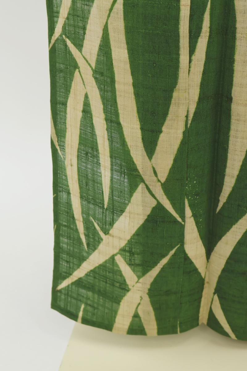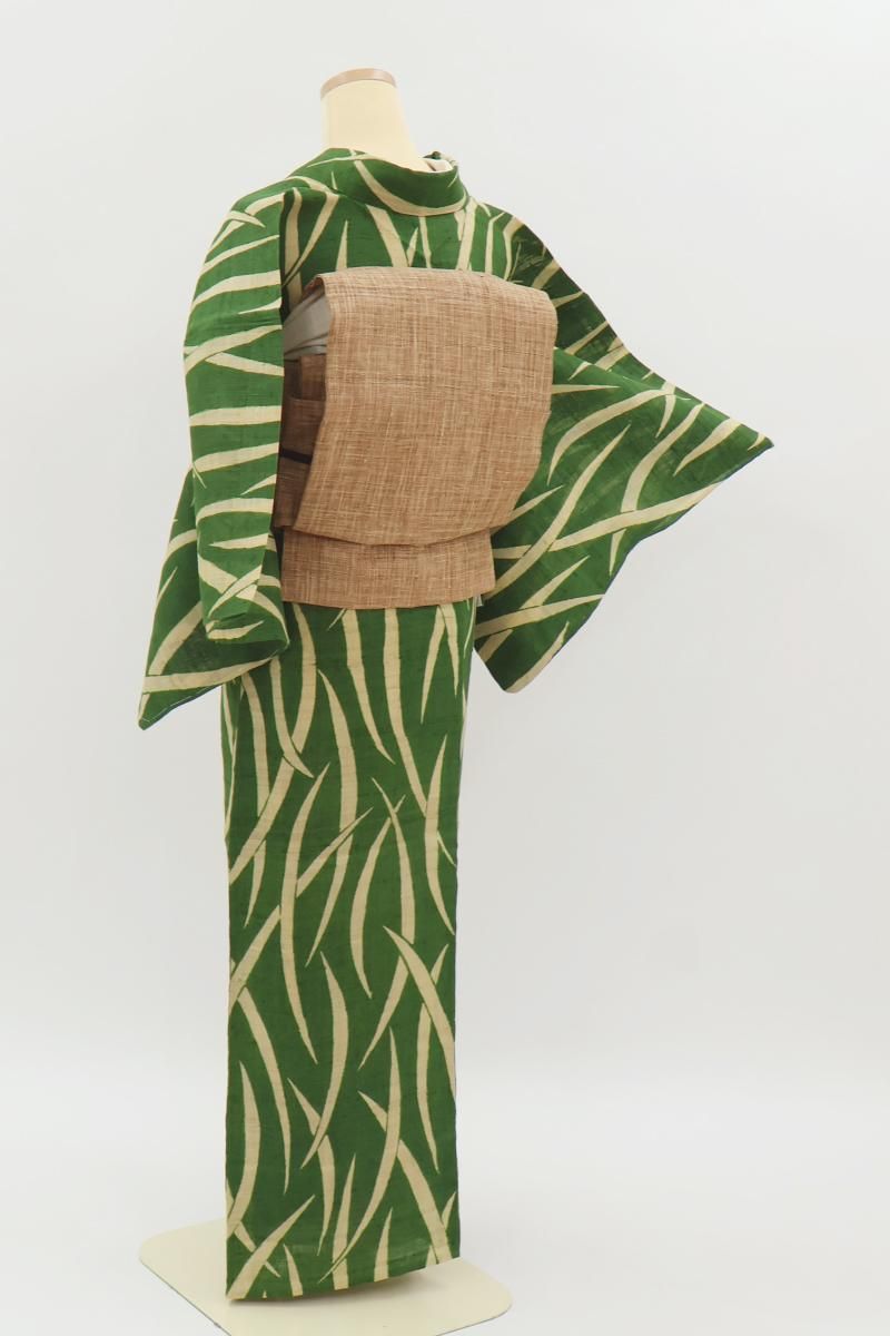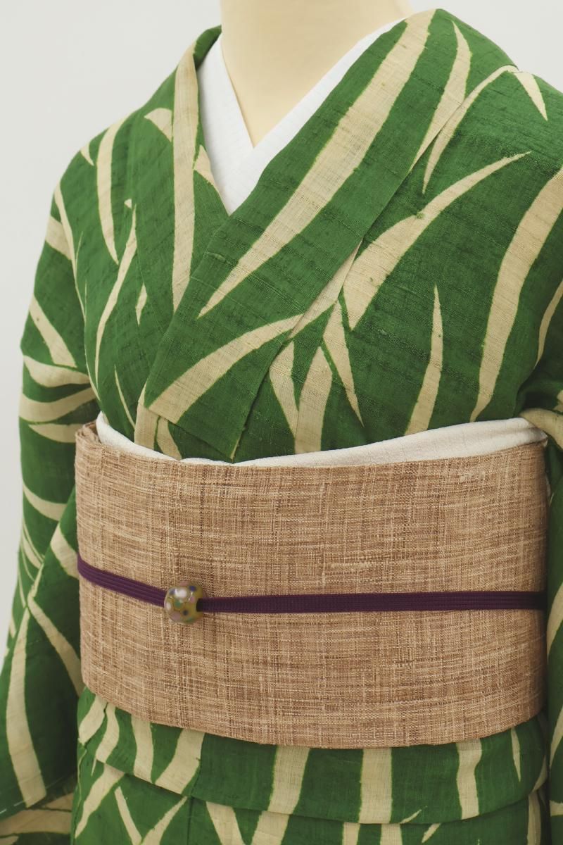 ぐっと色を深めた草色が近いでしょうか、こっくりとした深緑色の地に、型染めでおおらかな植物文を配した夏紬地の小紋です。透け感ゆたかなさっくりとした地風に、色数を絞って表現された意匠がモダンな表情を見せるお品、ぐっと深いお色目が着姿をきりりと粋な印象で引き立ててくれそうですね。季節の染め帯や気軽な八寸などを合わせて、カジュアルな街着やちょっとした集まりなどにいかがでしょうか。