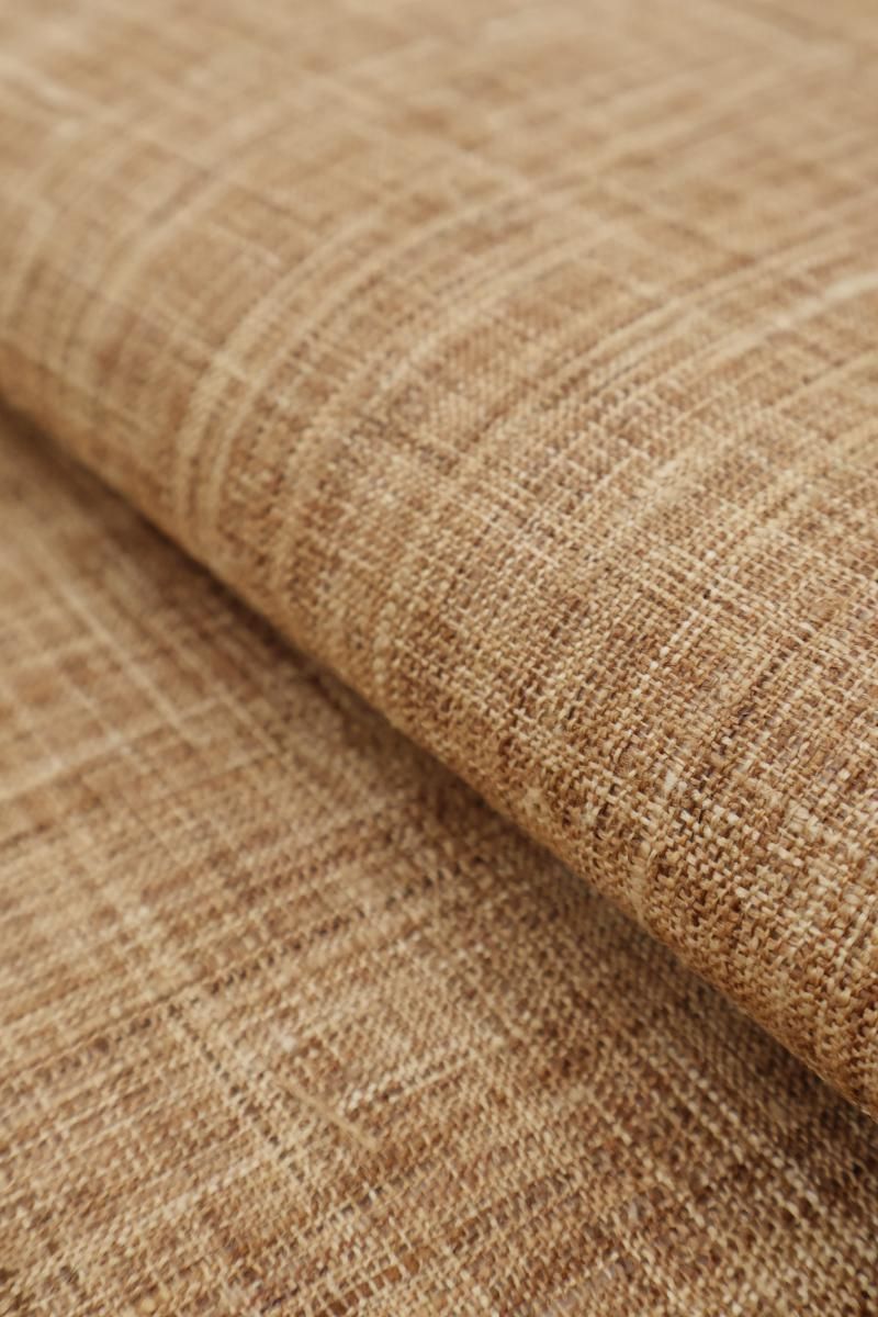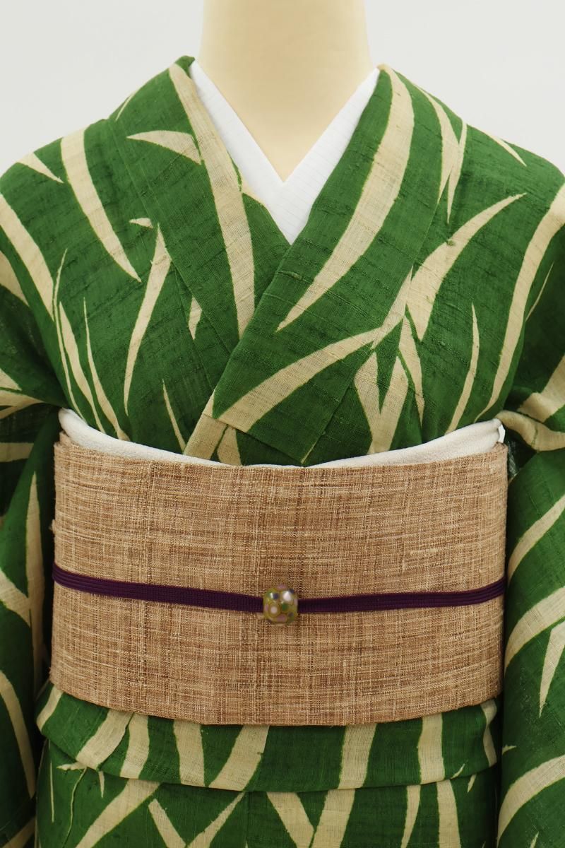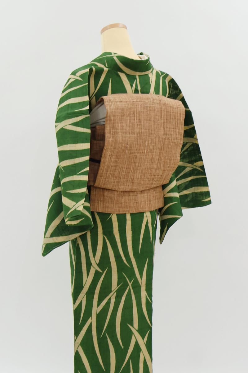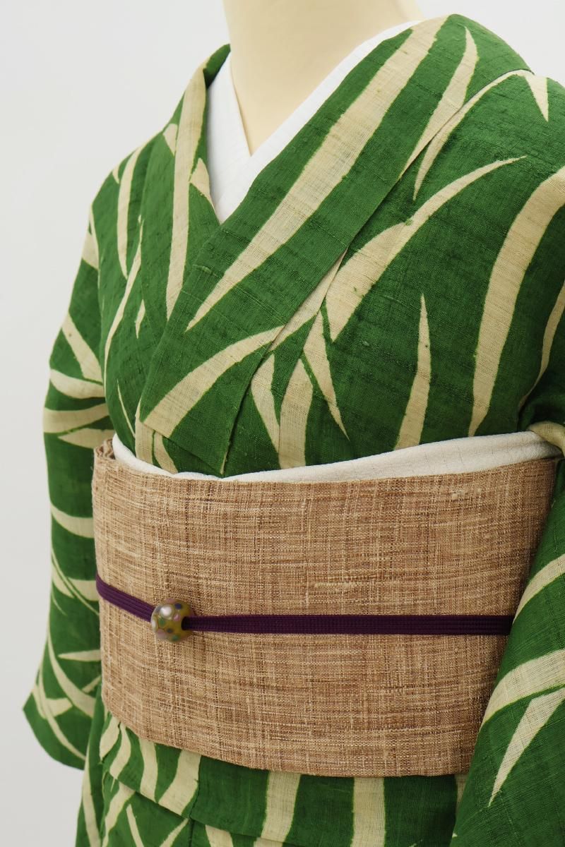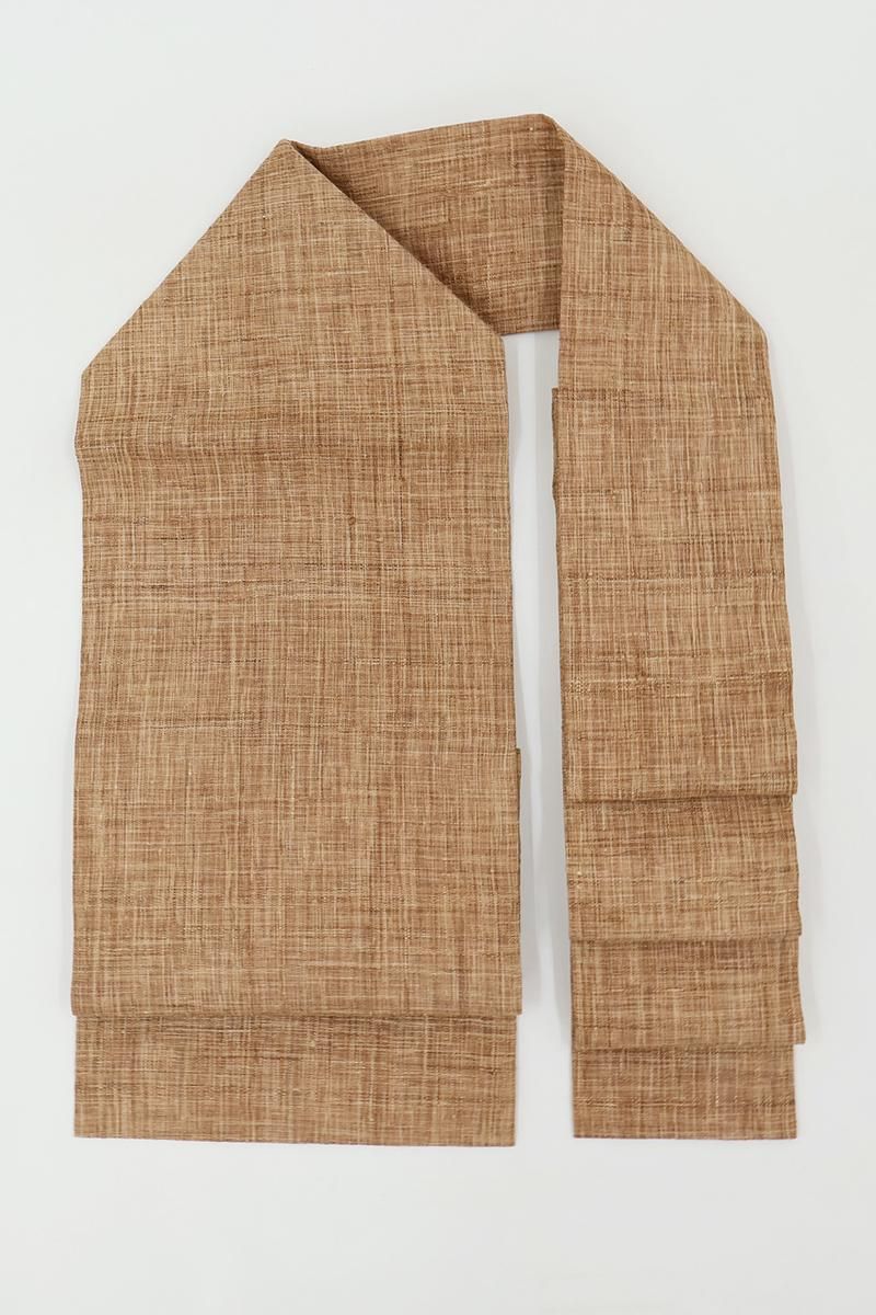 こちらはざっくりとした張りのある風合いが野趣溢れるお品、柿渋染の味わい深い彩りも魅力ですね。夏紬や麻、木綿のお着物などに合わせて軽やかな装いをお楽しみいただけることと思います。お友達とのお出かけやお稽古などにいかがでしょうか。