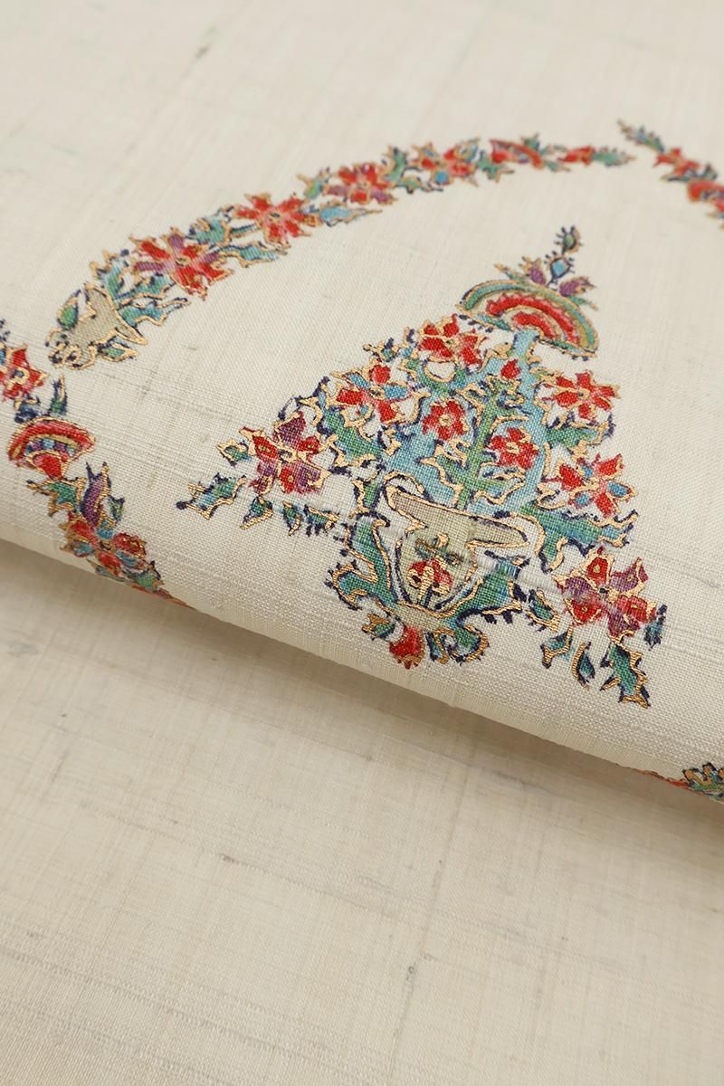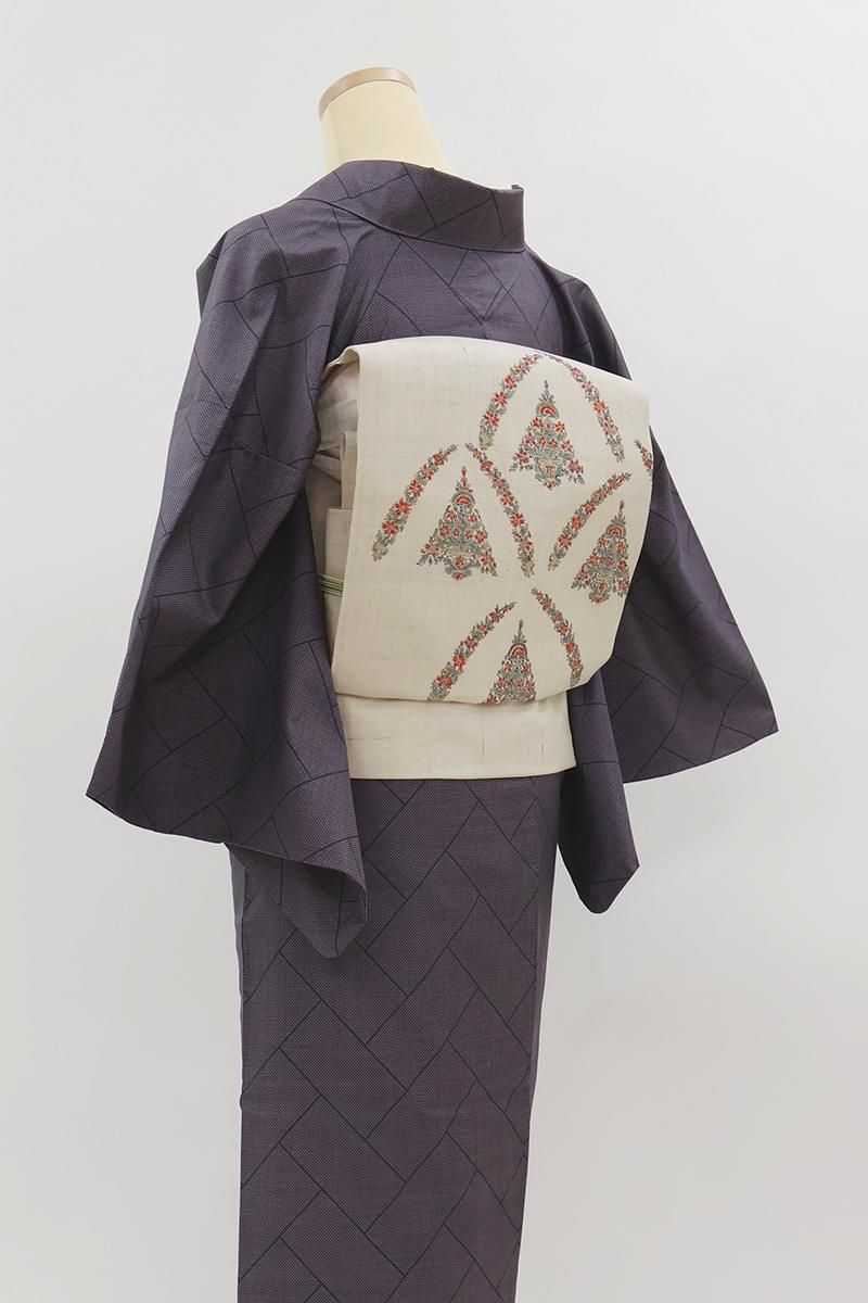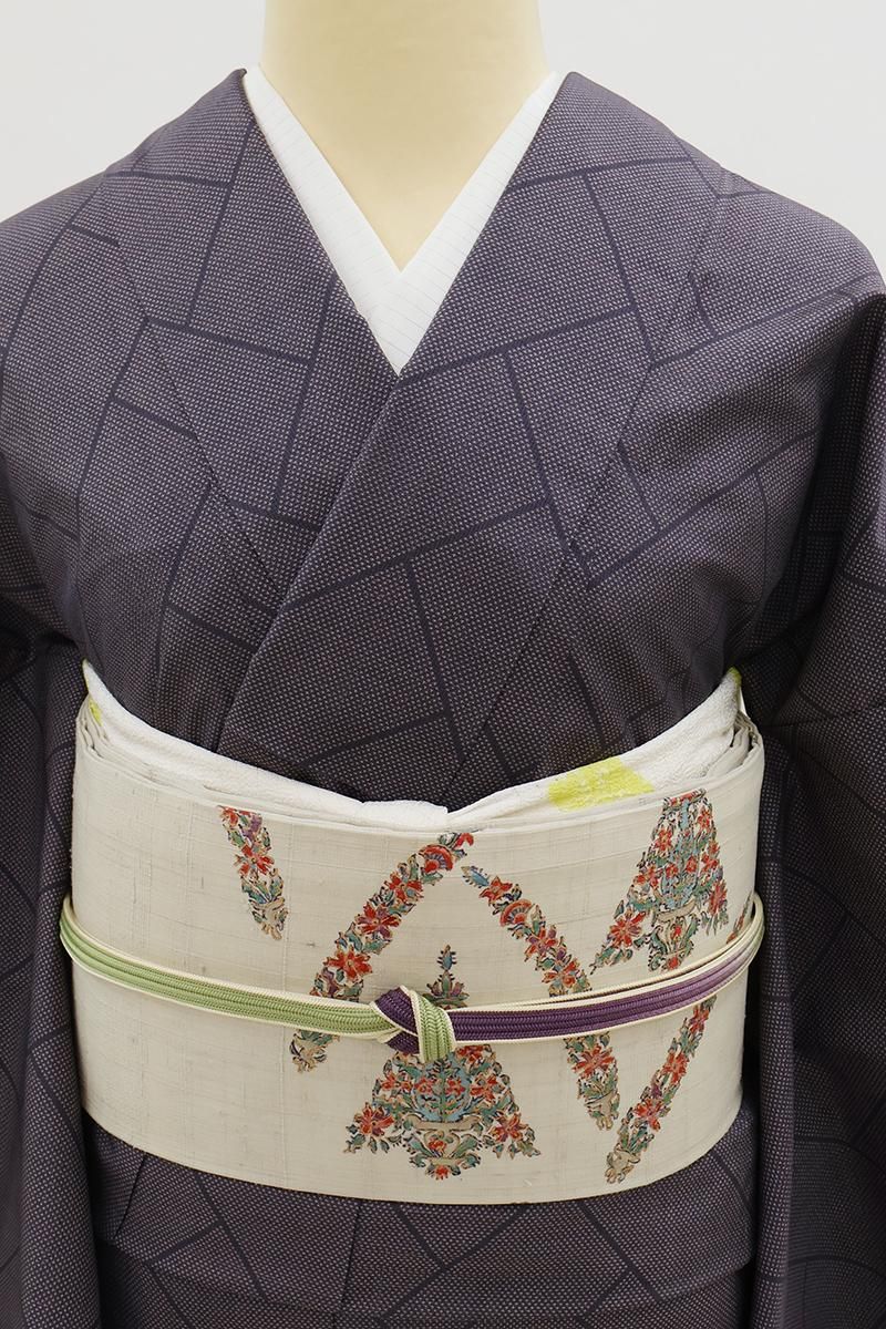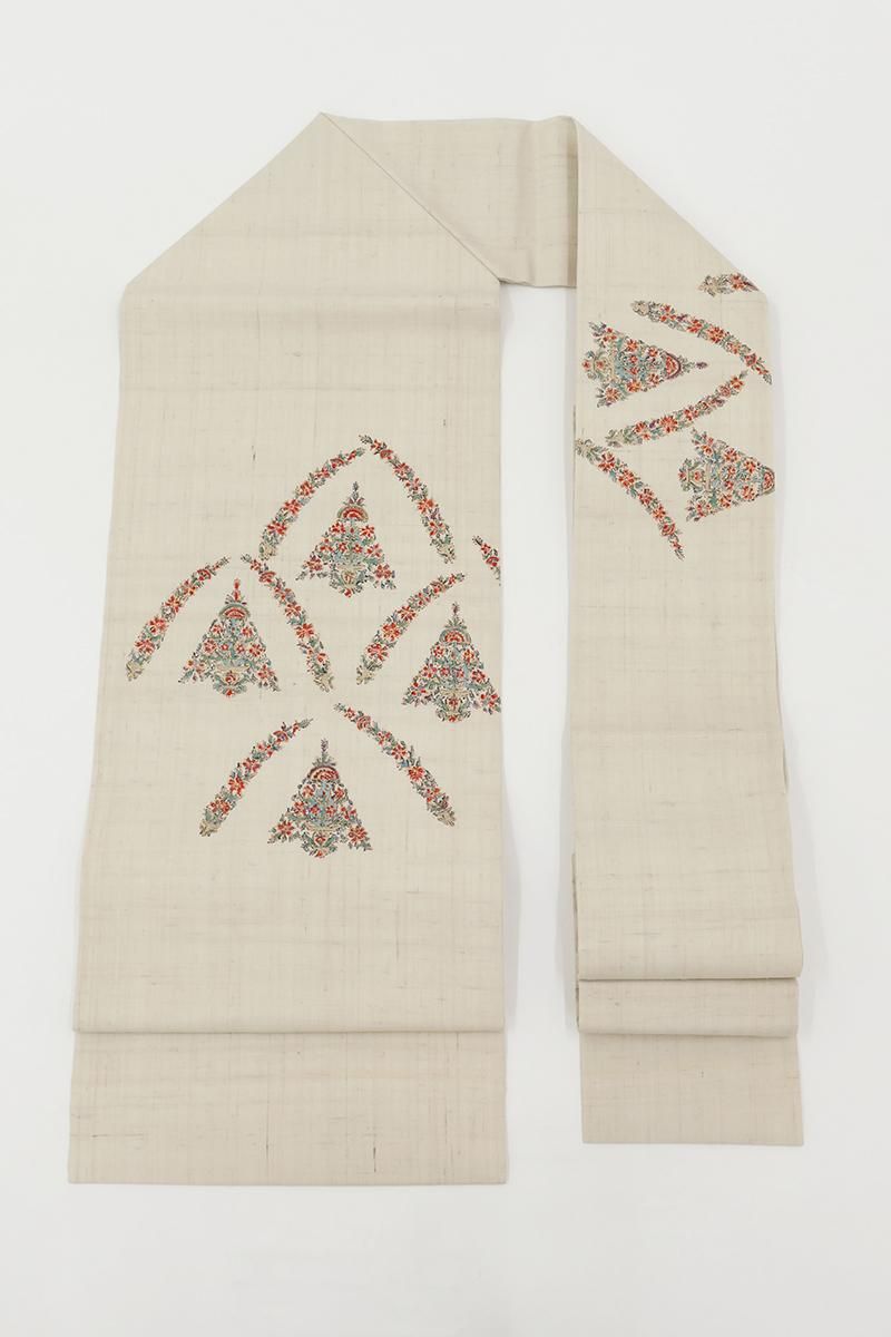 こちらは落ち着いた淡いベージュの薄手の紬地に装飾的な更紗文を描いたお品、繊細な金彩に縁取られた異国情緒あふれる柄ゆきが洗練された印象ですね。季節を選ばず、紬や小紋の装いに独特の洒落みを運んでくれる更紗の帯は、ぜひ良いものを一点をとお探しの方も多いことと思います。単衣の時期にも躍してくれそうなこちら、この機会にいかがでしょうか。