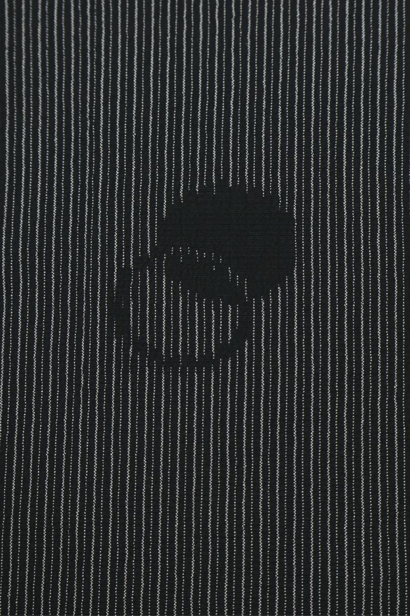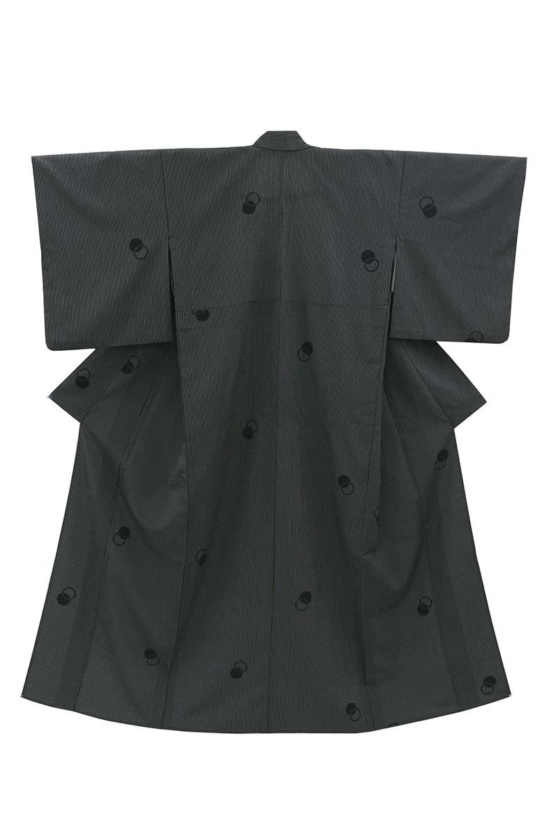 黒色の地に、細やかな縞と重ねた雪輪を配した単衣の本塩沢です。