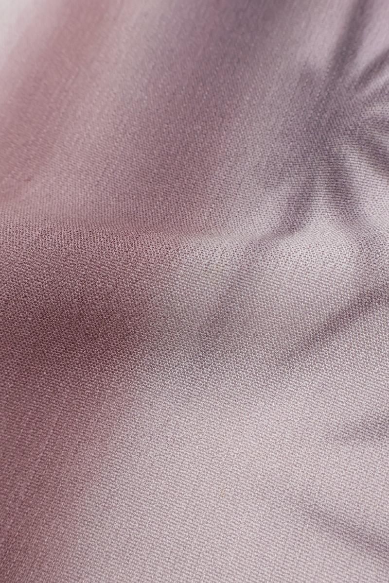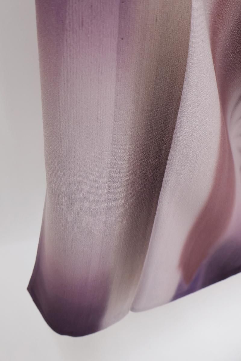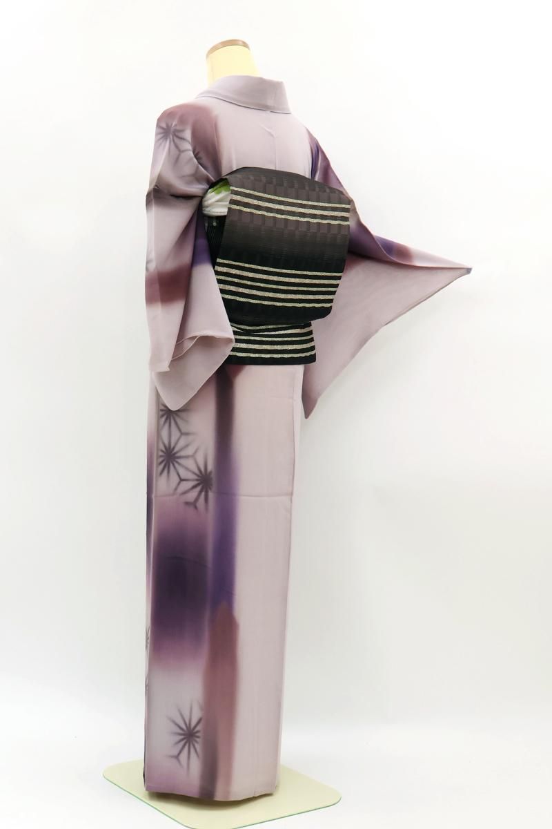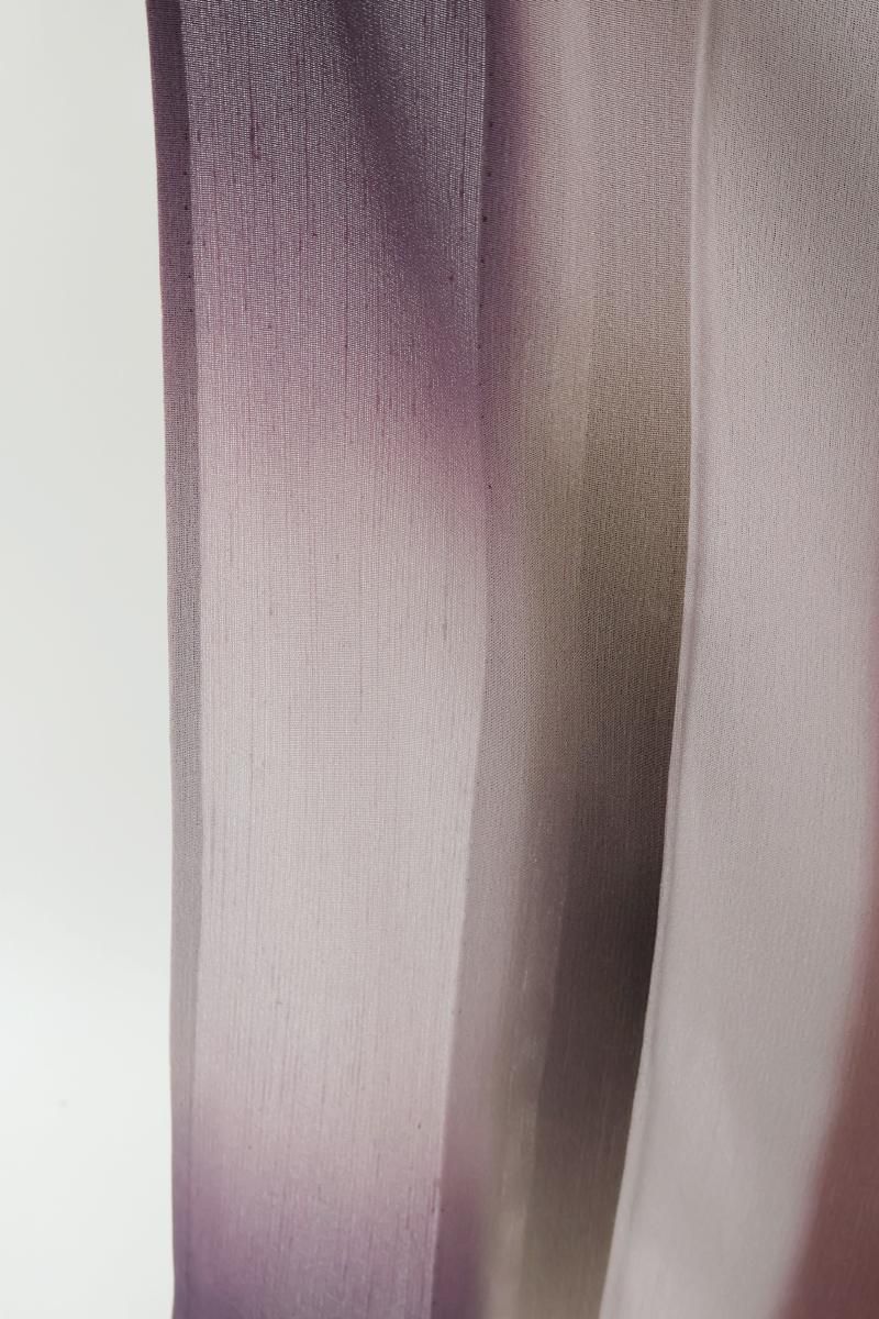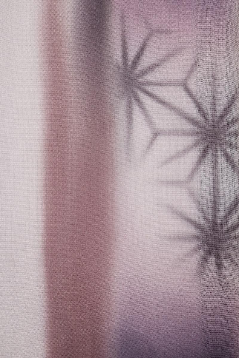 薄藤色が近いでしょうか、ほんのり灰みを感じる薄紫色の地に、濃い紫や赤紫など同系色で竪暈かしを配した薄物の小紋です。