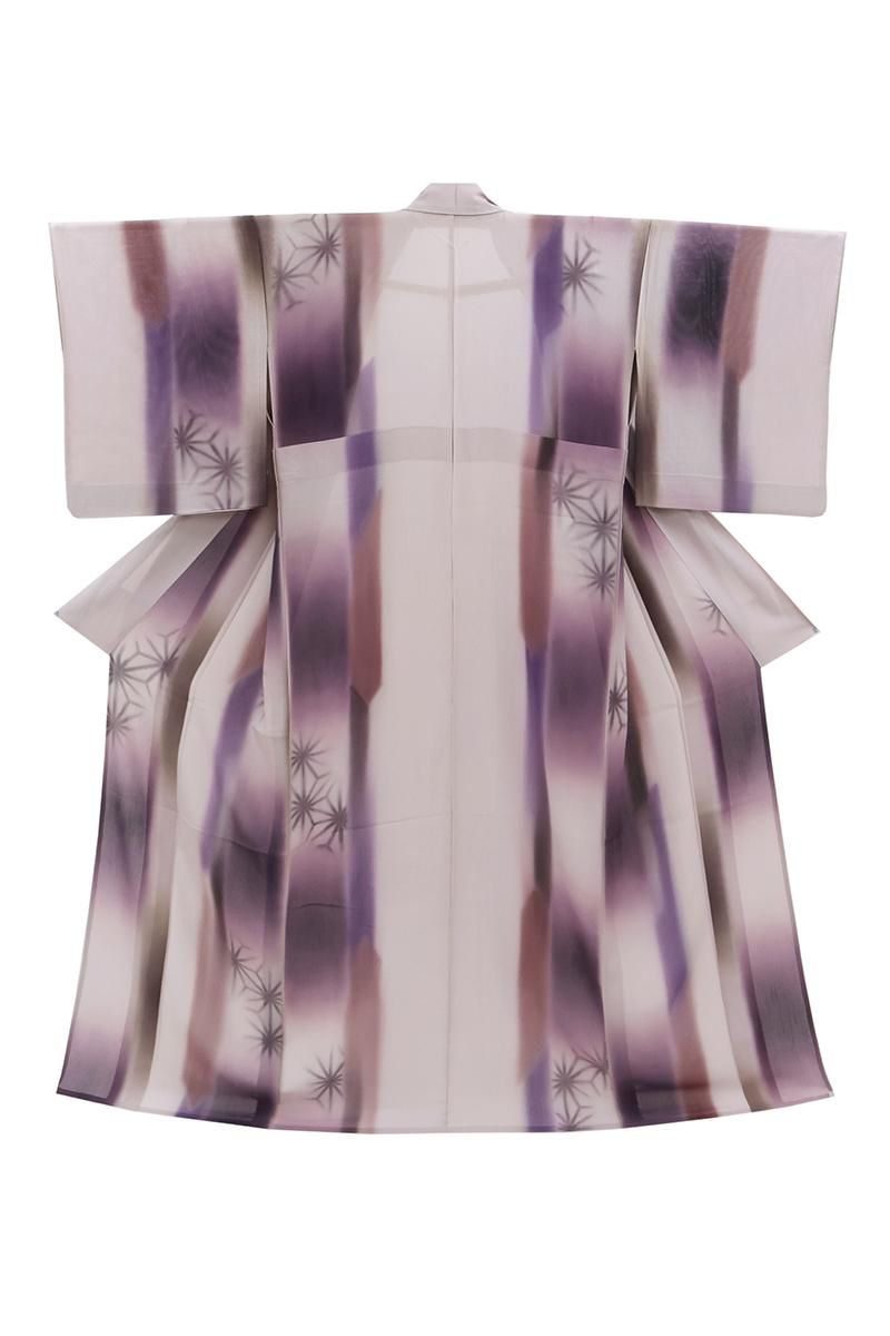 柔らかく軽やかな風合いの地に、濃色でバランスよく場を分け、ポイント的に置かれたおおらかな麻の葉がシックな印象を醸し出すお品、気温の高い時期の装いをすっきりと引き立ててくれそうですね。透け感のある薄物に袖を通す楽しみは夏だけのもの、季節の染め帯や八寸帯などと合わせて風情ある一枚をぜひお楽しみくださいませ。