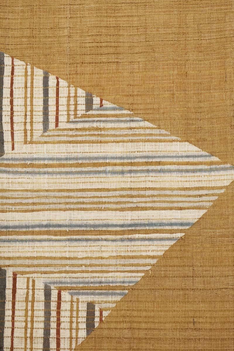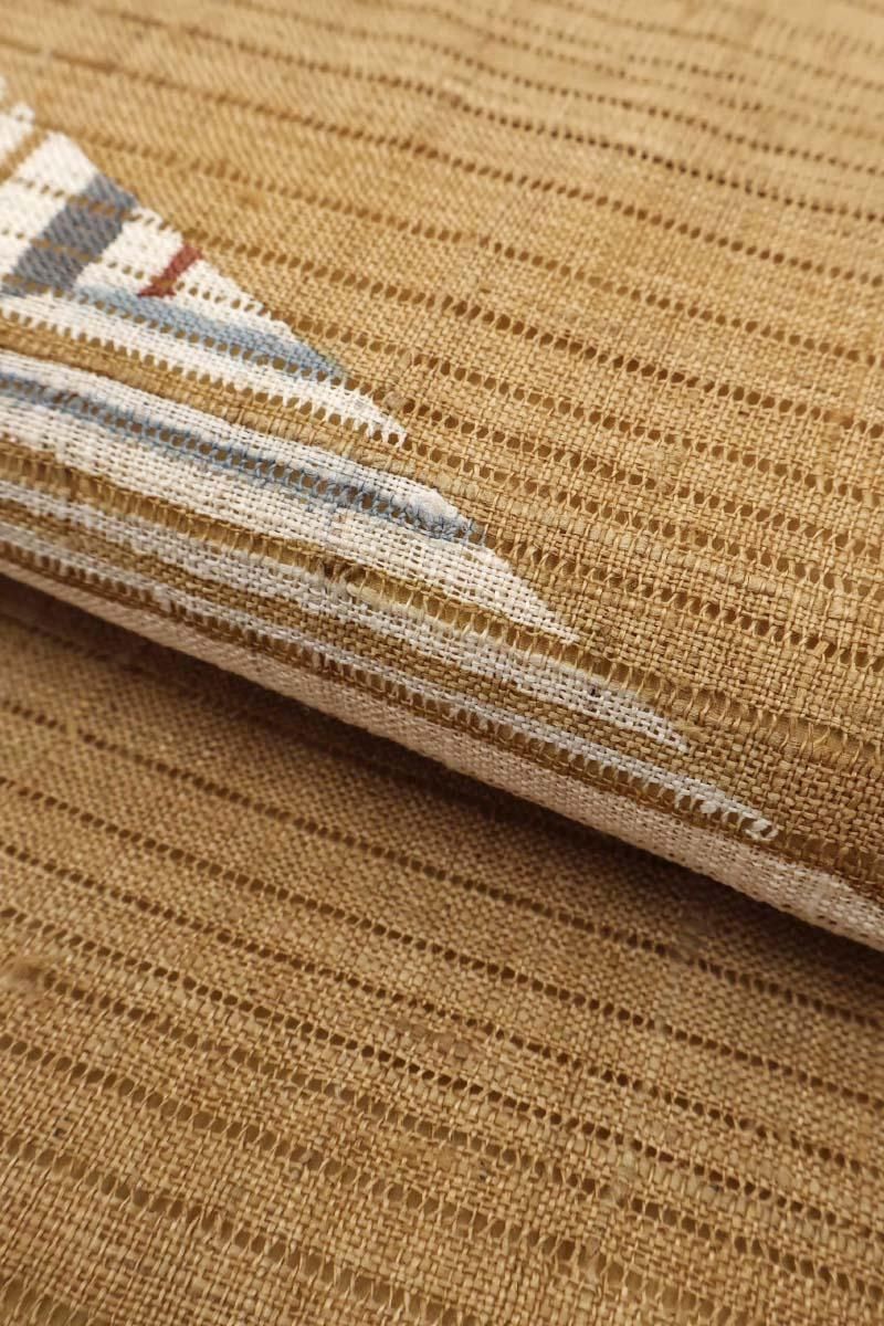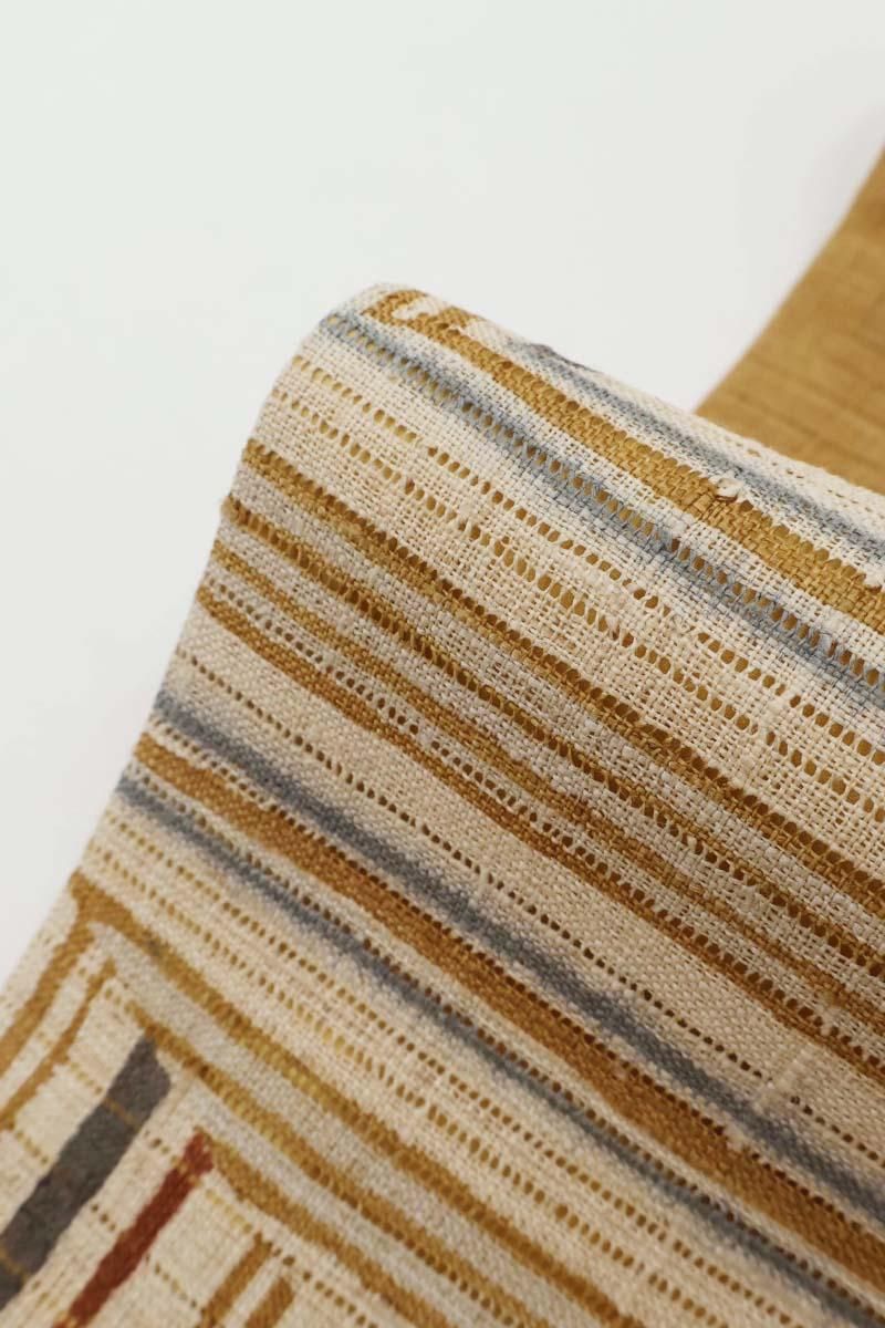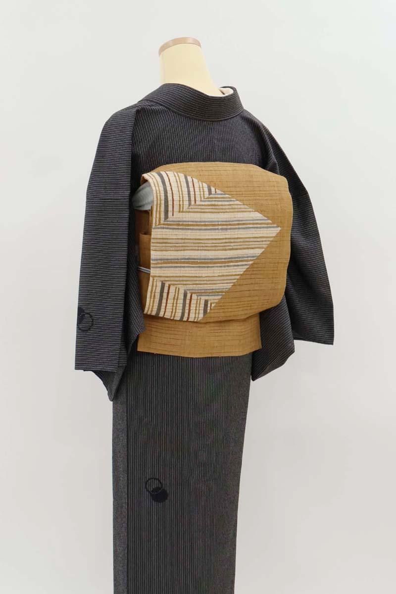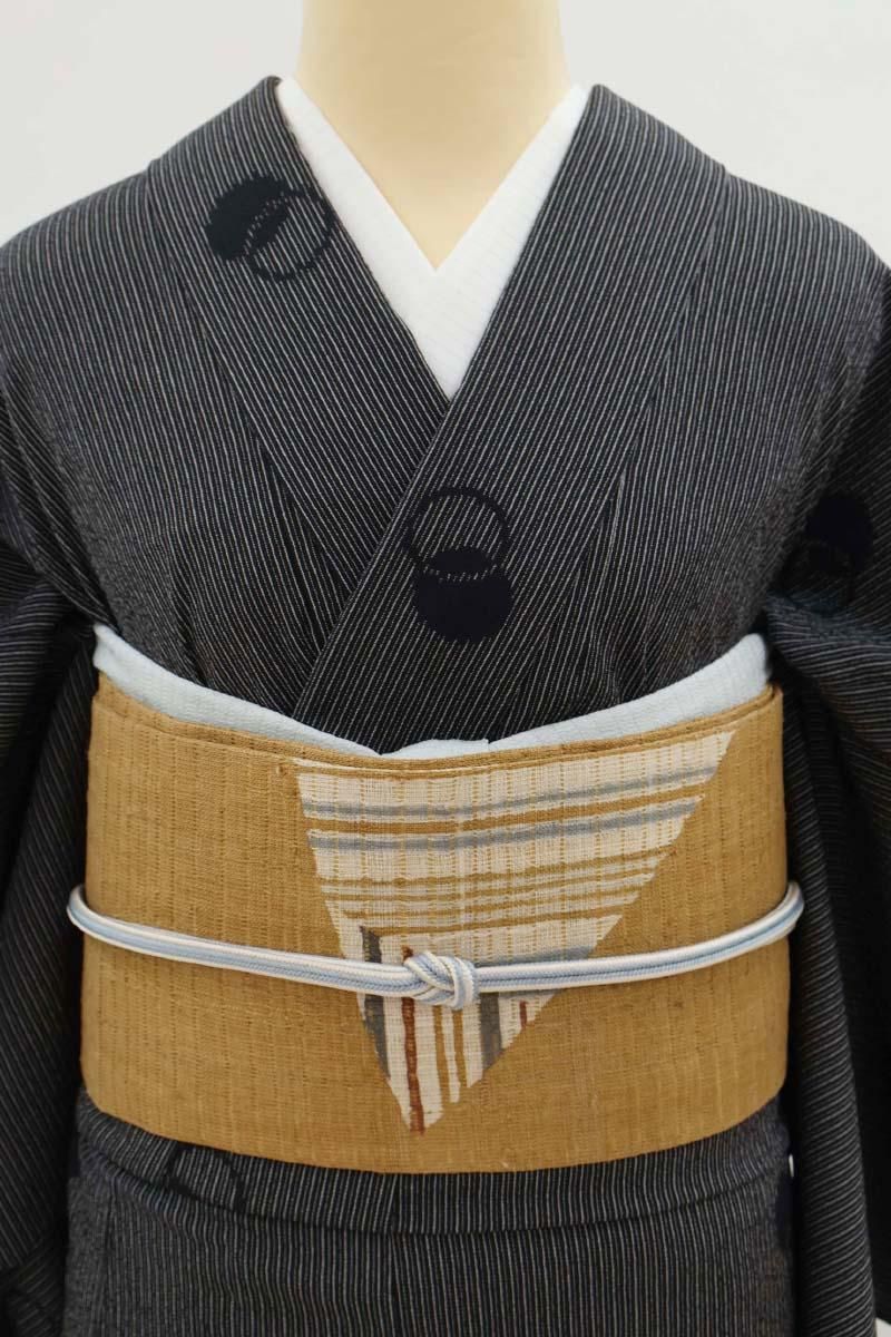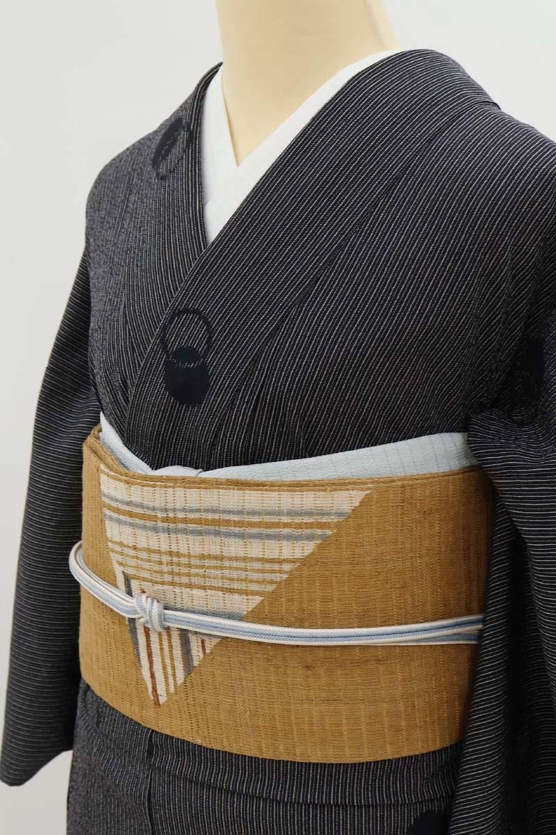 さっくりと織られた絽目のある紬地に染めのラインでモダンな印象に仕上げたお品、着姿を大人らしい洒落みを添えて引き立ててくれることと思います。黄色の帯芯を使用していますので帯心の色が外側に響かない配慮も嬉しいですね。夏紬や小紋、木綿の着物などと合わせて夏のお出かけにいかがでしょうか。