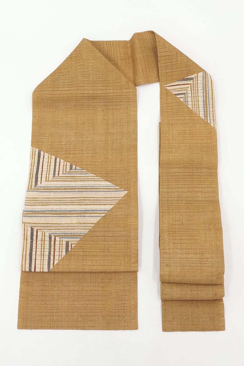 黄土色が近いでしょうか、明るいキャメル色の地に直線を用いて抽象的な文様を配した絽紬地の染名古屋帯です。