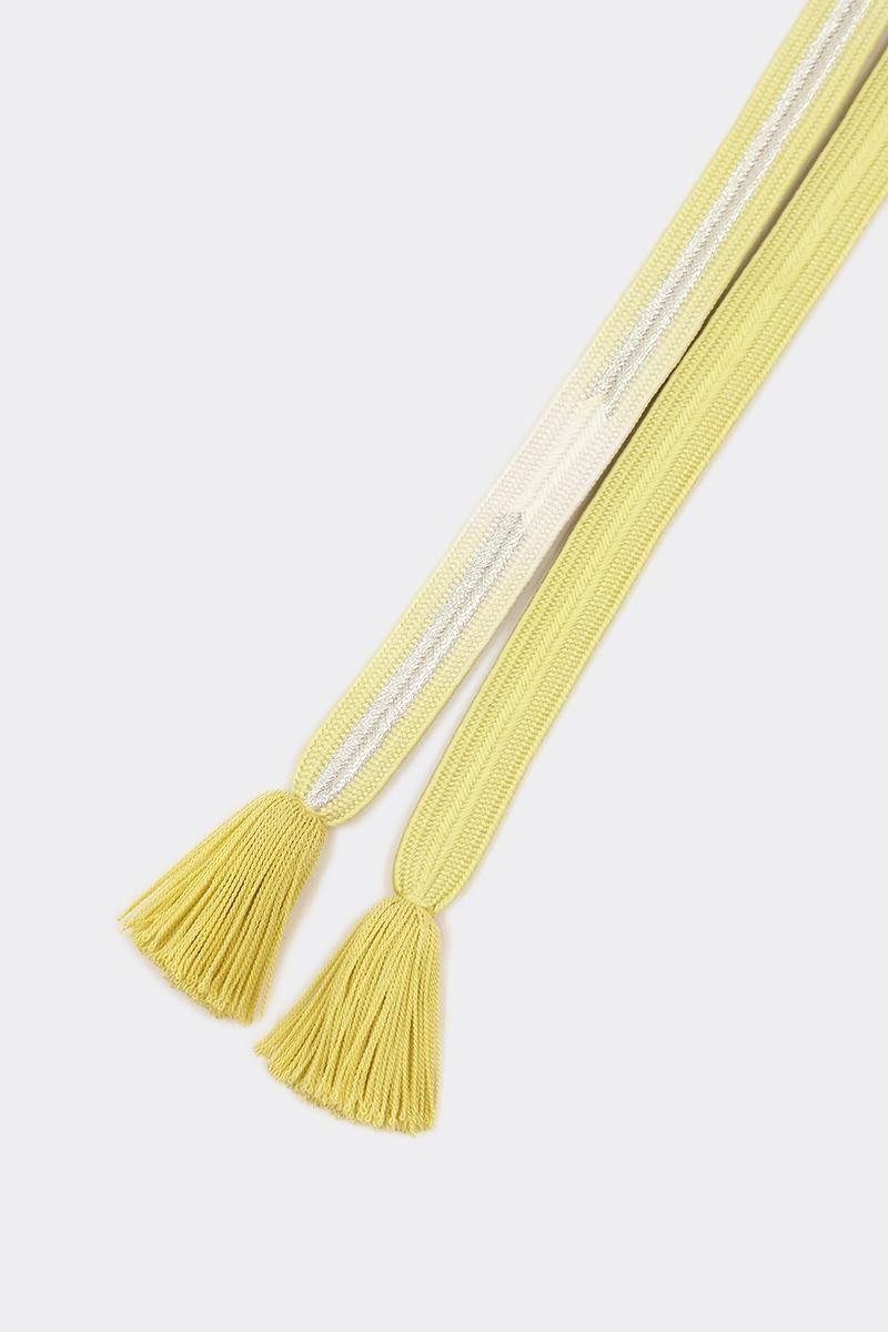 こちらは高麗組の内側に大和組を組み込んだ、やや幅の広めな組みのお品。銀糸の煌めきが装いに上品な華を添え、重みのある袋帯もしっかりと受け止める静かな格調を備えています。お色は淡い黄色、結び目で交差する白と銀のアクセントが効いた一品です。しなやかで安定感のある締め心地の手組のお品、この機会にぜひ、お手元にてご覧くださいませ。