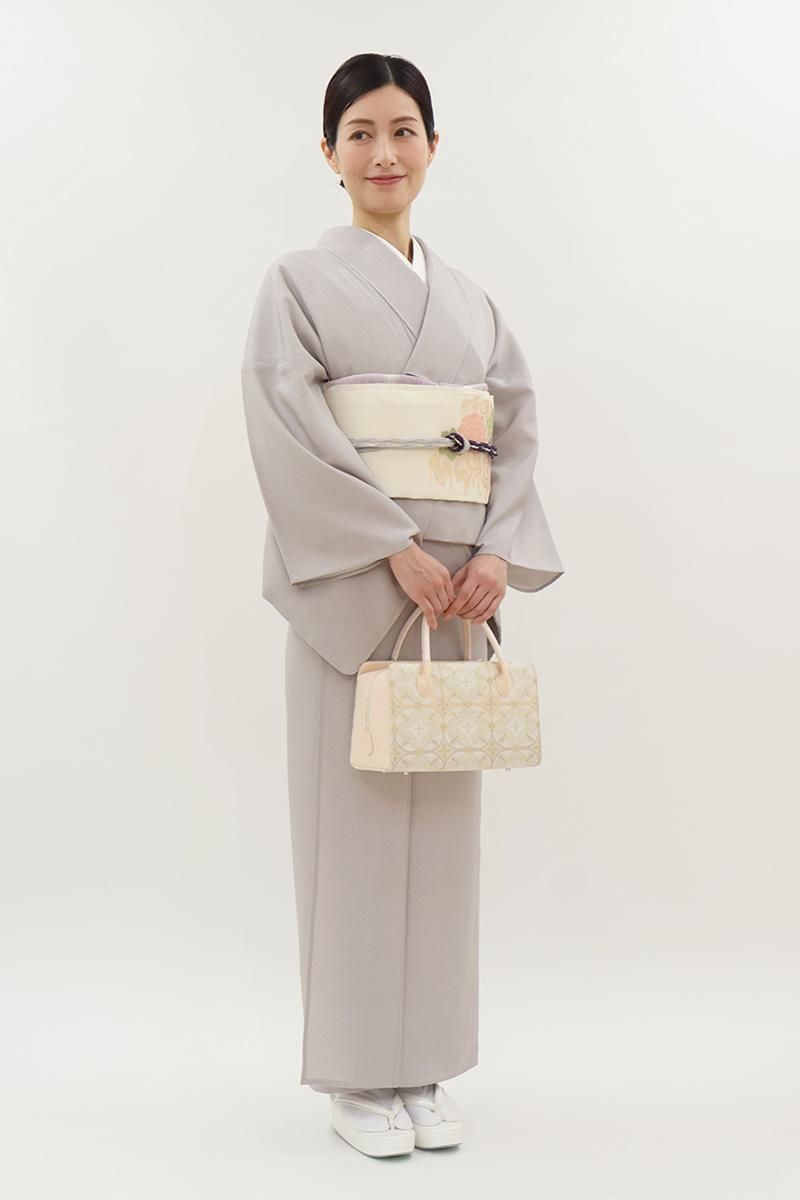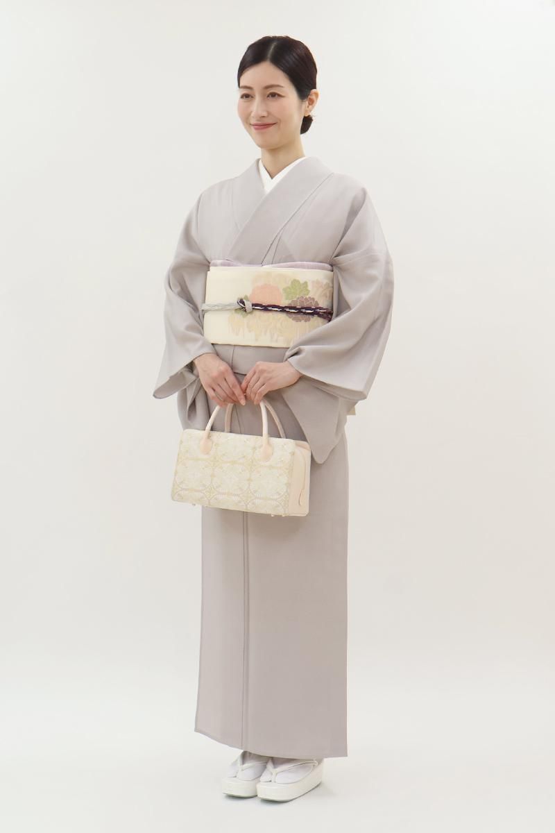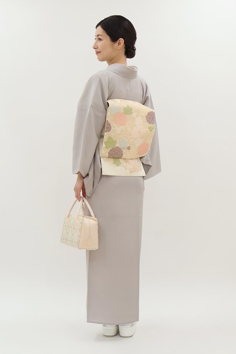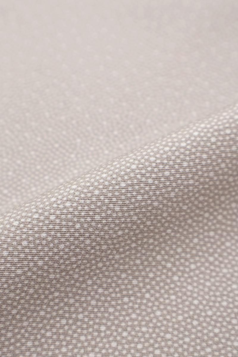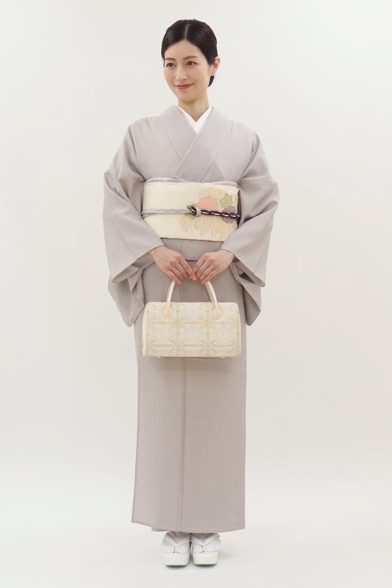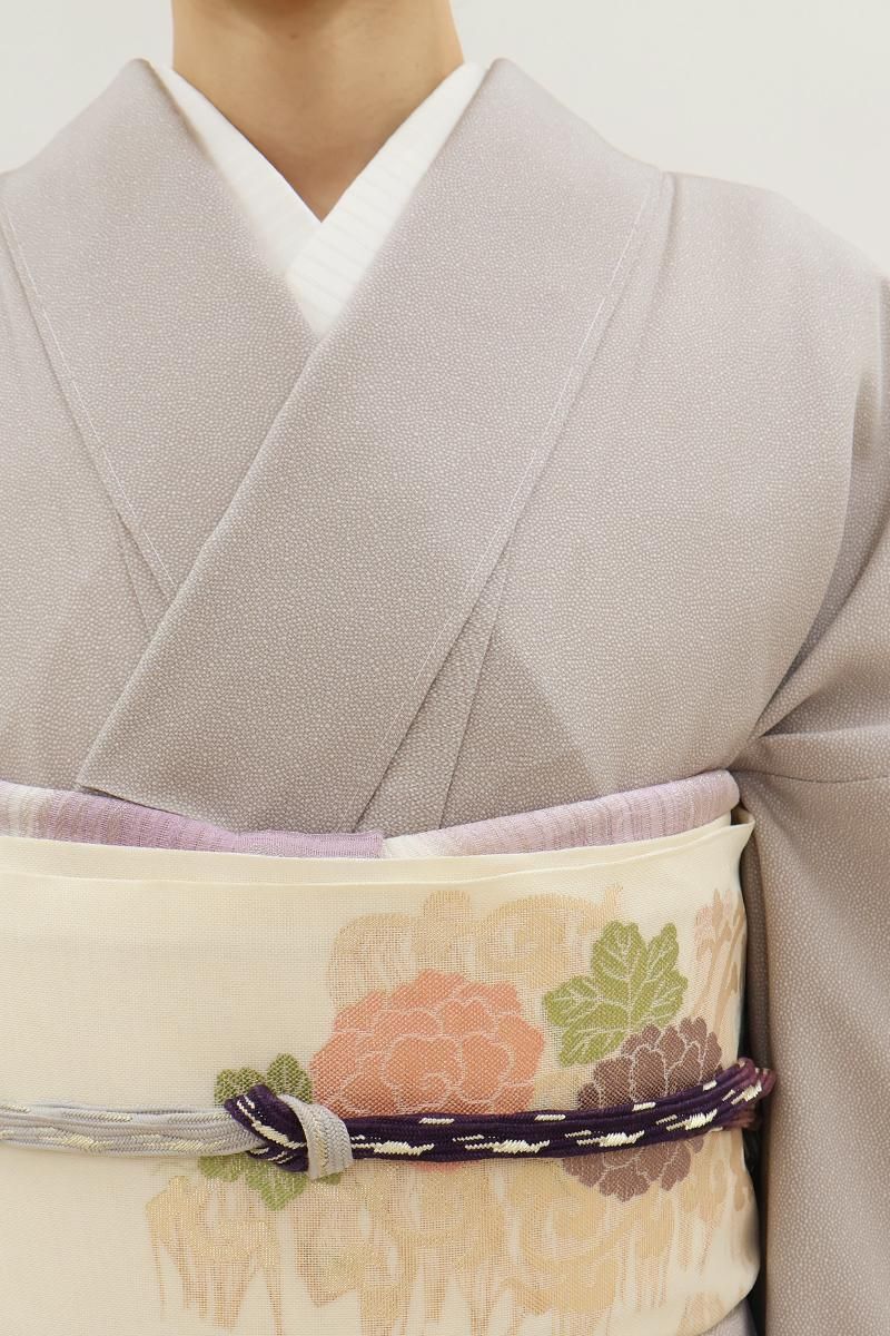 桜鼠色が近いでしょうか、淡いグレーベージュ系の地に、江戸小紋五役の中でも根強い人気がある大小霰文を染めた単衣の江戸小紋です。こちらは程よく落ち着いたやさしいお色目が軽やかな大人の着姿を演出するお品、粋でありながら霰がキュートな文様は、愛らしくカジュアルな装いから格のある装いとして様々なシーンにお召しいただけますね。これからの季節のお出かけに重宝な一枚をいかがでしょうか。
