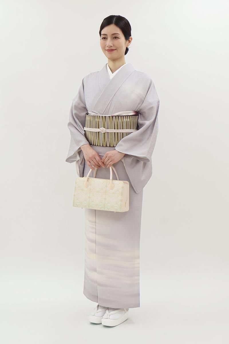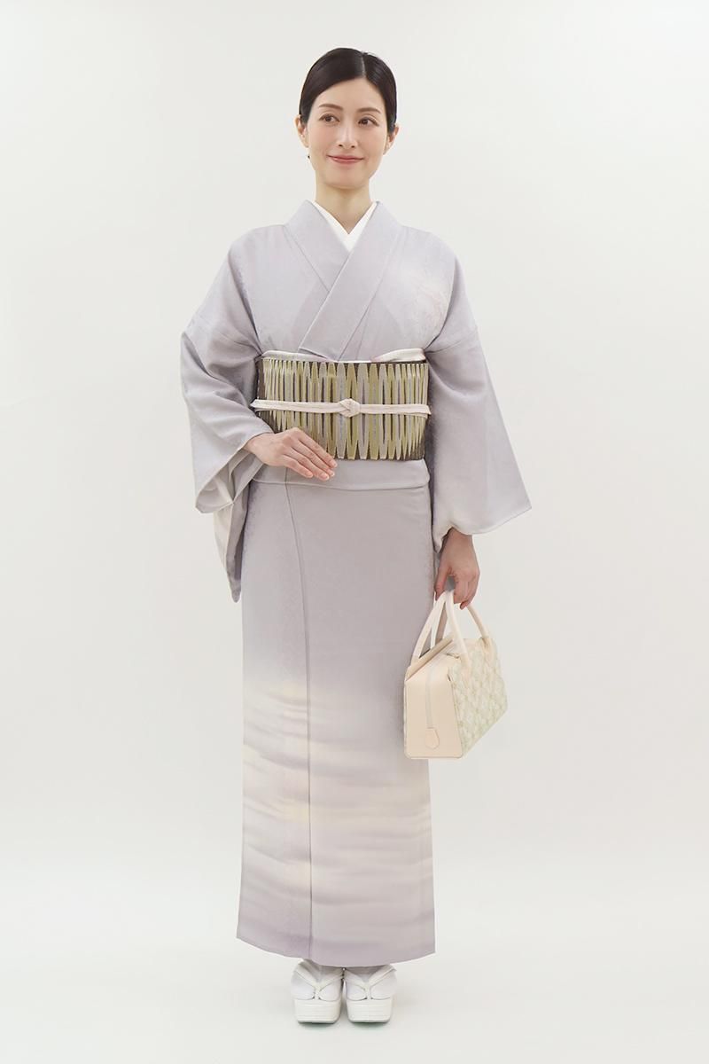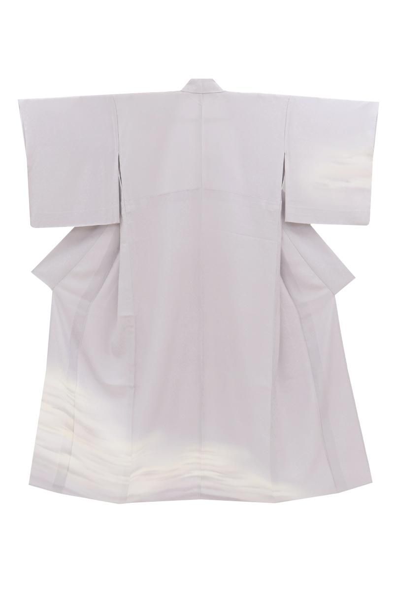 色を薄めた藤鼠色が近いでしょうか、灰みの強い薄紫色の地にふんわりと霞暈かしを配した単衣の付下げです。こちらは光の加減で花喰い鳥の地紋が浮かぶほのかな光沢を帯びた地風が品良い華やぎを添えるお品、しっとりとした女性らしいお色目のシンプルな一枚は帯合わせも様々に、合わせる帯次第で幅広い場面にお使い頂けそうですね。観劇やお食事会、お茶席など少し改まったお席などにいかがでしょうか。