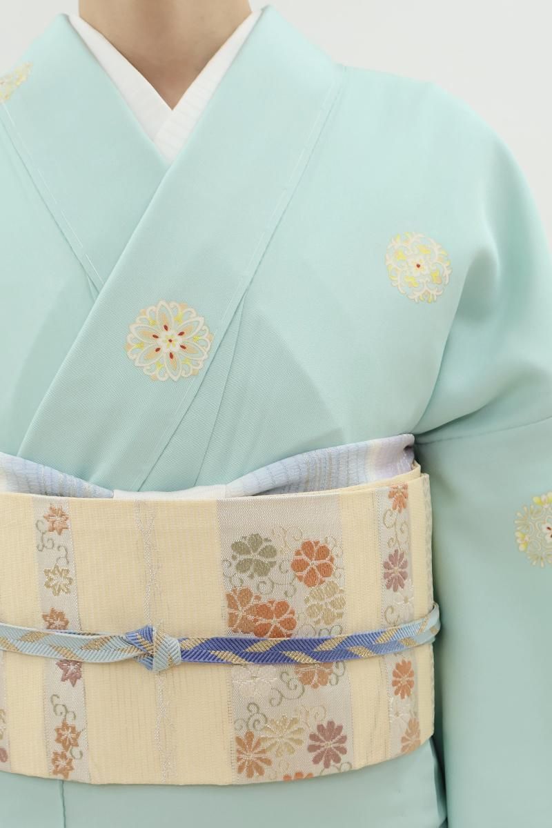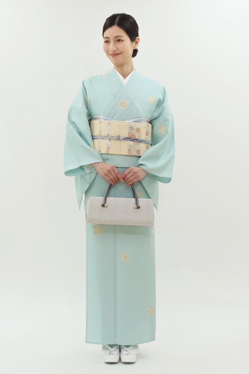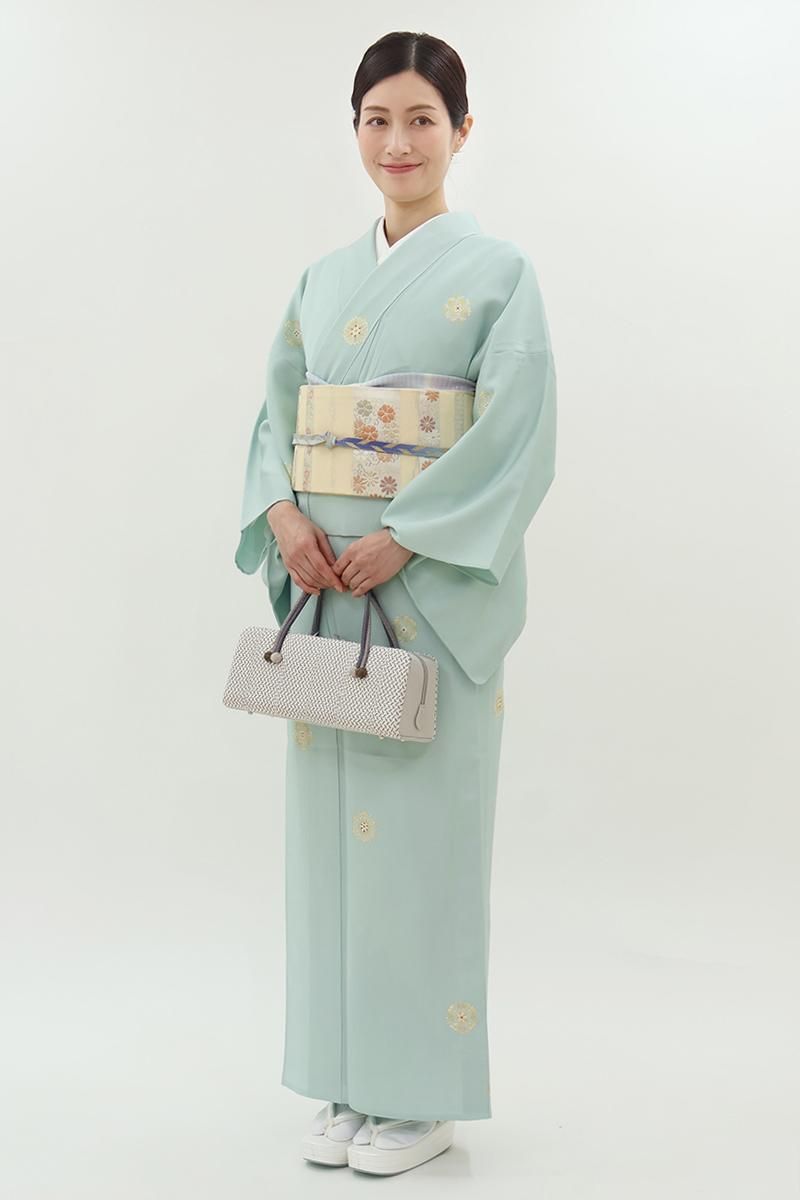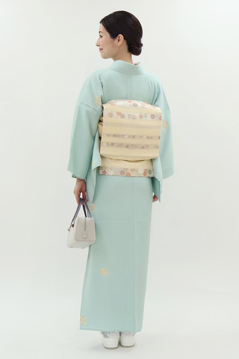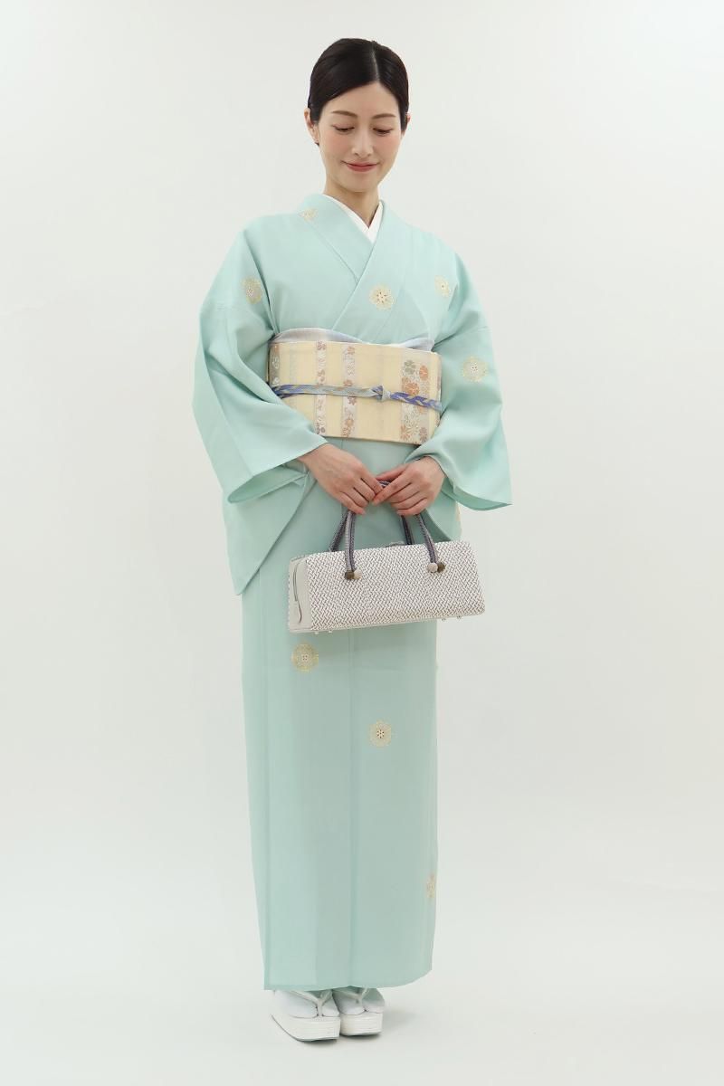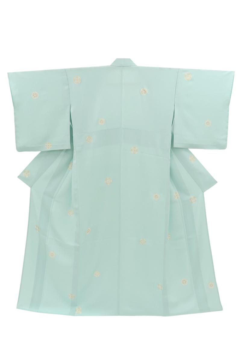 こちらはさらりとした地風の爽やかなお色目に、ぽんぽんと配された装飾的なモチーフに大人の可愛らしさが光る一枚、無地場の多い控えめな柄置きですので華やかな帯とも相性良く合わせて頂けることと思います。季節の染め帯から格高の名古屋帯、軽めの袋帯などを合わせて、お食事会や観劇、ちょっとした集まりなどに洗練された装いをいかがでしょうか。