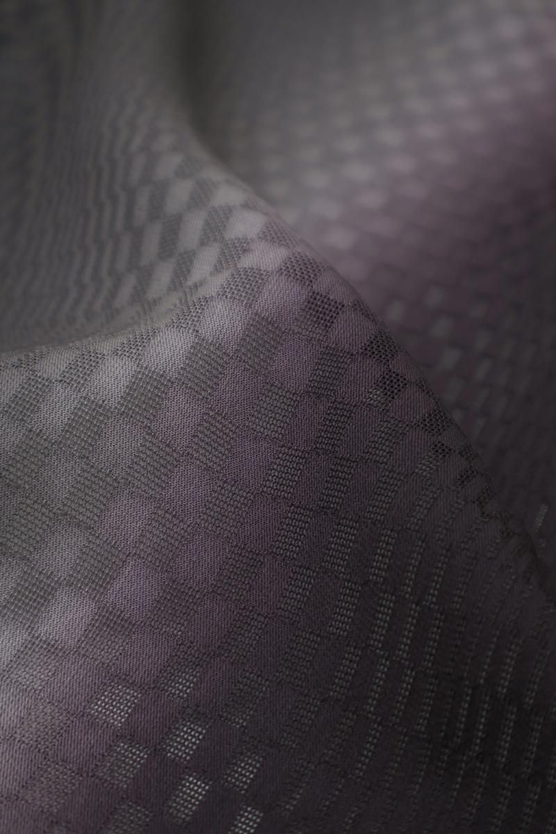 全体の印象としては黒紫色が近いでしょうか、細やかな市松の地紋を織りだしたごく深い紫色の地に、濃淡で竪暈かしを配した紋紗の和装コートです。透け感ゆたかなさっくりとした地風が品良い着姿を演出してくれそうなお品、無地感覚のシンプルな色柄ゆきですのでどんなお着物にもすっと寄り添ってくれそうですね。防寒が不要の夏期でもやはり、塵除けや雨除けとして一枚コートを羽織って頂くと、様々な汚れから着物や帯が護られます。ぜひこの機会にご用意下さいませ。