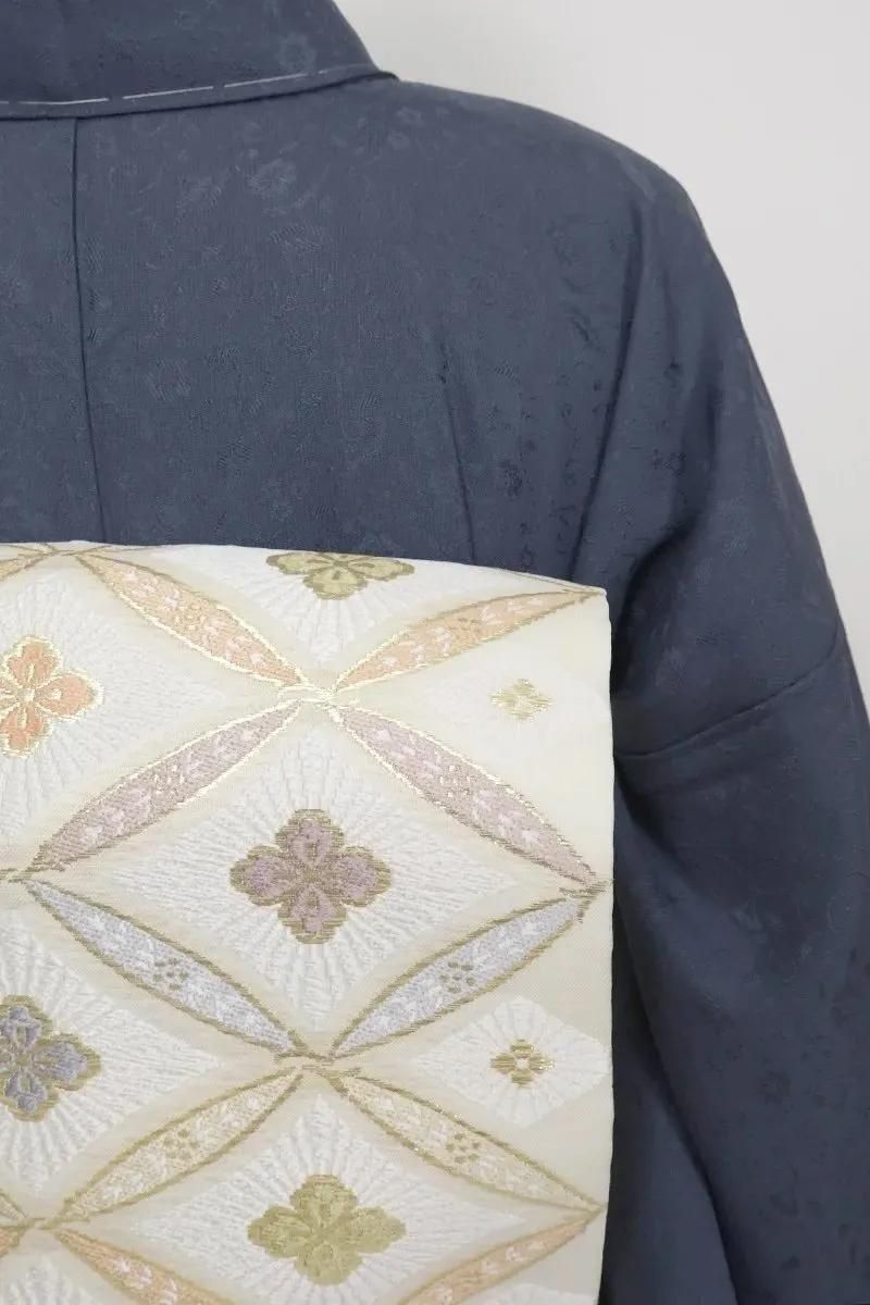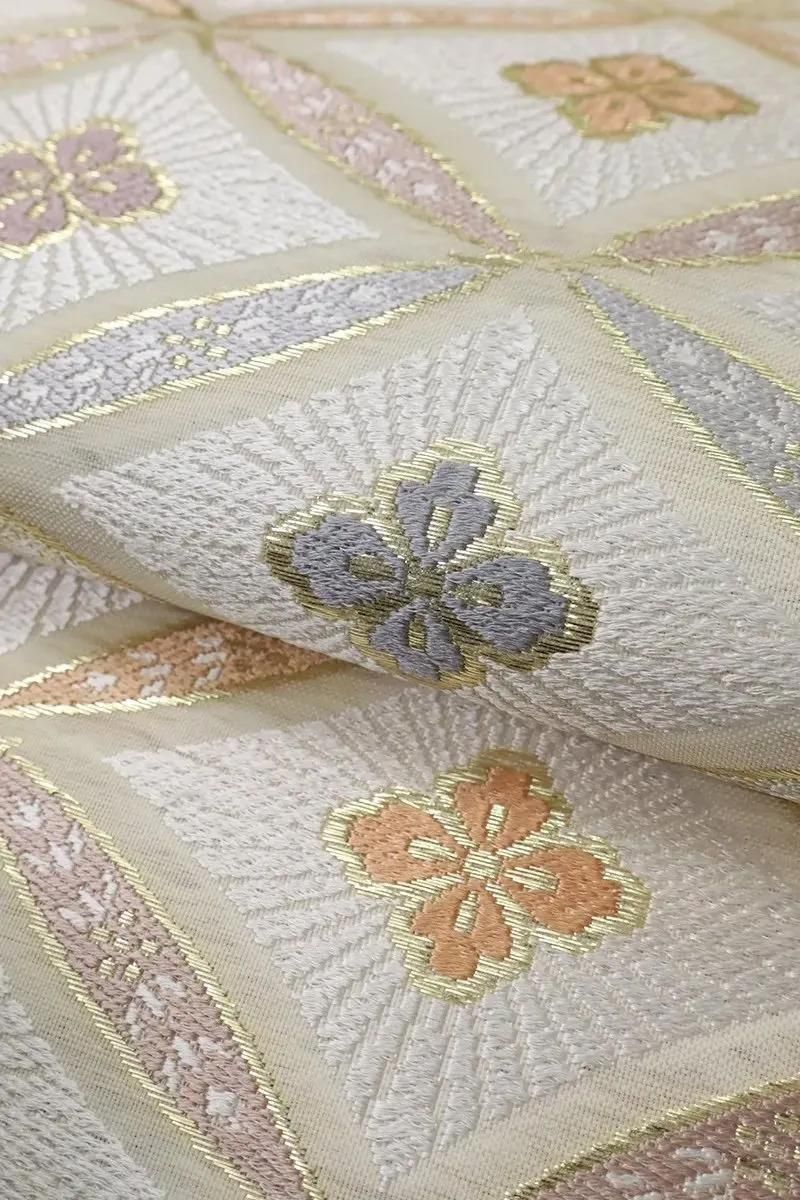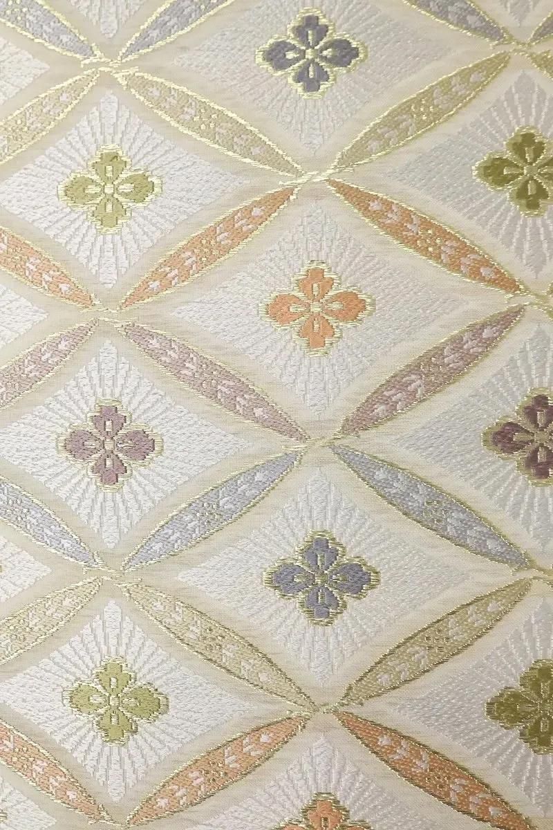 こちらはさっくりとした地風のホワイトベージュの地に七宝花菱文を織りだしたお品、パステルカラーと金糸をふんだんに用いて表現された古典意匠が気品豊かな表情を見せていますね。色無地や付下げなどの装いを涼やかに引き立ててくれることと思います。夏のお出かけや改まったお席などにいかがでしょうか。