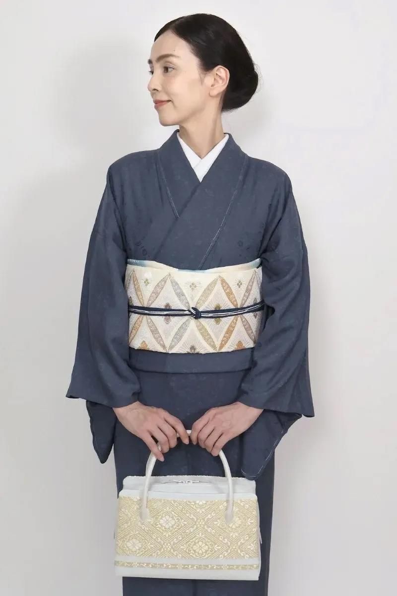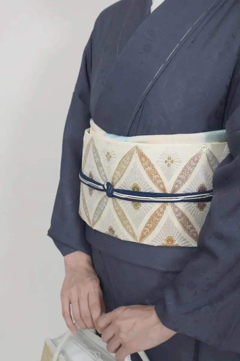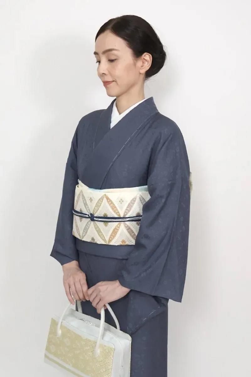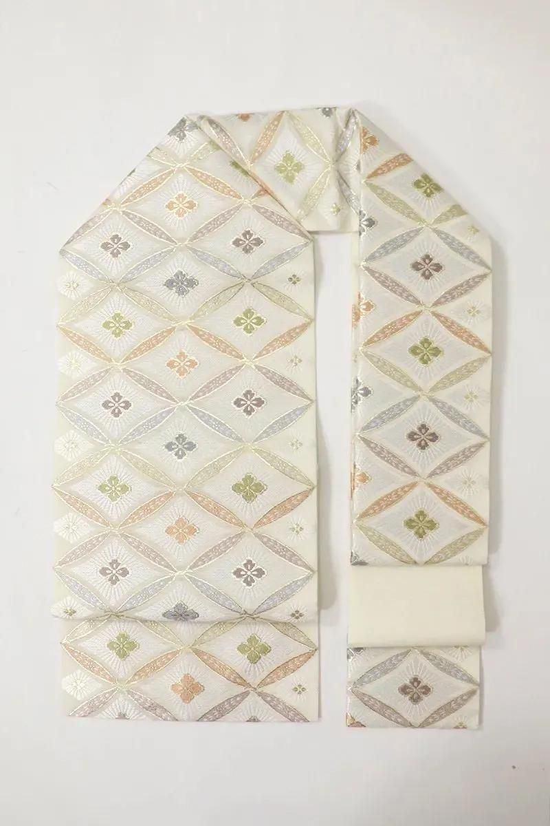 こちらはさっくりとした地風のホワイトベージュの地に七宝花菱文を織りだしたお品、パステルカラーと金糸をふんだんに用いて表現された古典意匠が気品豊かな表情を見せていますね。色無地や付下げなどの装いを涼やかに引き立ててくれることと思います。夏のお出かけや改まったお席などにいかがでしょうか。