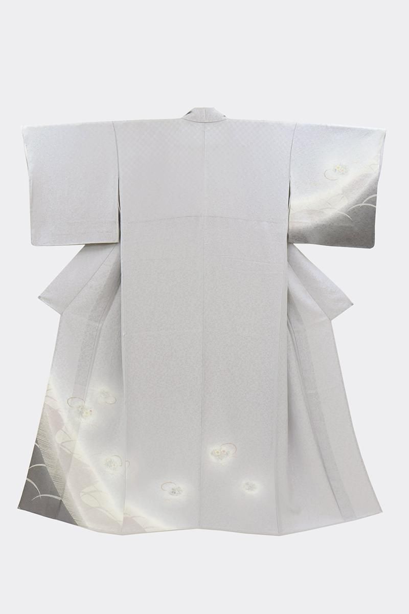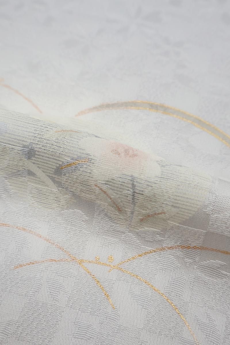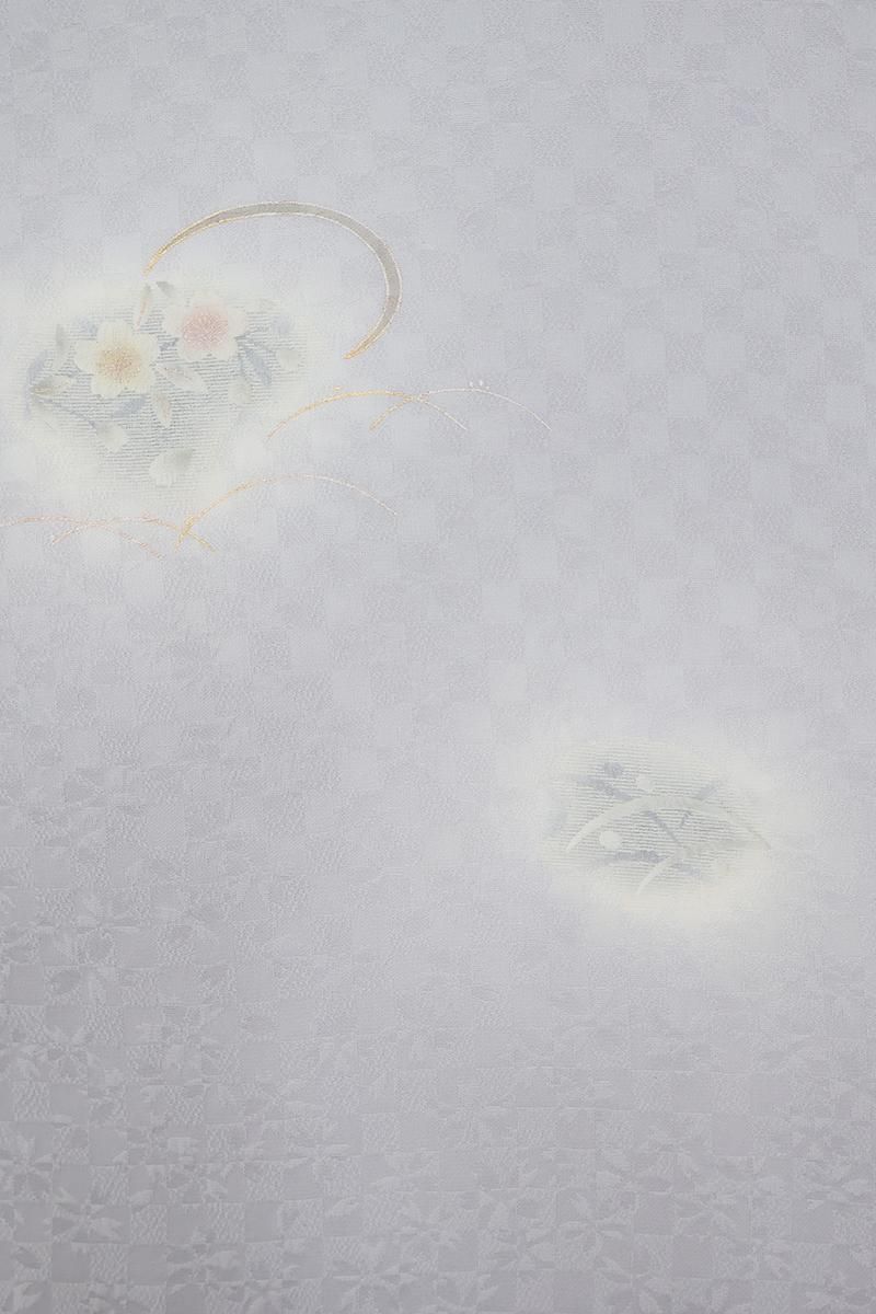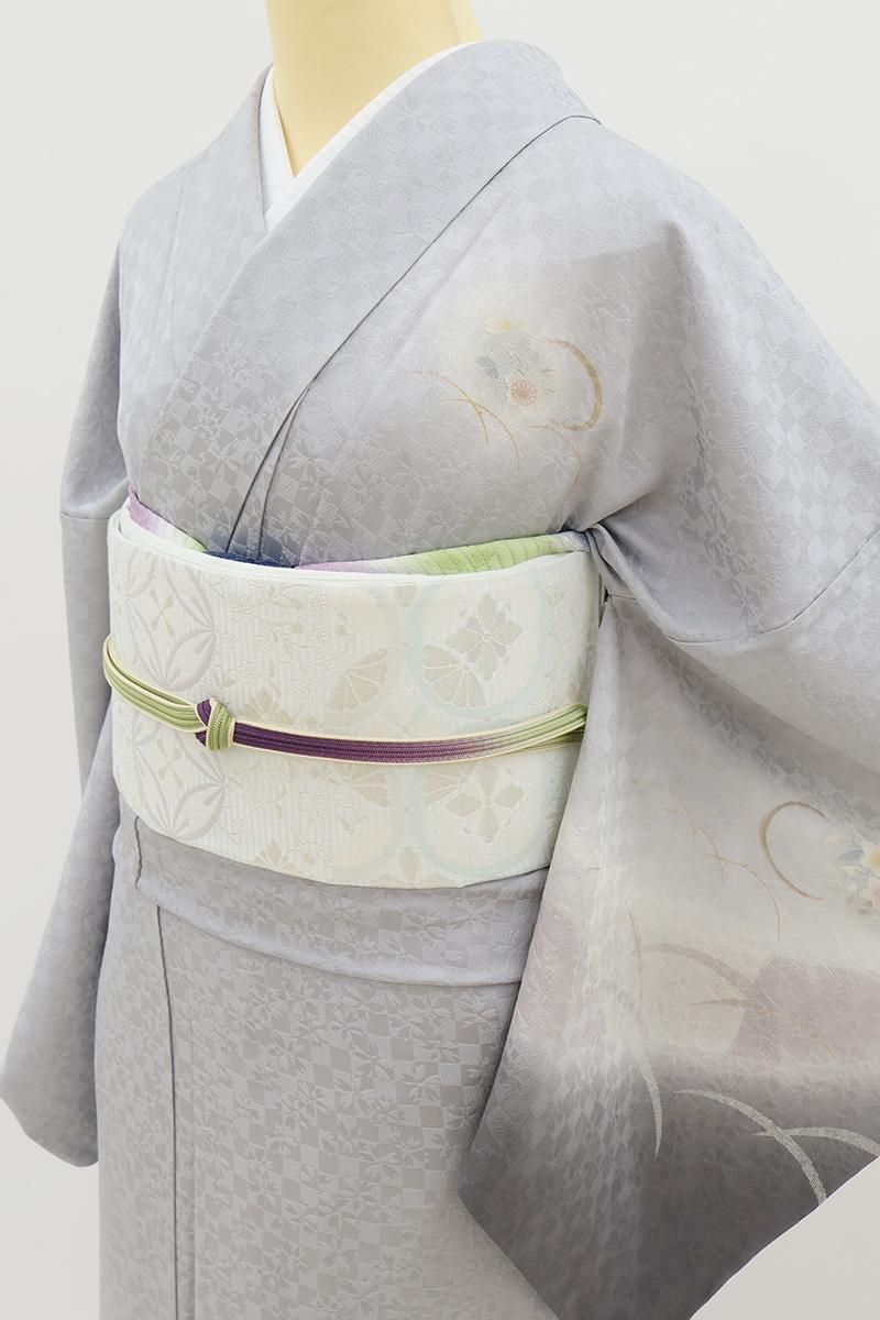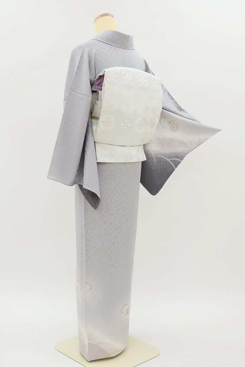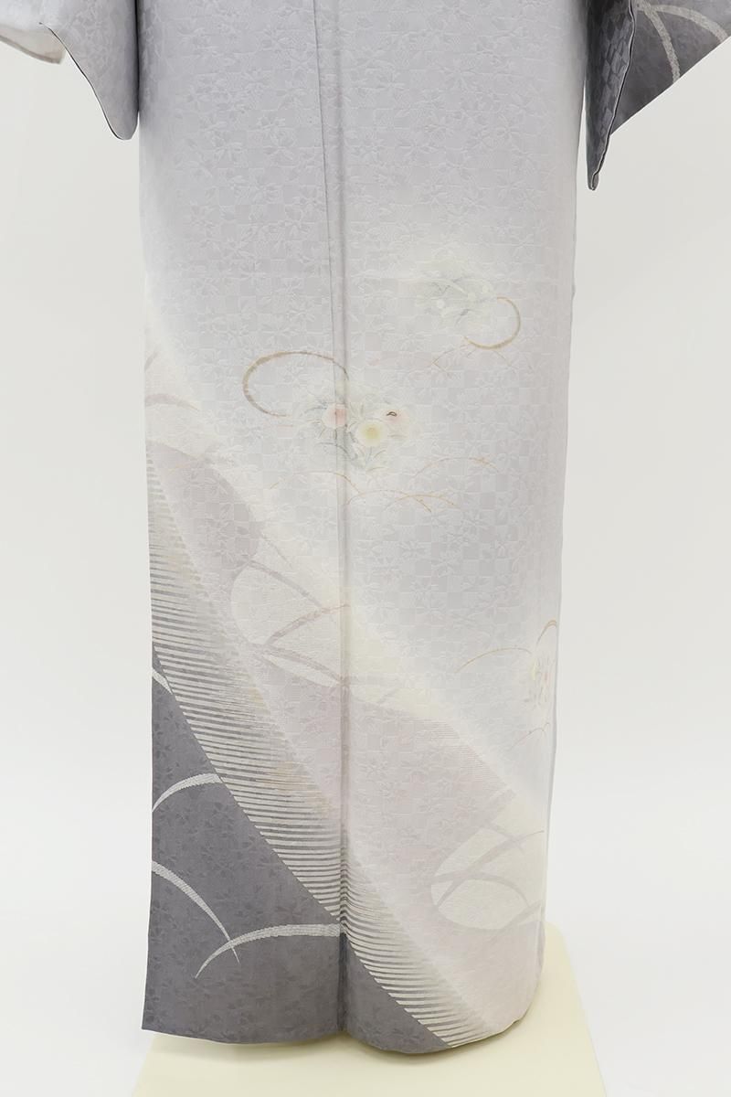 ぐっと色を薄めた灰紫色が近いでしょうか、紫みを帯びたグレー系の地に濃淡で裾暈かしを配し、重ねて秋草の図を描いた単衣の付下げです。光の加減で市松にさくらの地紋が浮かぶ地風に、控えめに置かれた意匠が品良いお品、金彩のきらめきがさりげない気品を添え、装いをしっとりと引き立ててくれることと思います。格高の名古屋帯を合わせて観劇などのお出かけに、袋帯を合わせて少し改まったお席やパーティなど、合わせる帯次第で様々な場面に洗練された装いをお楽しみ頂けることと思います。この機会にいかがでしょうか。