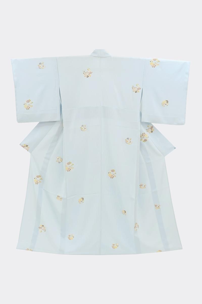 やや色を薄めたわすれなぐさ色が近いでしょうか、淡い水色の地に四季花の丸を配した単衣の小紋です。こちらは京友禅作家・岡本澄生さん作のお品、すっきりと爽やかな色遣いで表現されたモチーフが上品な着姿を演出してくれますね。無地場を多く取った飛び柄ですので、季節の染め帯などは勿論のこと、ドレッシーな雰囲気の帯を合わせて頂けば少し改まったお席などにもお召し頂けることと思います。この機会にいかがでしょうか。