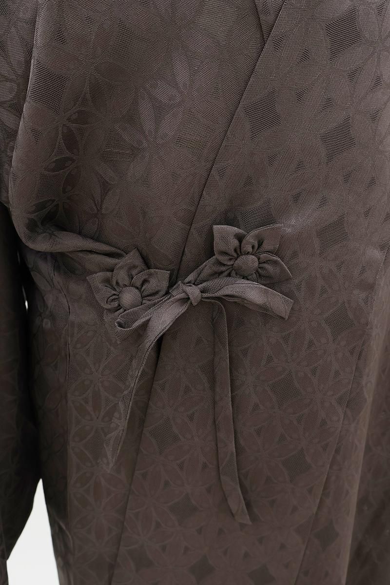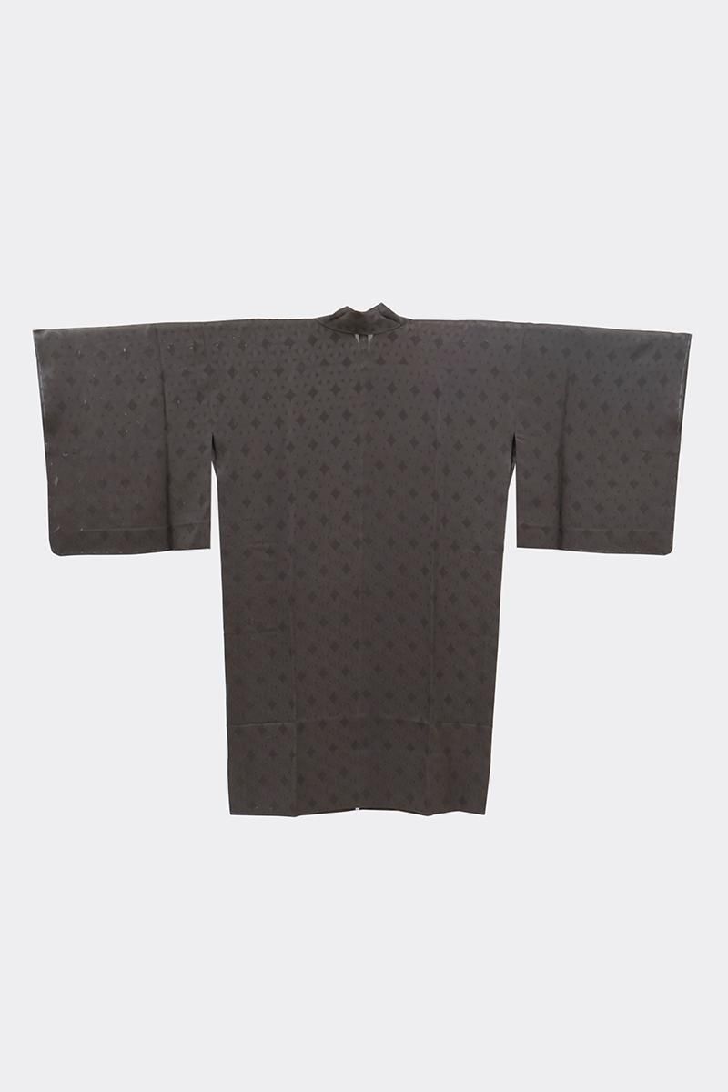 ココア色が近いでしょうか、わずかに紫みを帯びた深いグレー系の地に、花の地紋が浮かぶ紋紗の羽織です。