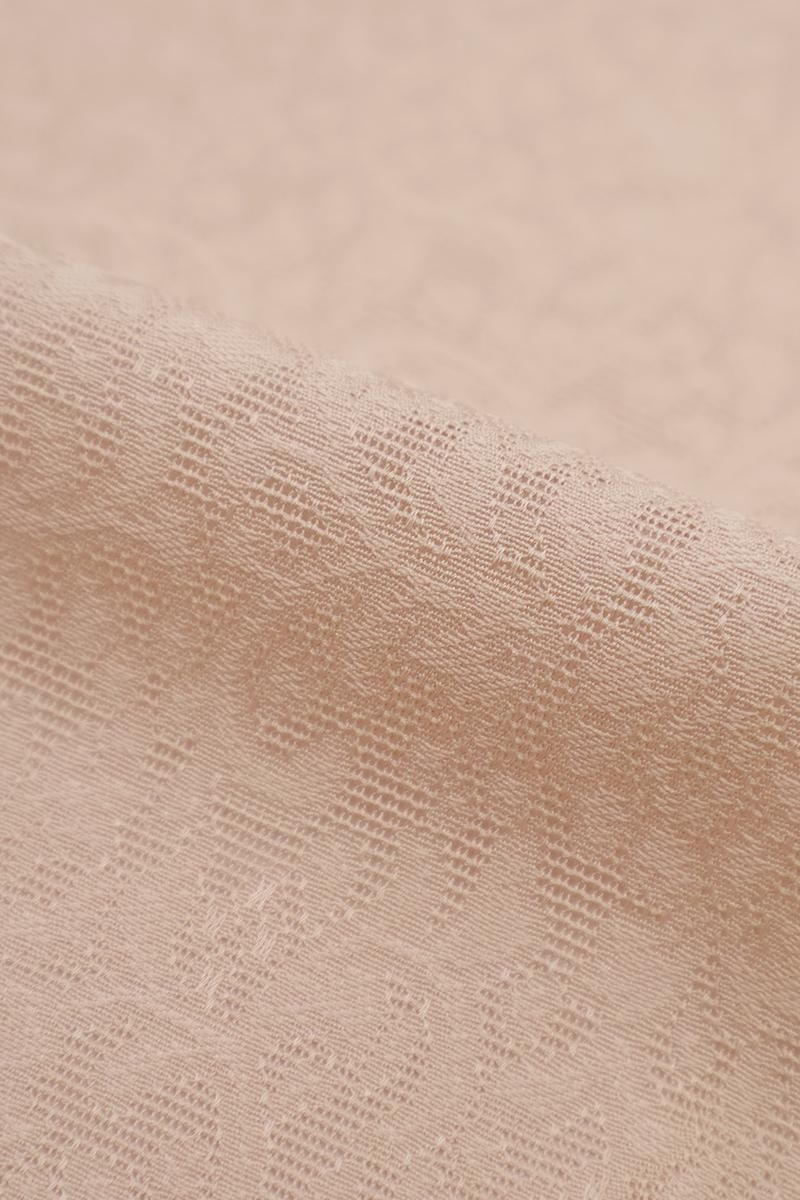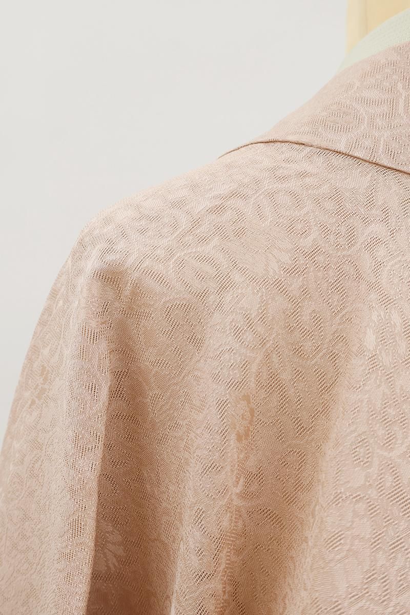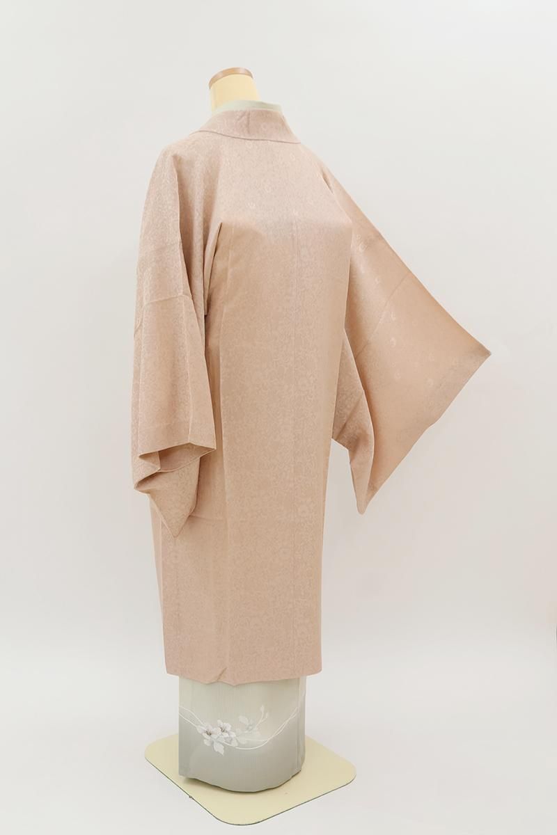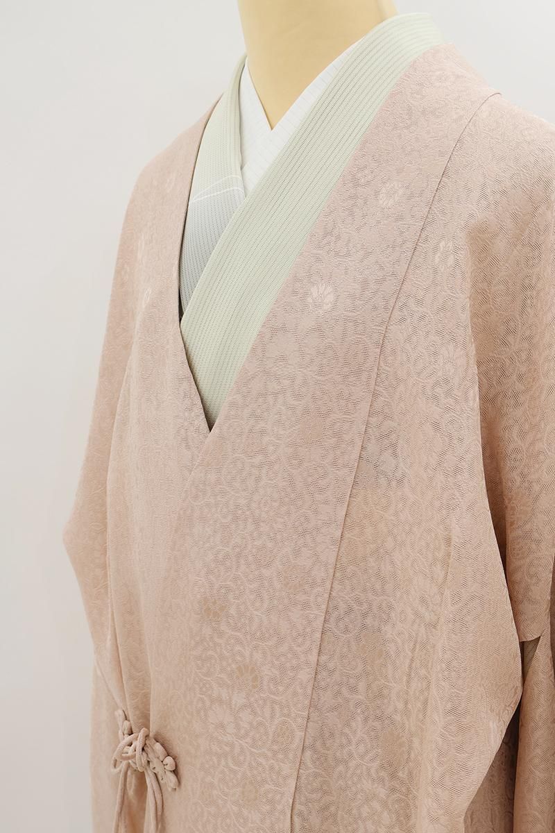やや色を深めたシェルピンク色が近いでしょうか、ほんのり灰みを帯びたピンクベージュ系の紋紗の道中着です。光の加減で浮かび上がる花唐草の地紋が優美な表情を見せるお品、女性らしく優しいお色目は着姿に品良い華やぎを添えて引き立ててくれそうですね。大切なお着物を護るためにも一枚羽織っていただくと何かと安心な薄物のコート、この機会にいかがでしょうか。