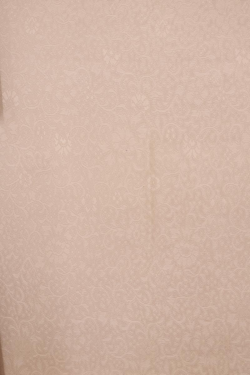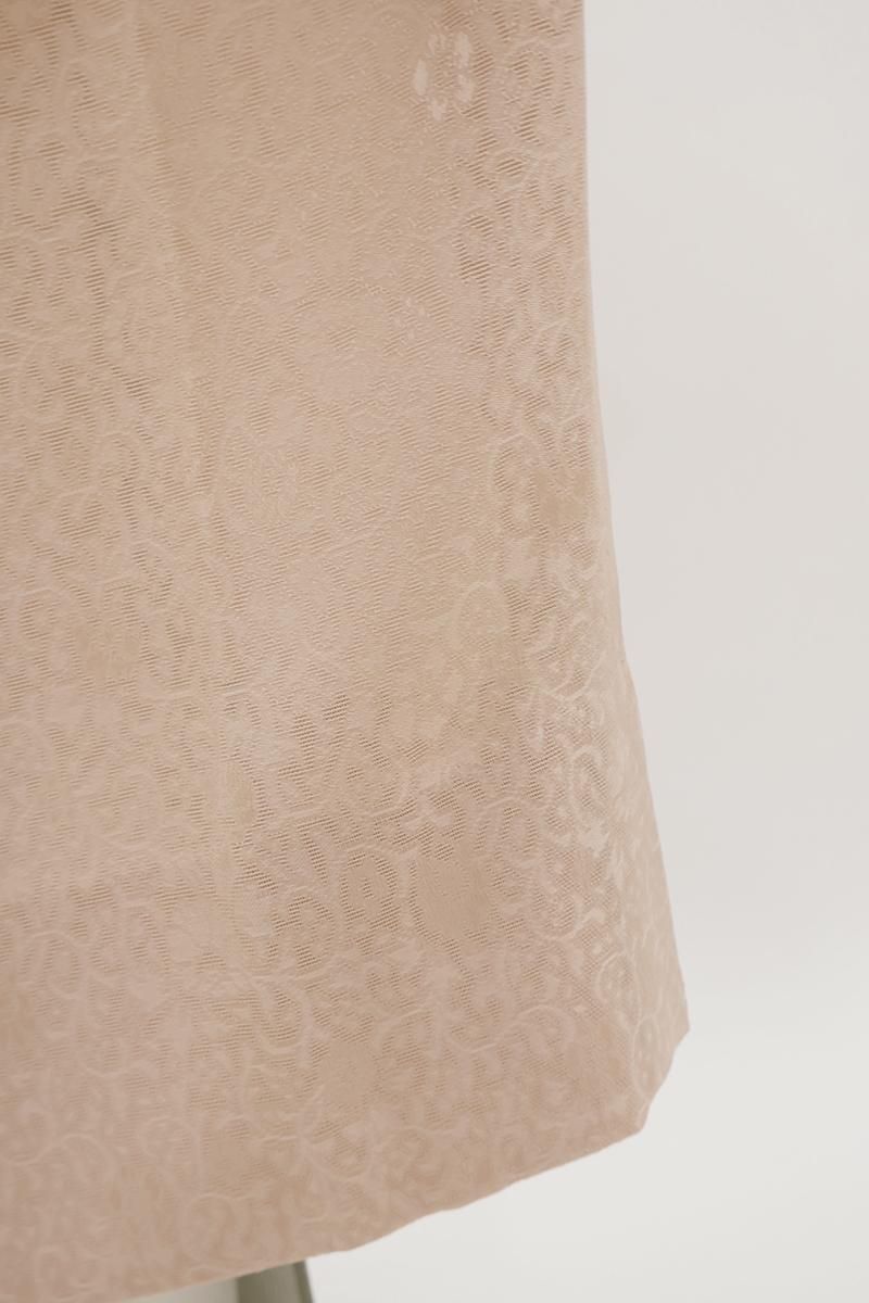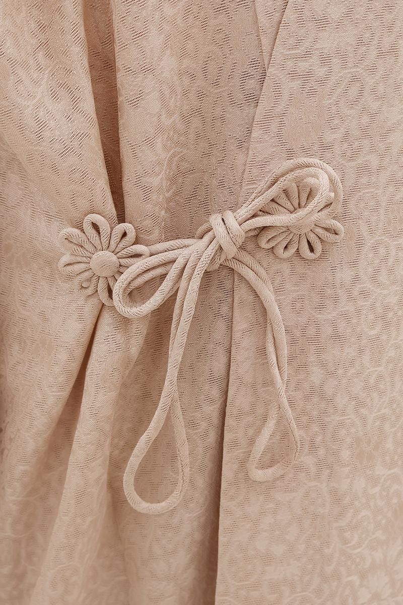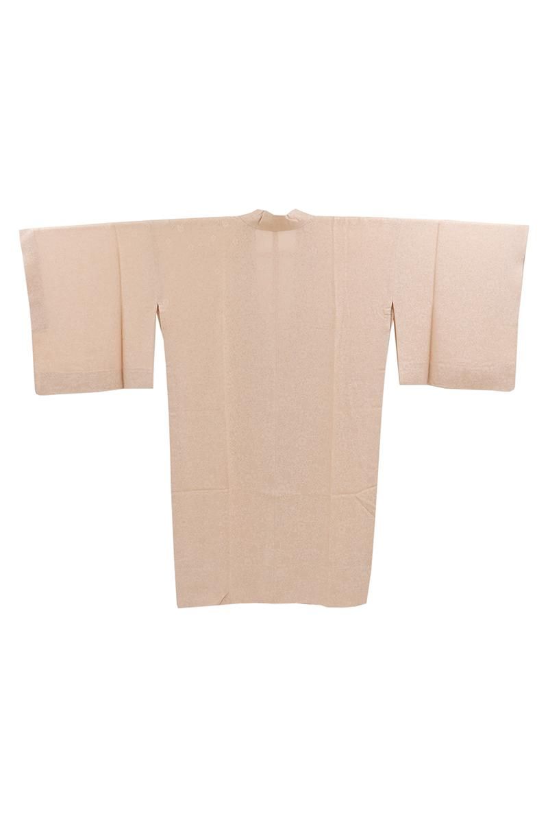 やや色を深めたシェルピンク色が近いでしょうか、ほんのり灰みを帯びたピンクベージュ系の紋紗の道中着です。光の加減で浮かび上がる花唐草の地紋が優美な表情を見せるお品、女性らしく優しいお色目は着姿に品良い華やぎを添えて引き立ててくれそうですね。大切なお着物を護るためにも一枚羽織っていただくと何かと安心な薄物のコート、この機会にいかがでしょうか。
