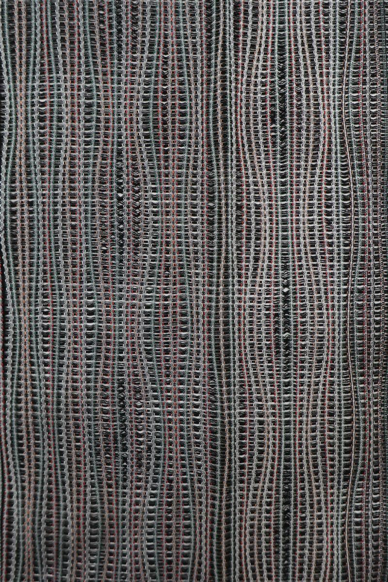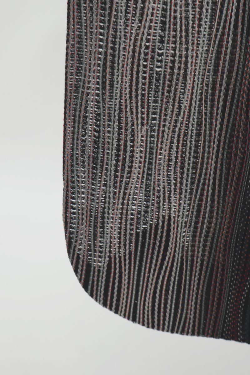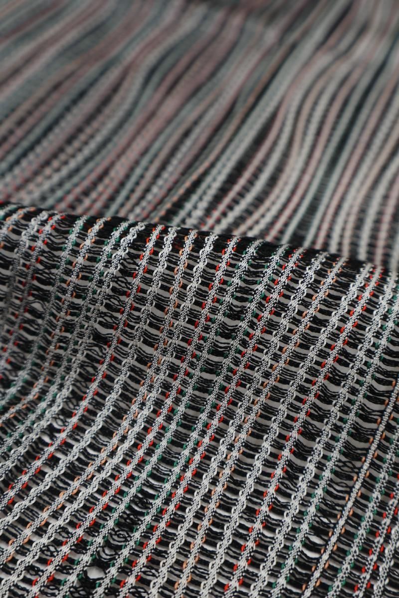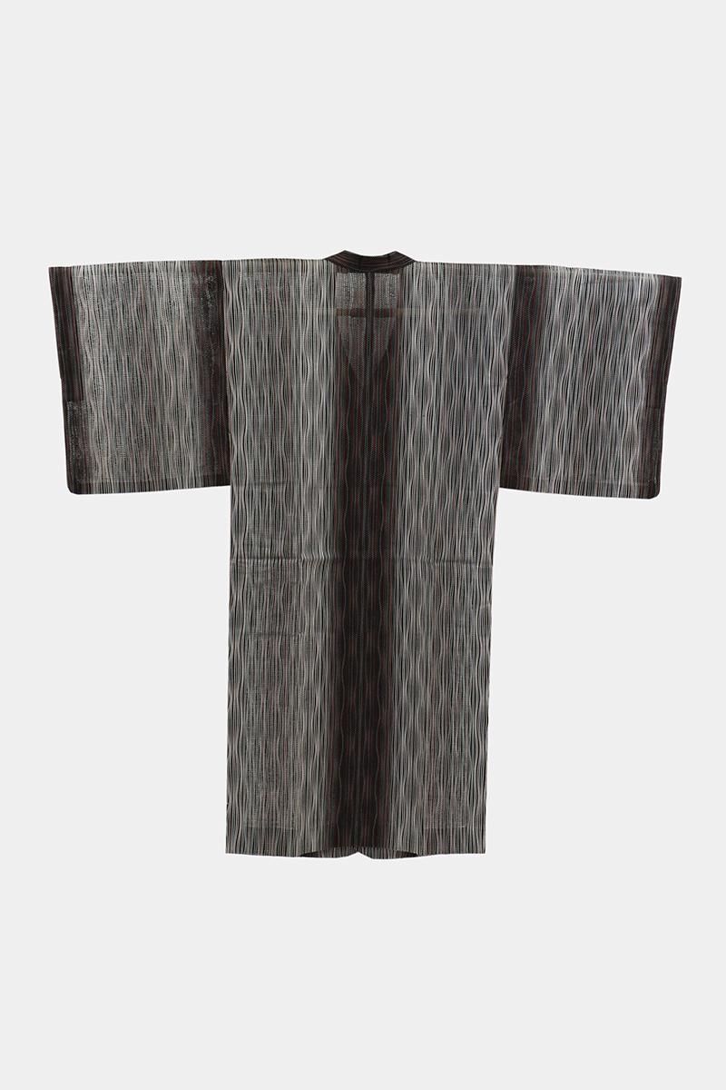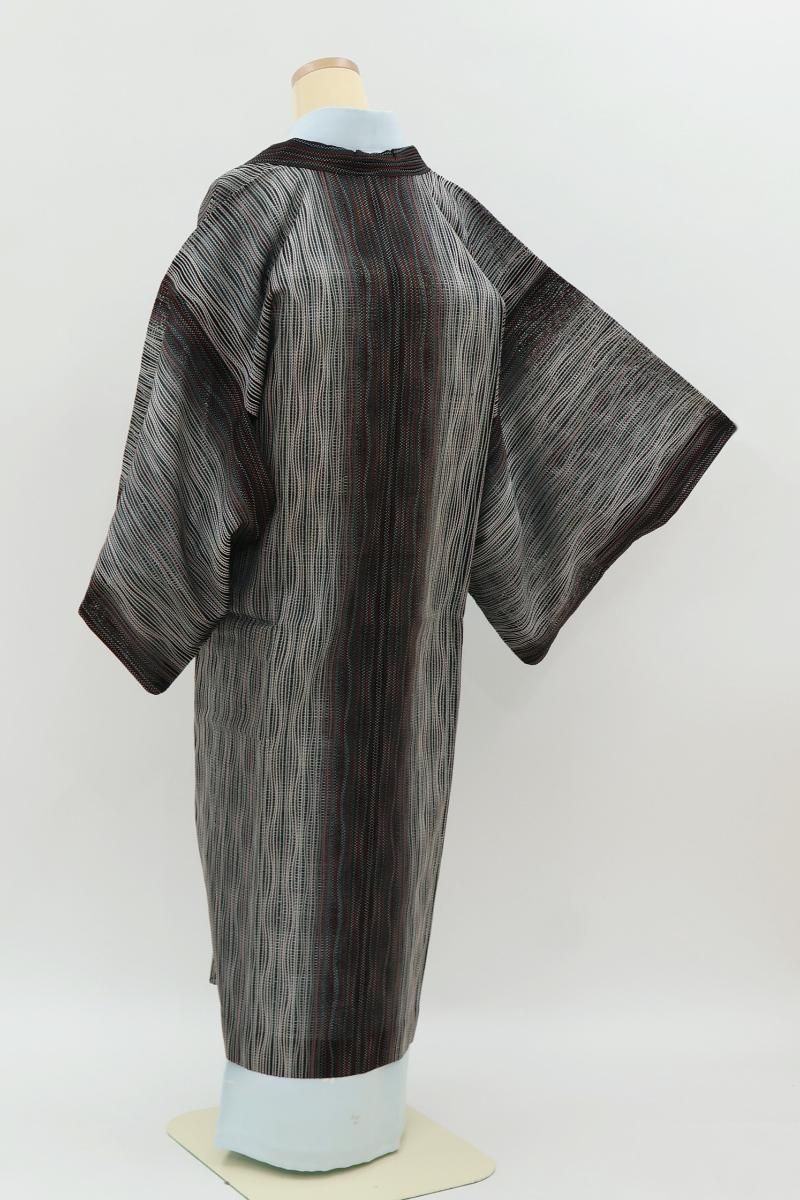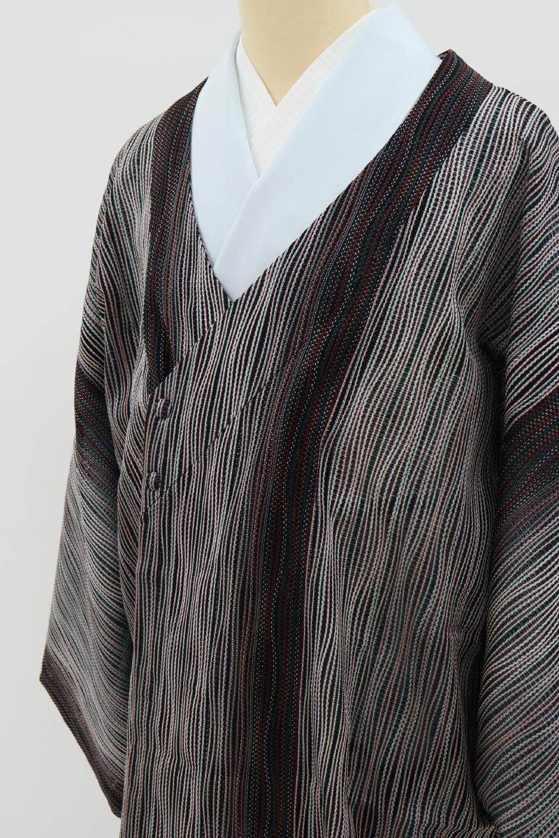 黒色の地に白や赤、緑など多彩な色を効かせてよろけ縞を配した薄物の和装コートです。